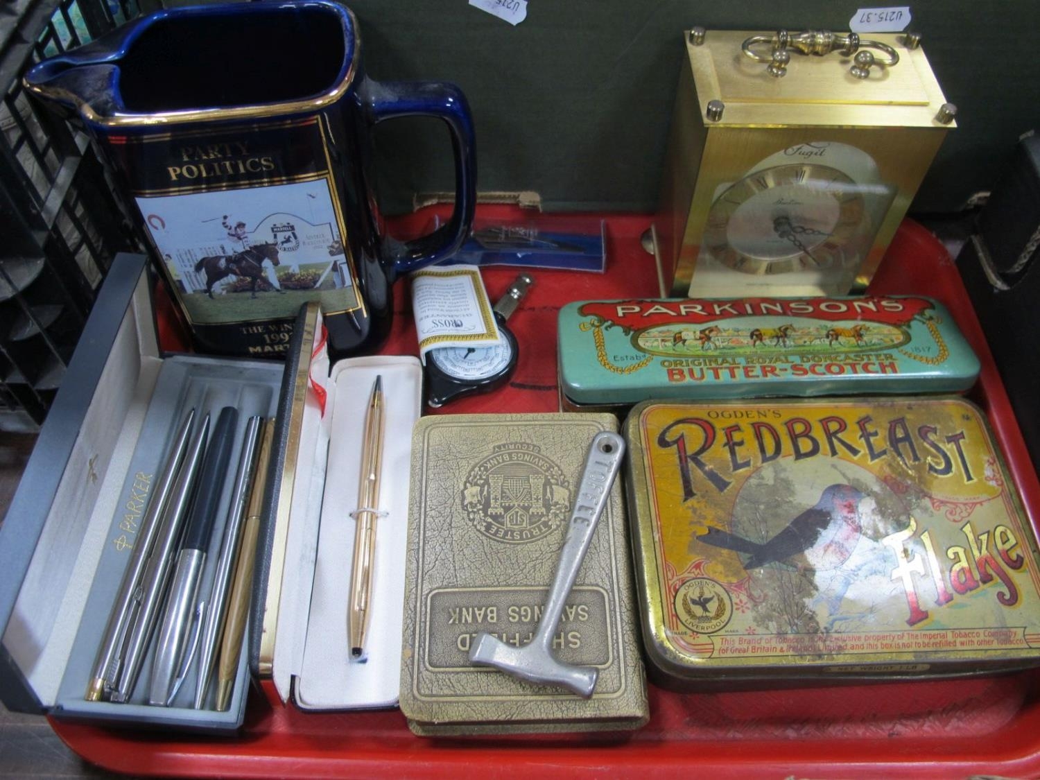 Cross and Parker Pens, tins including Doncaster Racecourse, mantel clock, 1992 Grand National jug.