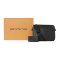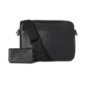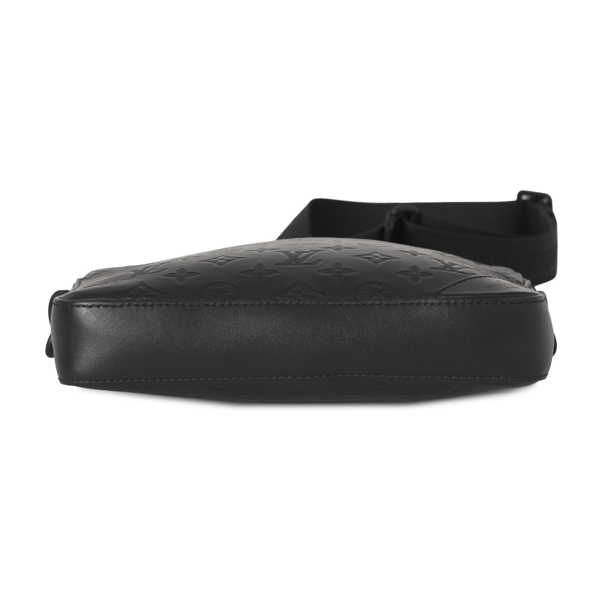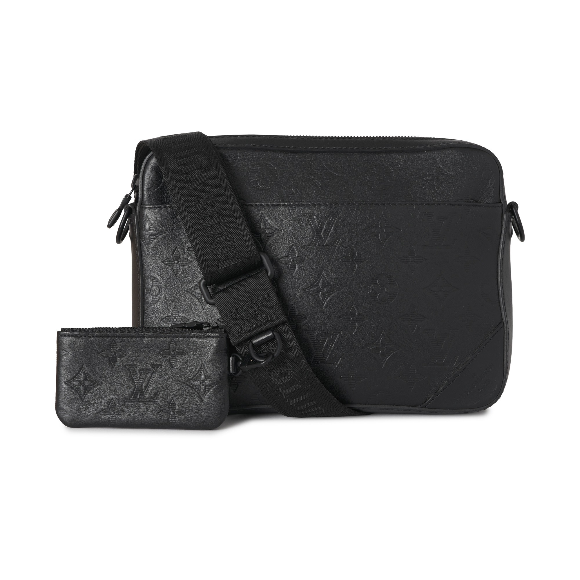Louis Vuitton, a monogram shadow Duo messenger bag, crafted from black monogram embossed calf leather, with a front slip pocket, optional crossbody strap with removable pouch, top zip fastening and black canvas lining, measuring 4 by 18 by 25cm, with maker's dust bag and box