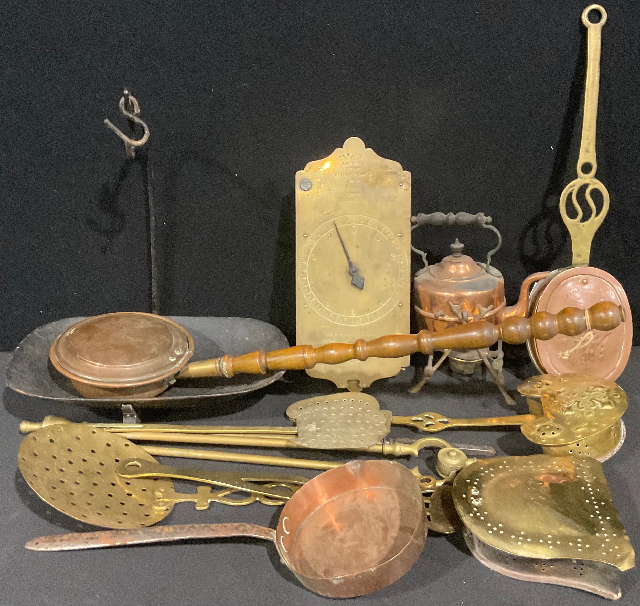 Brass and Copper - a Salter's No. 60 Trade Spring Balance; 19th century chestnut roasters; a brass sifter; a copper long handled pan; etc, qty
