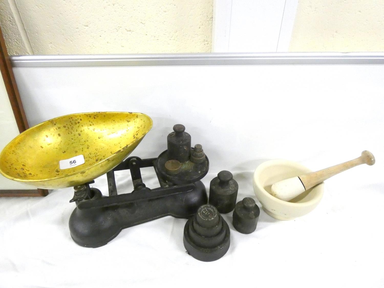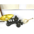 Set of kitchen scales, weights and a pestle and mortar.