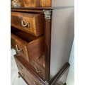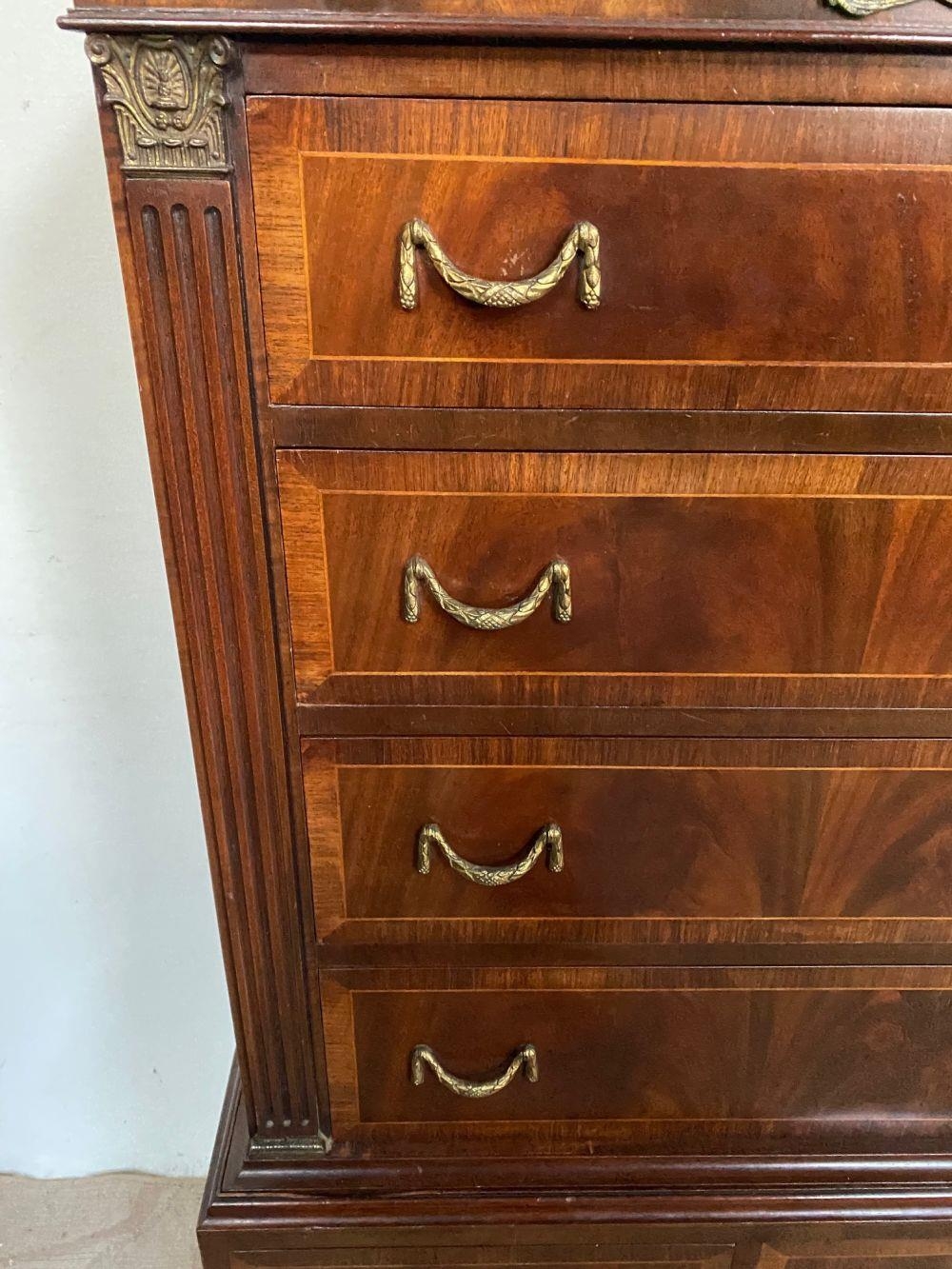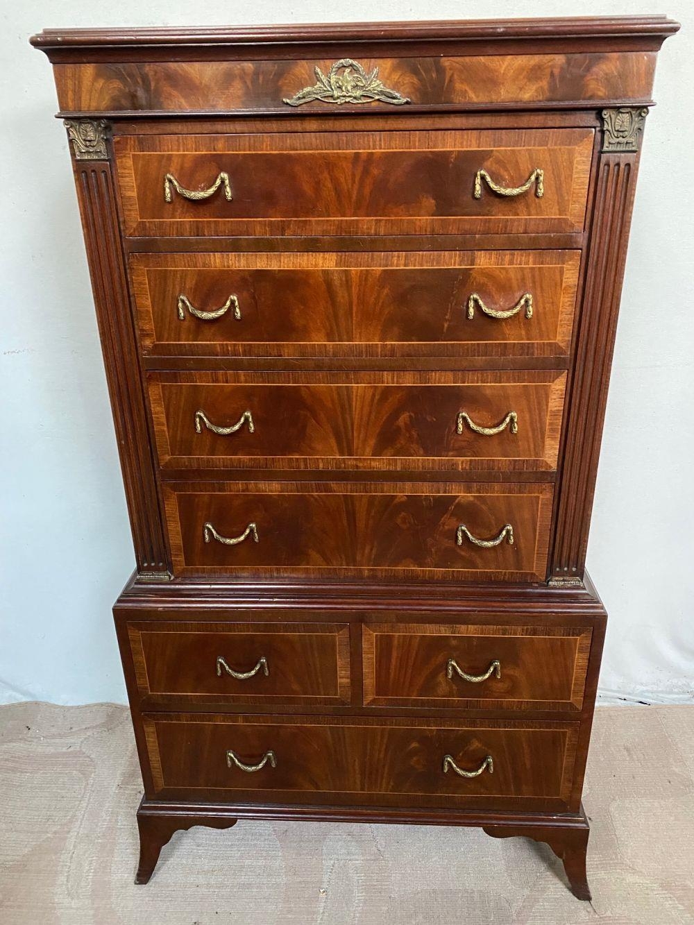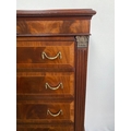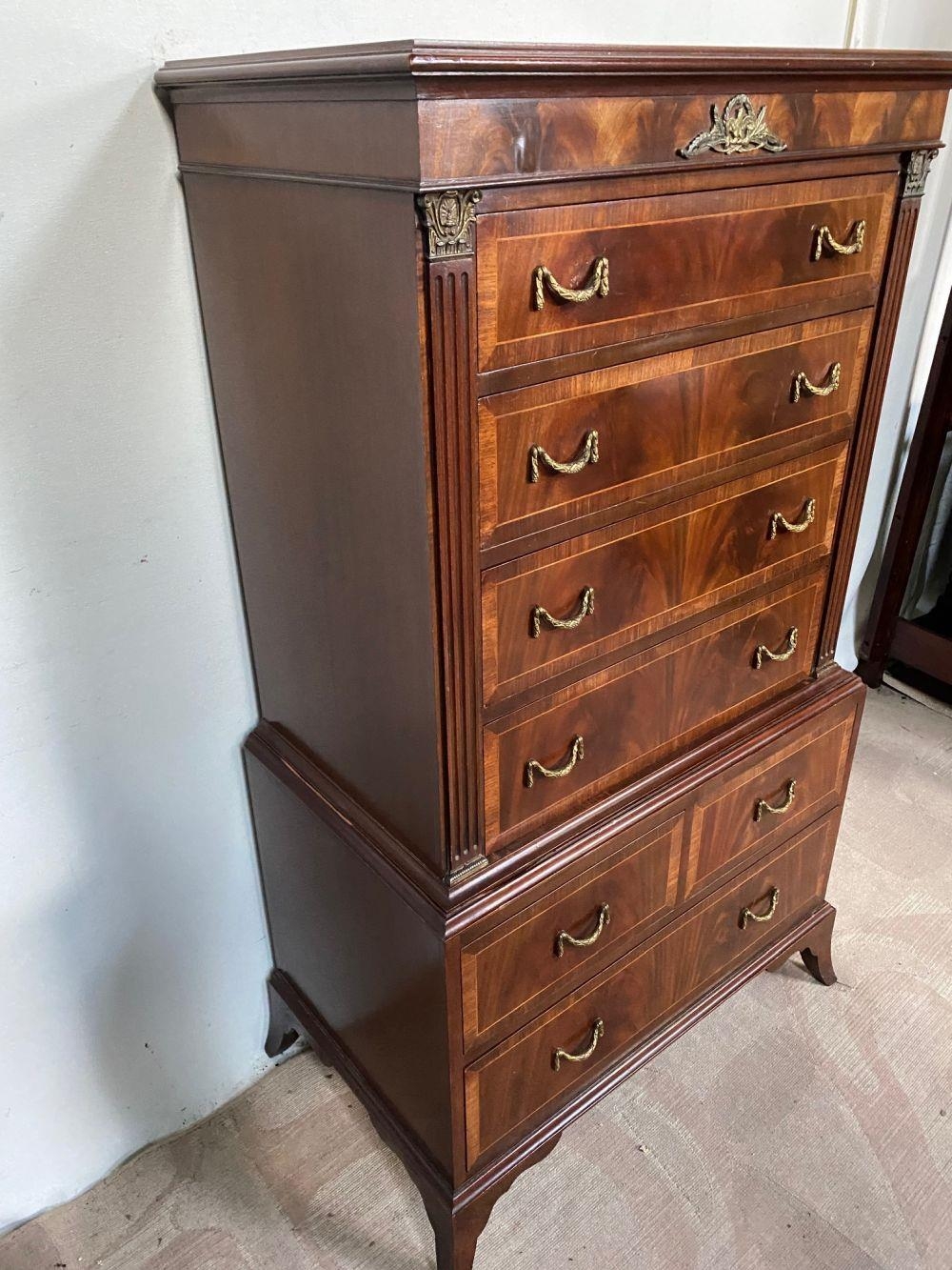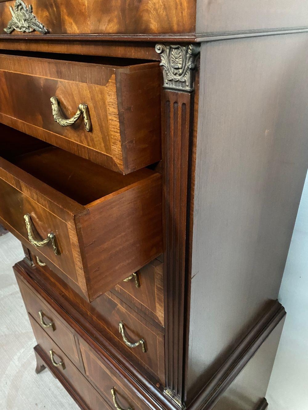 A MAHOGANY EMPIRE STYLE CHEST ON CHEST, with ormolu mount to frieze above four crossbanded drawers over three, with Corinthian column style supports with ormolu mounts, all supported by bracket feet. Dimensions: 77cm x 45cm x 138cm high approx