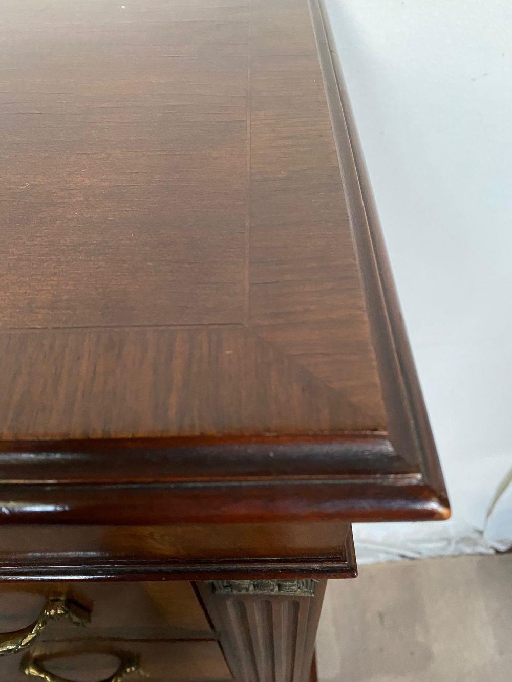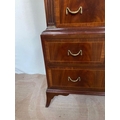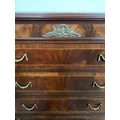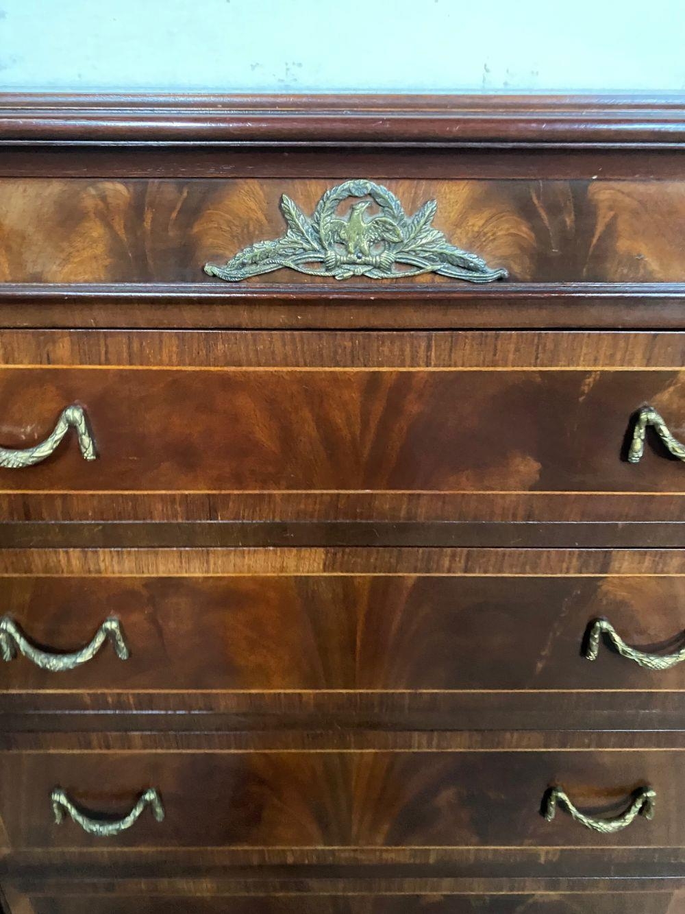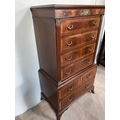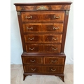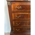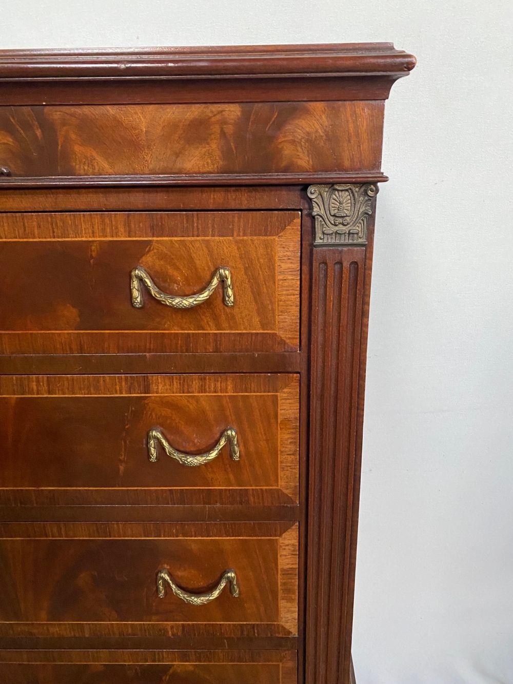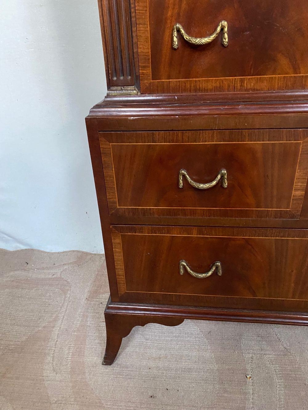 A MAHOGANY EMPIRE STYLE CHEST ON CHEST, with ormolu mount to frieze above four crossbanded drawers over three, with Corinthian column style supports with ormolu mounts, all supported by bracket feet. Dimensions: 77cm x 45cm x 138cm high approx
