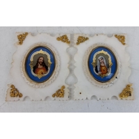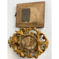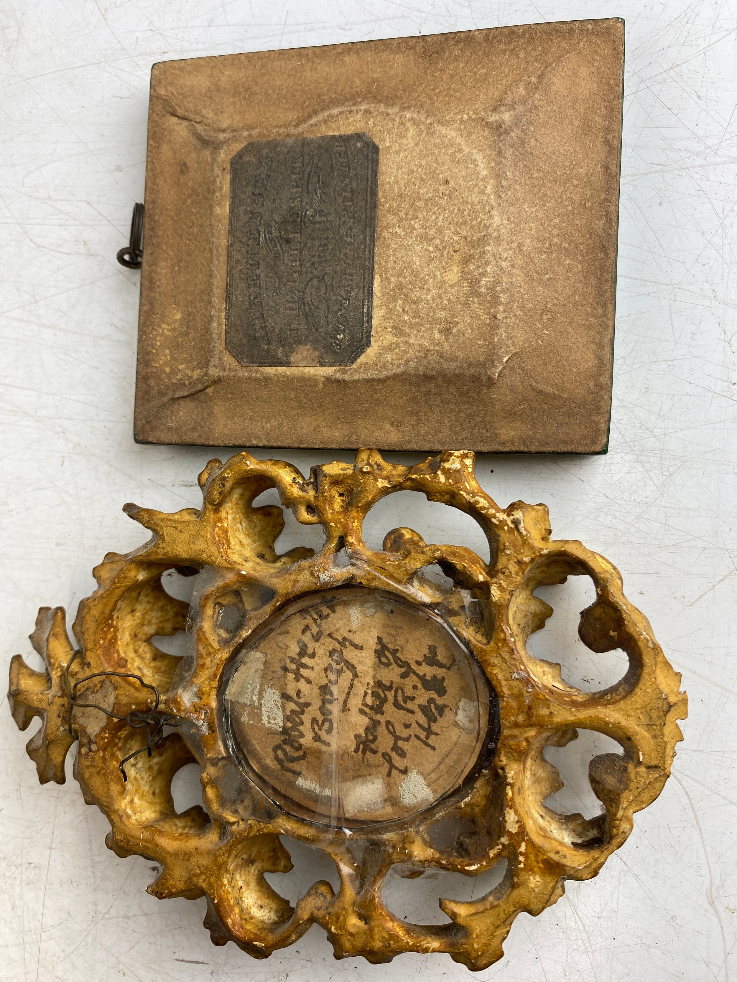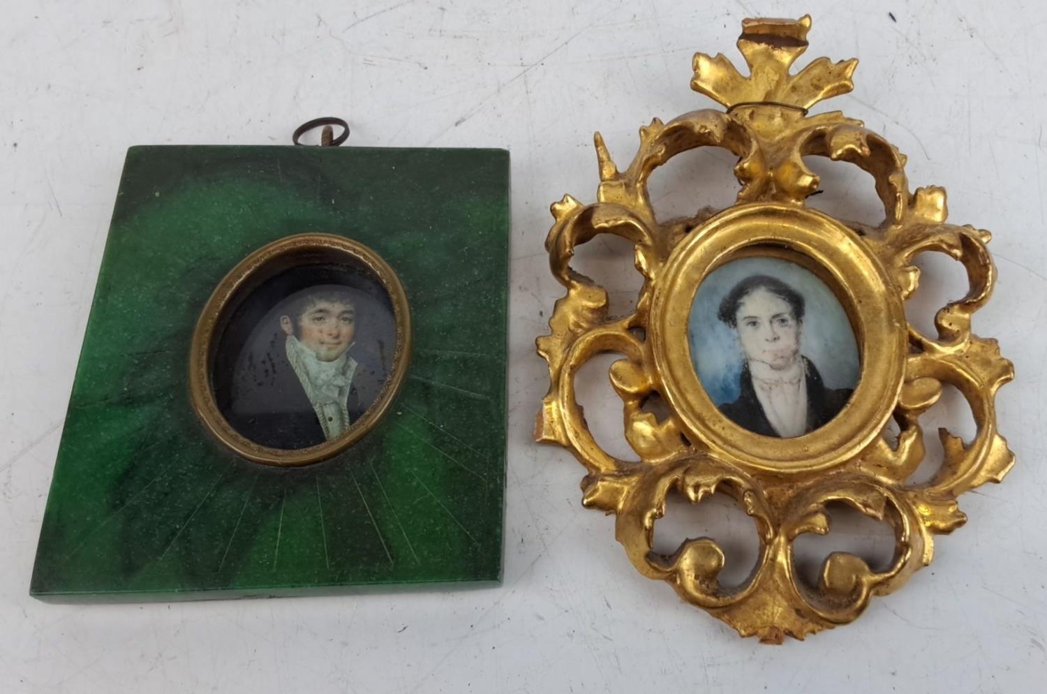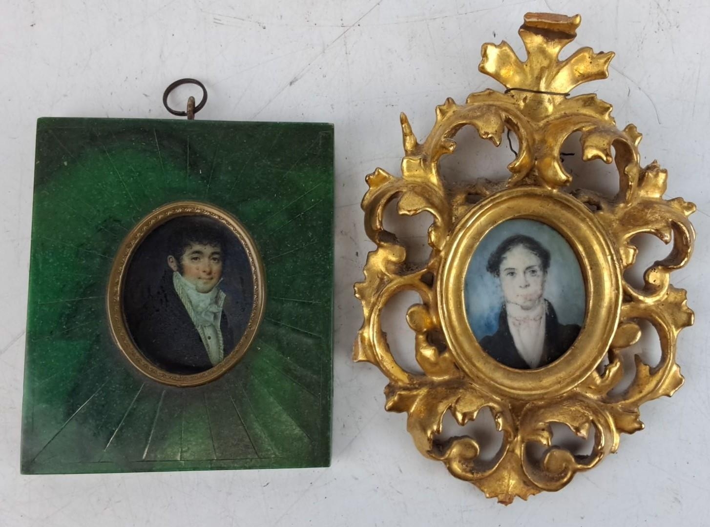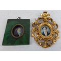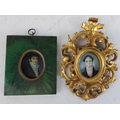 Two antique miniature portrait paintings in ornate frames. One frame is green with gold accents, the other is an intricate gold design inscribed on reserve Robert Hezlett, father of Col. R Y Hezlett, measuring 8.5cm x 10cm green frame and 14cm x 9.5cm gold frame