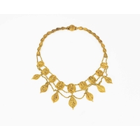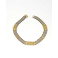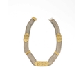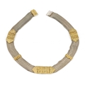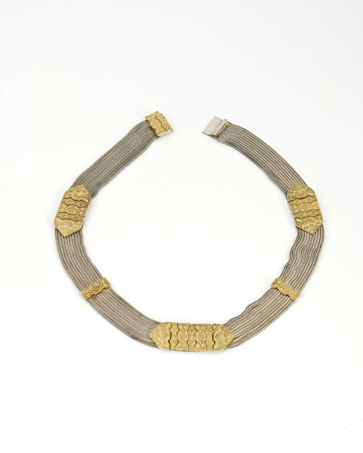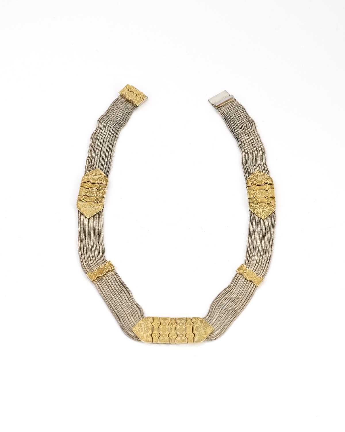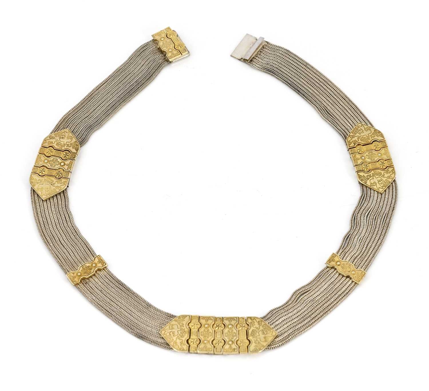 A Middle Eastern silver and parcel gilt choker necklace, nine chain mesh strands united by tooled gilt bars, engraved with birds and Byzantine type motifs, 42cm long, 97g