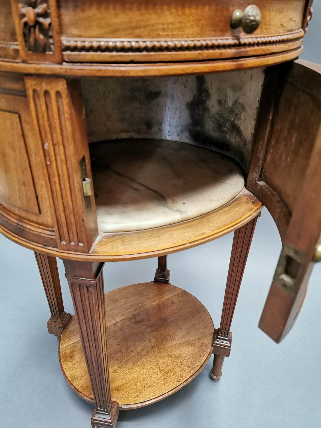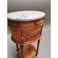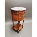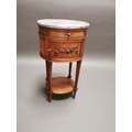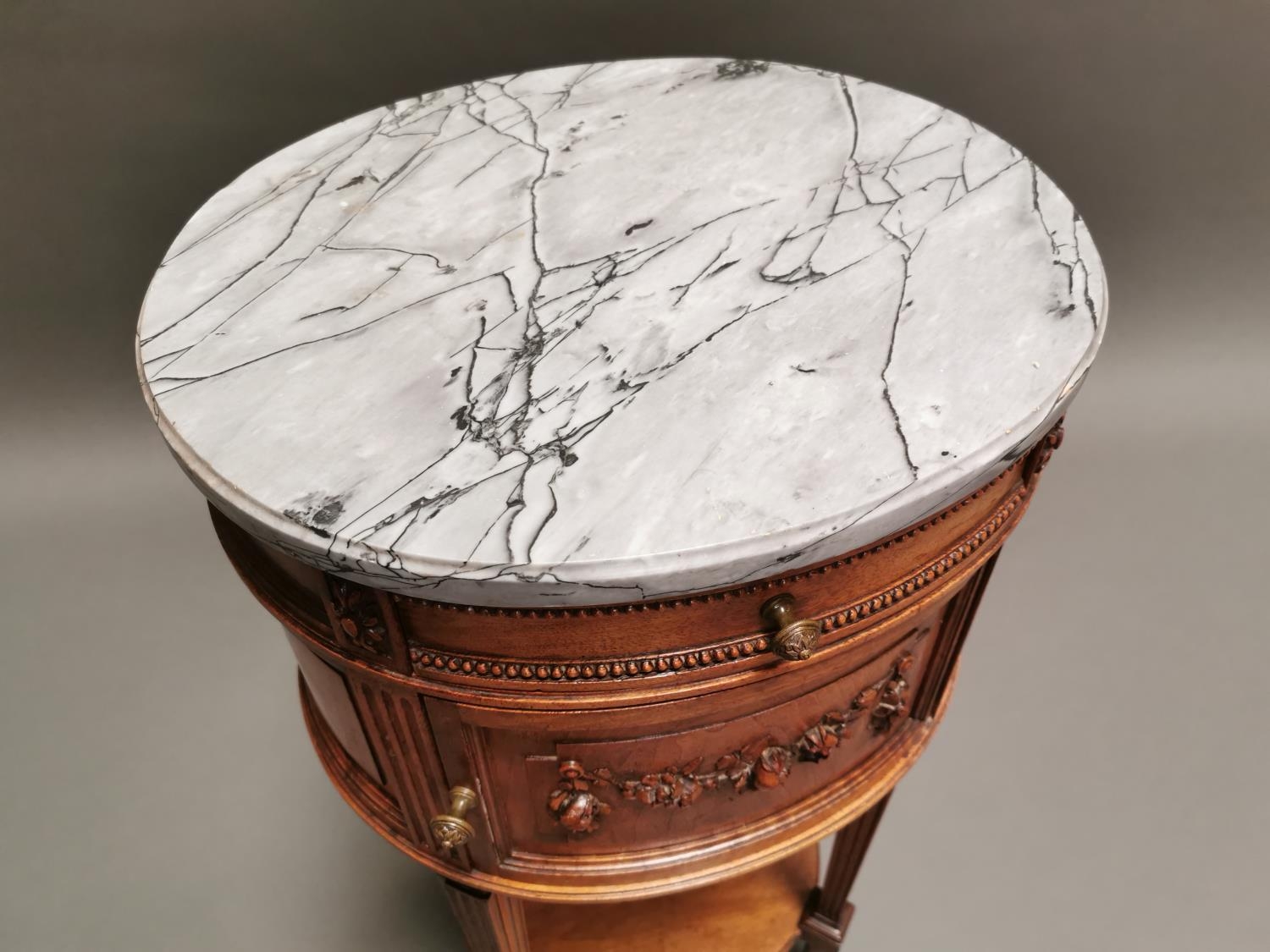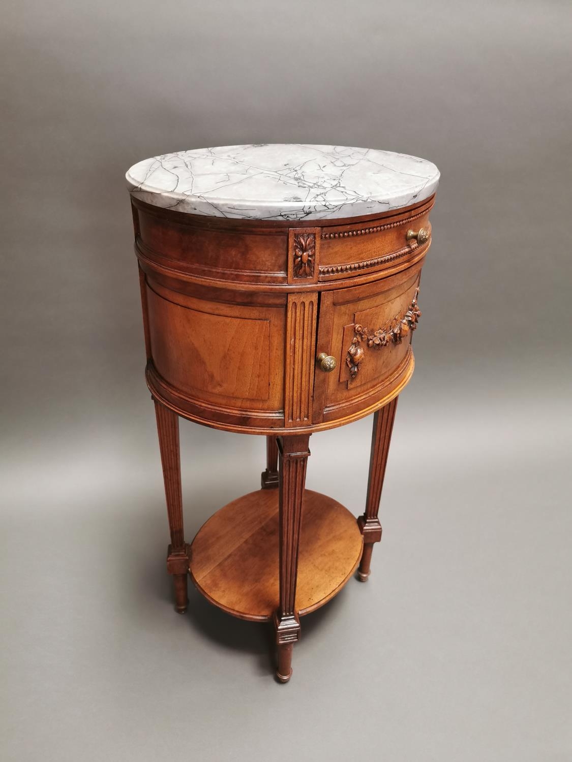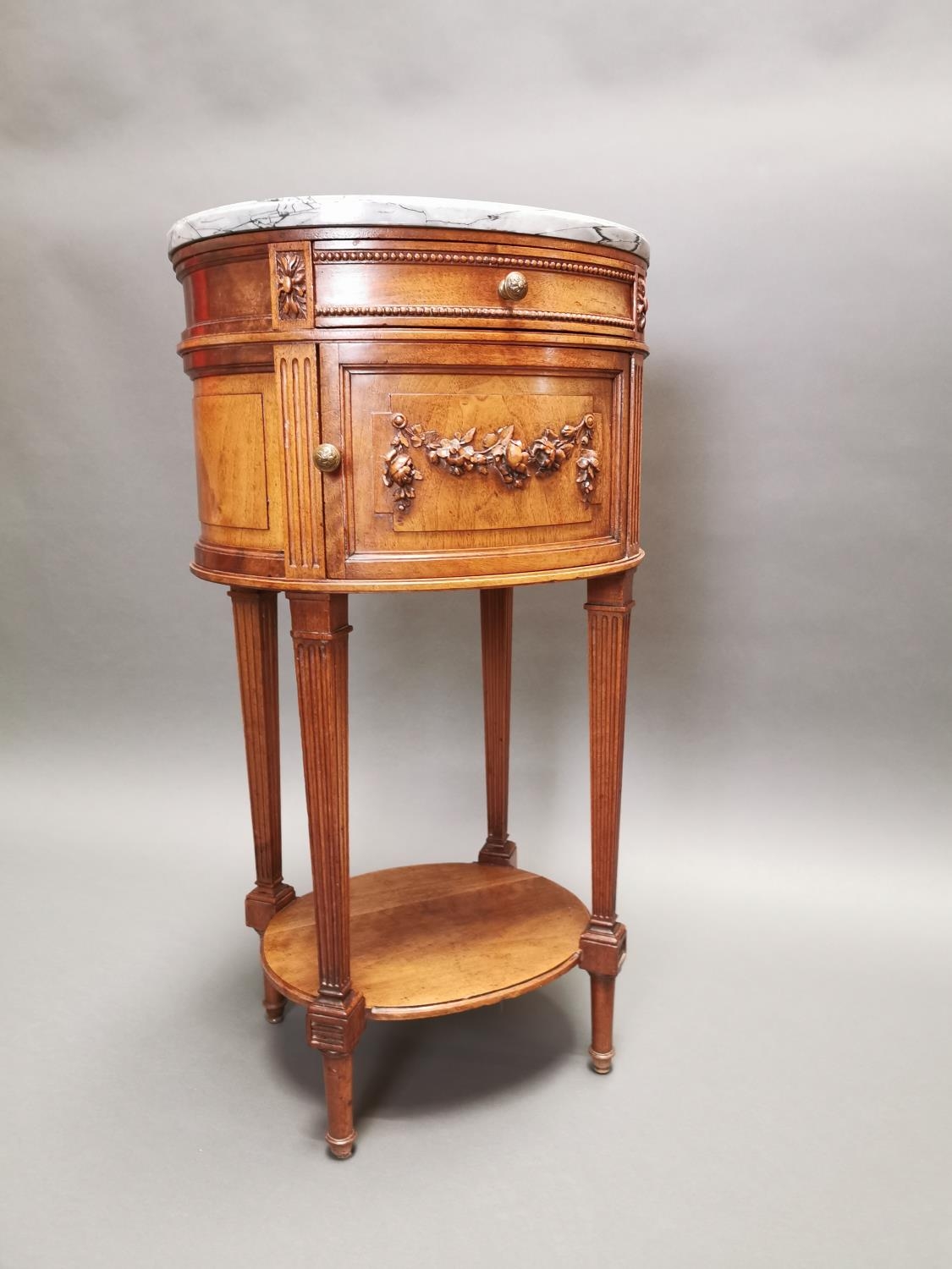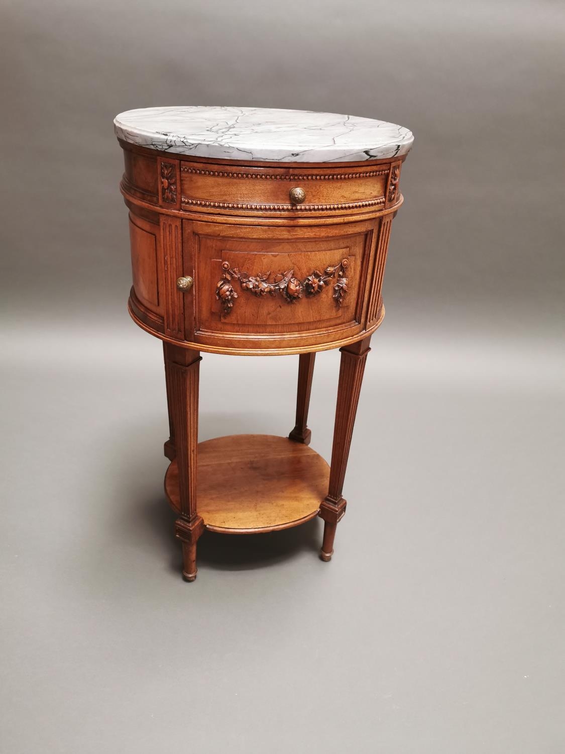Good quality 19th C. walnut oval marble top locker on square tapered legs {82 cm H x 44 cm W x 40 cm D}.