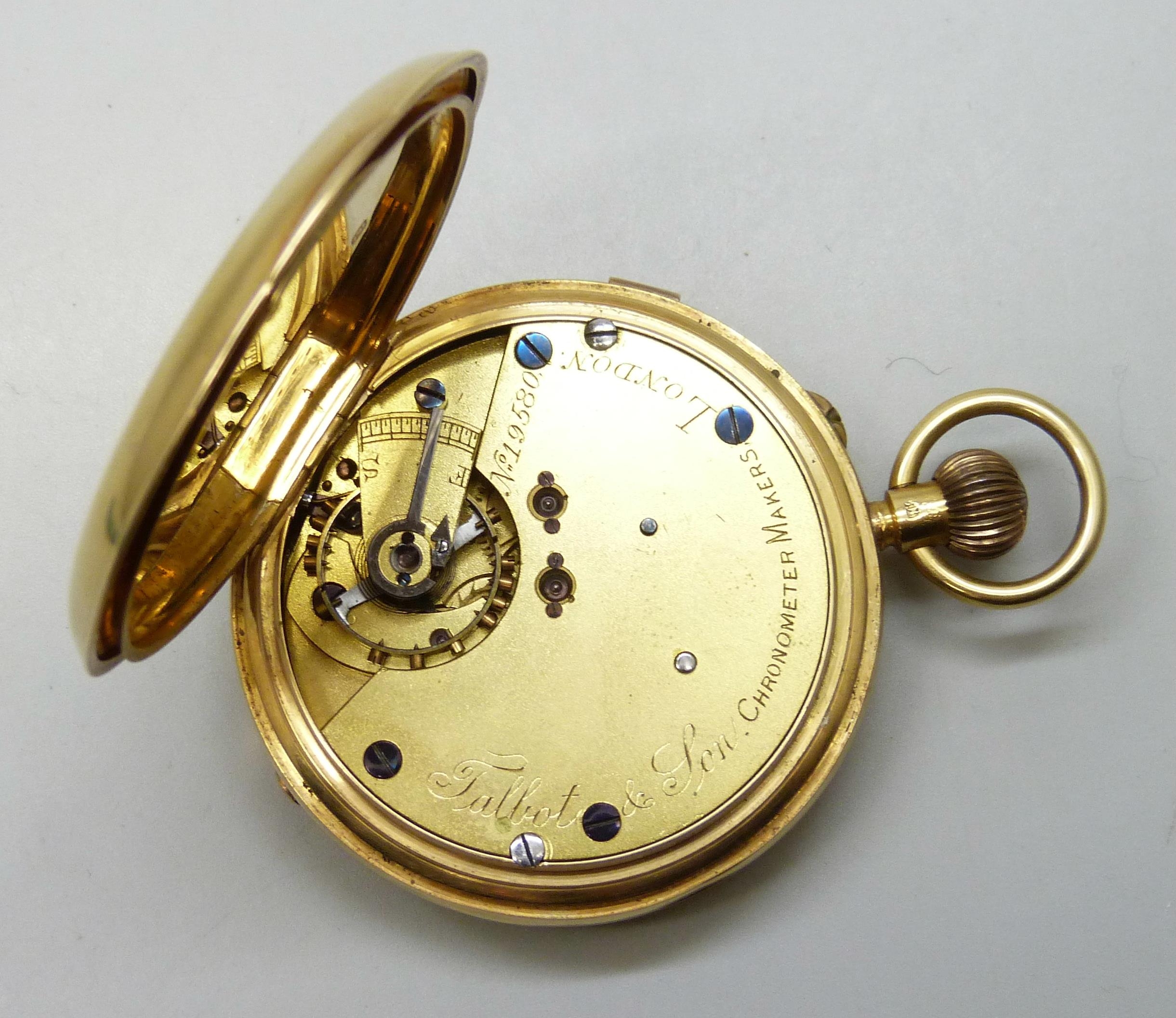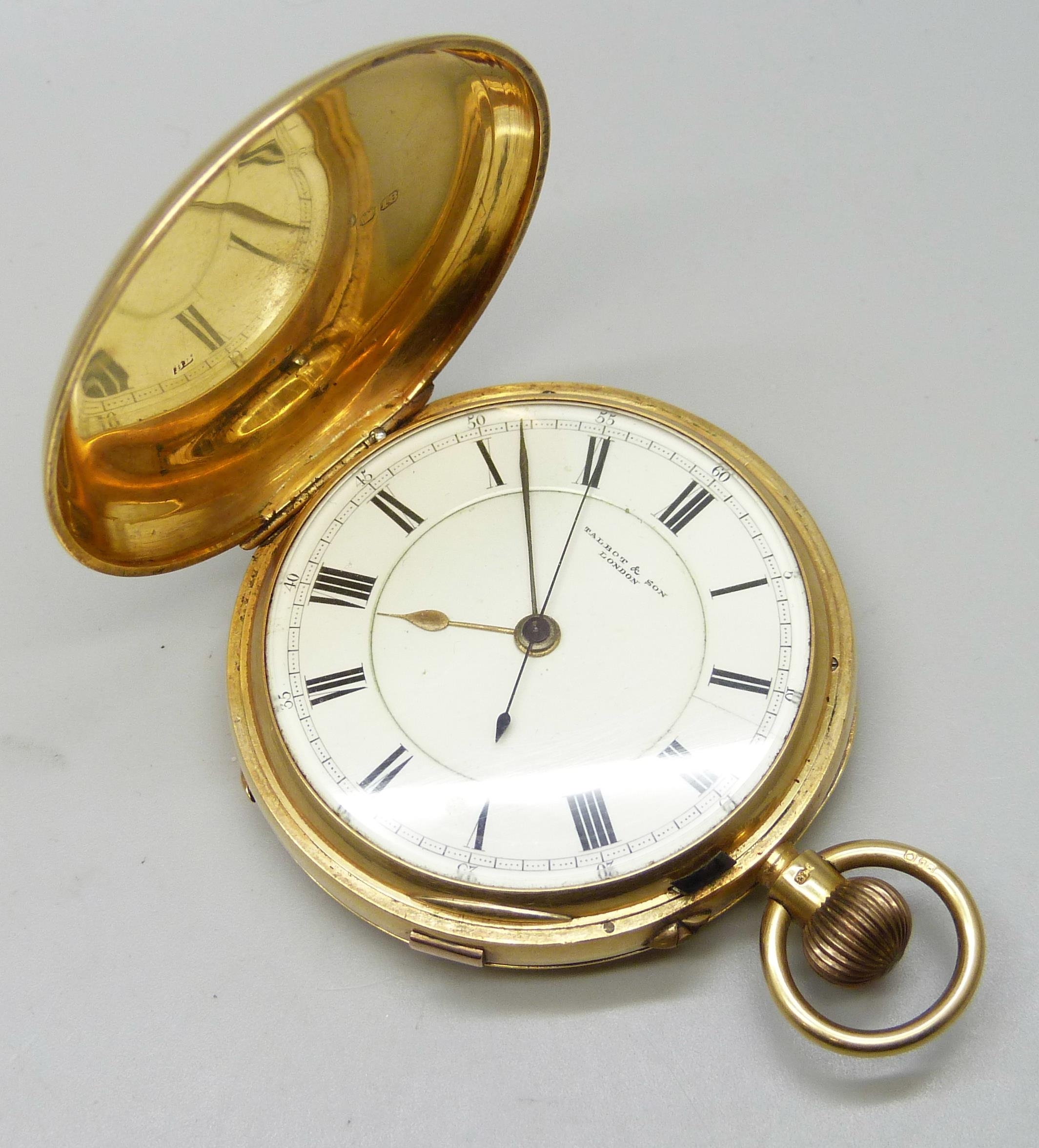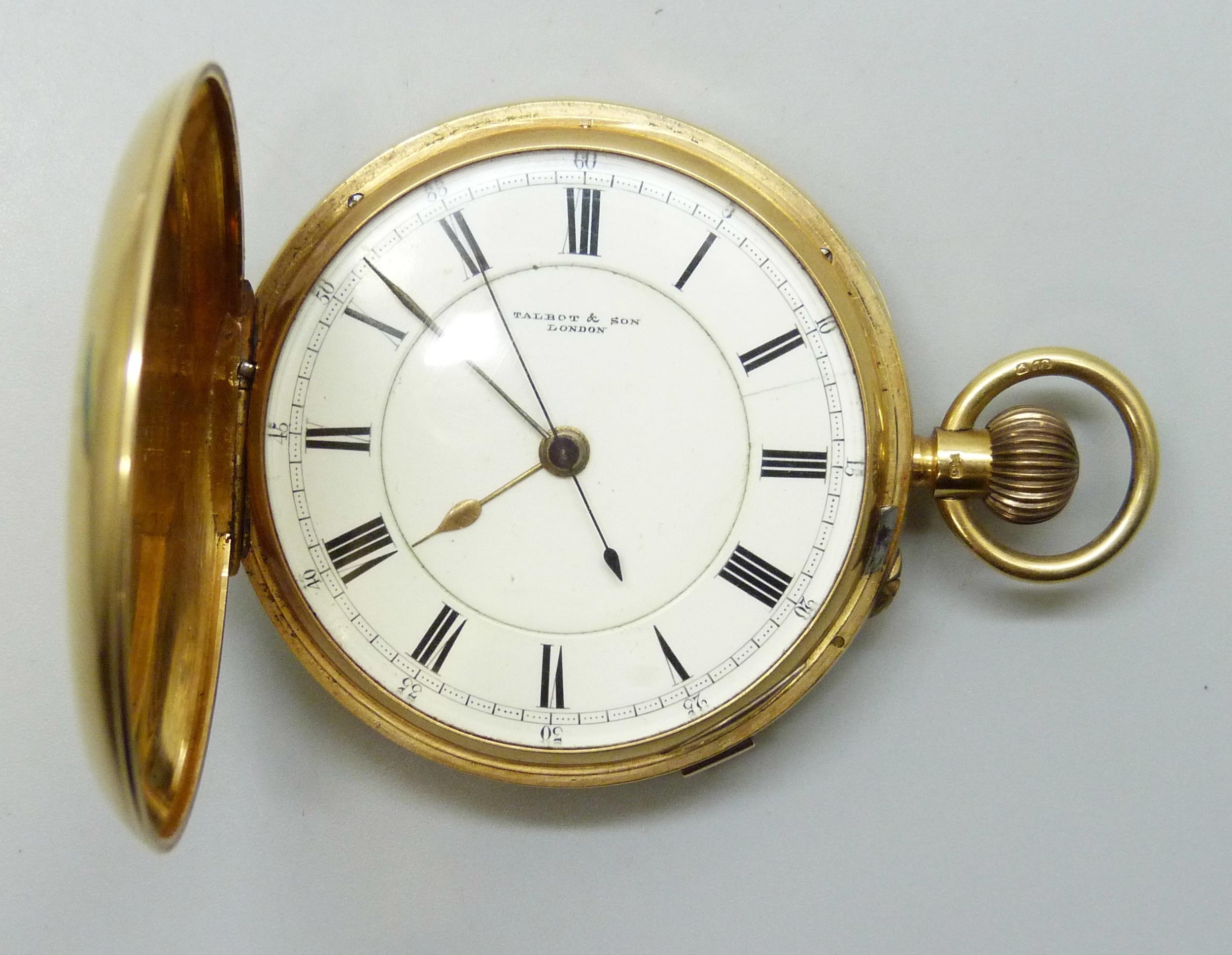 An 18ct gold cased full hunter pocket watch, the dial marked Talbot & Son, London, hallmarked Chester, 1907, 134.3g