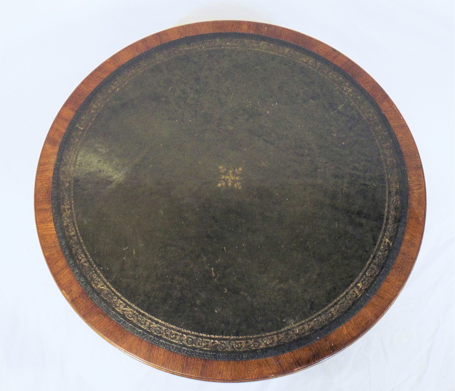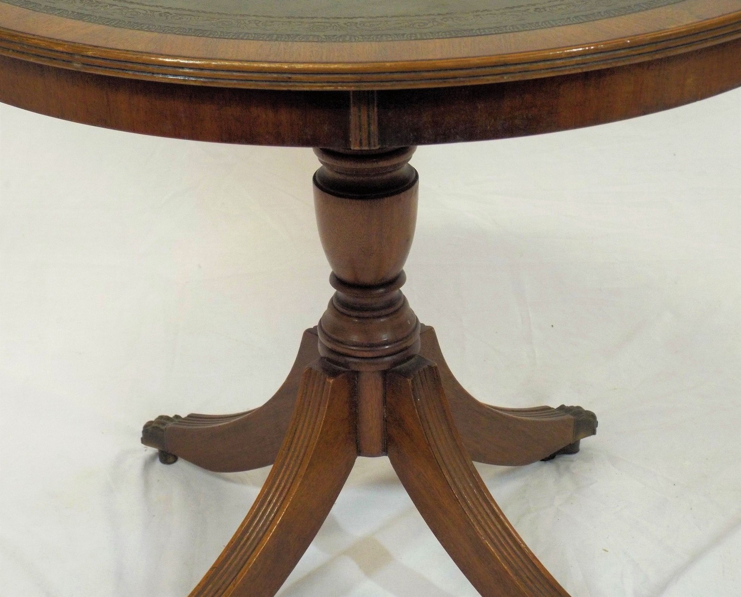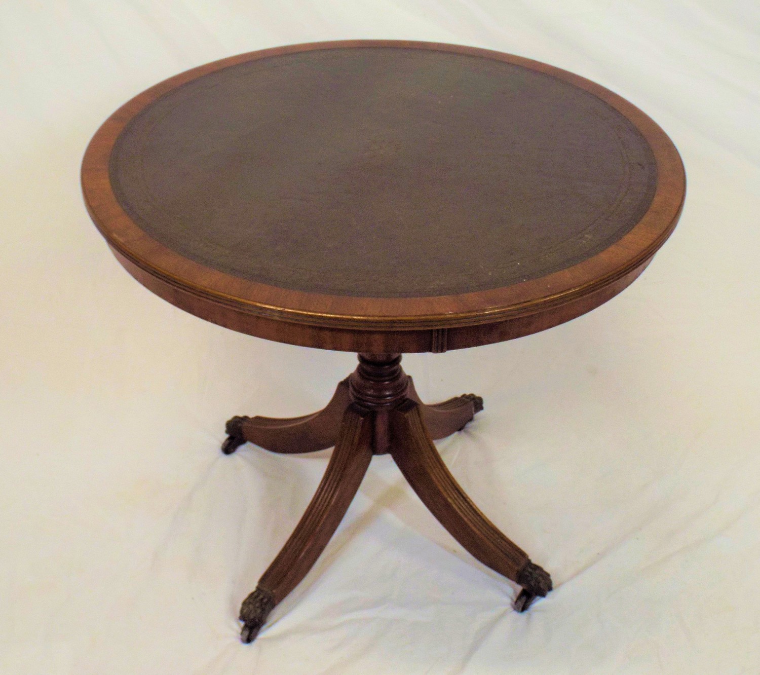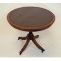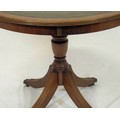 Edwardian design round occasional or coffee table with vase shaped column, on reeded quadrapod with brass claw feet