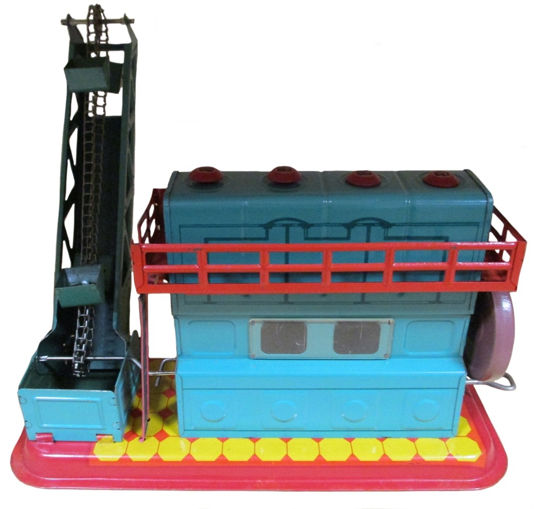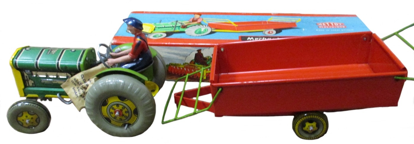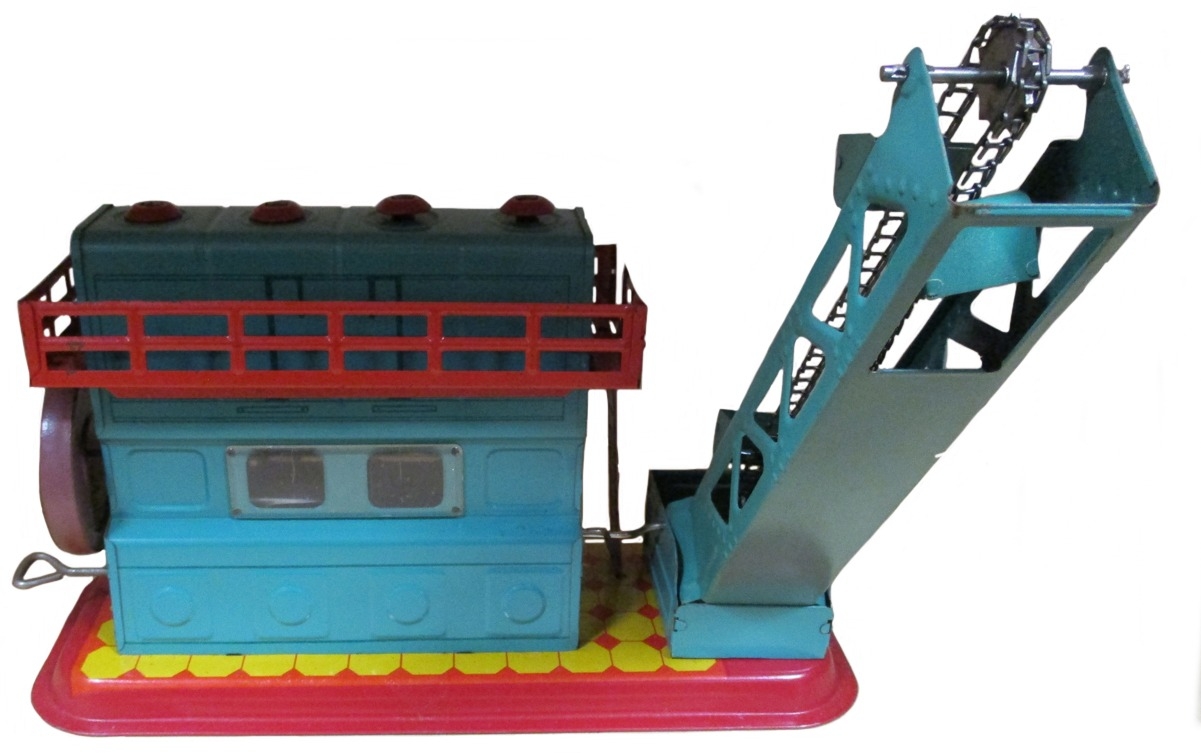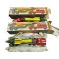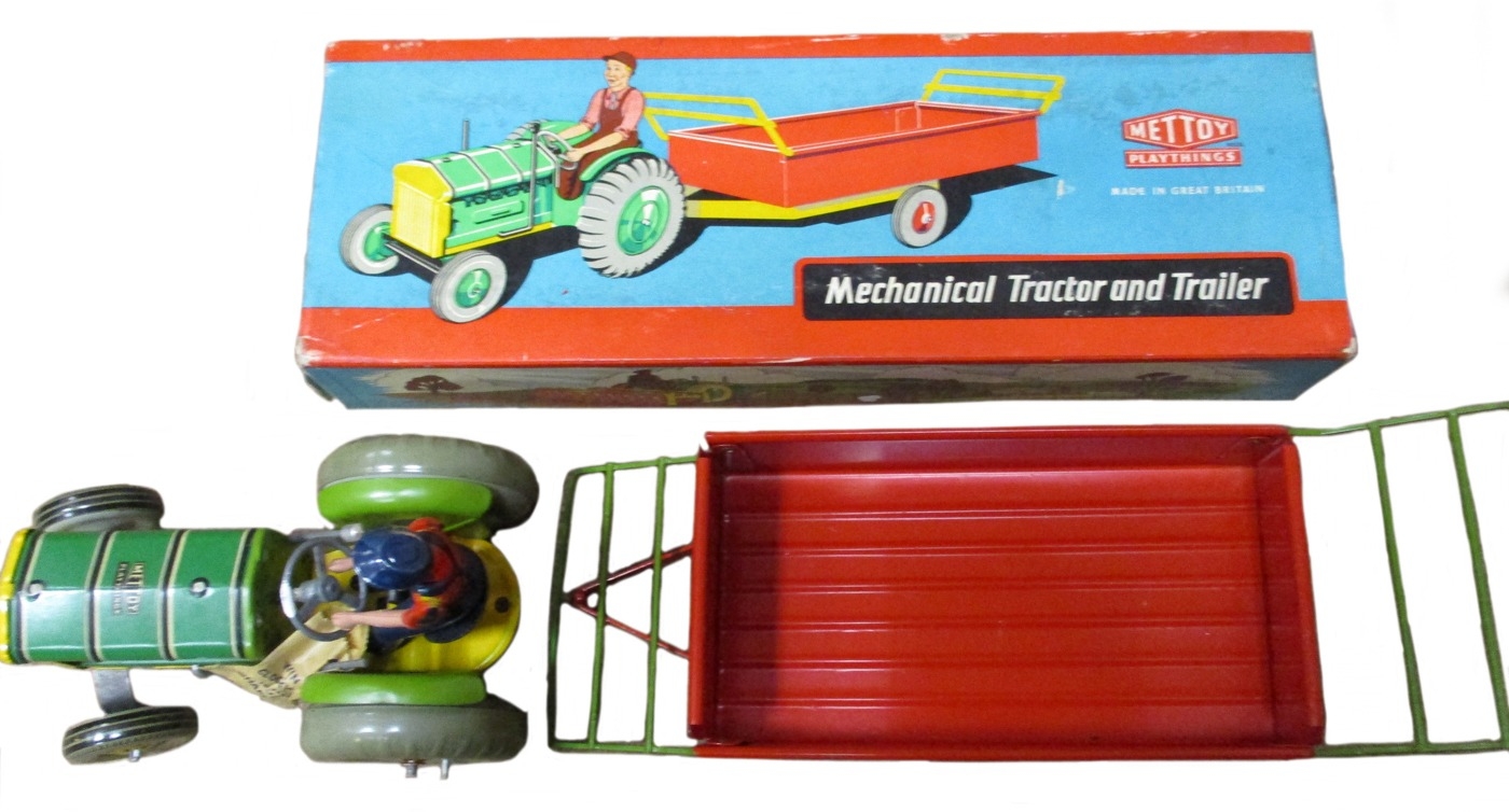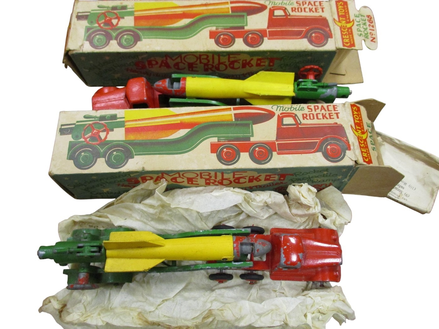 Collection with Crescent Toys Space Rocket No 1268 (2), Mettoy Playthings Mechanical Tractor and Trailer No 3262/76 and Vintage windup USSR elevator loader Apt 1044-y generally good. (B)