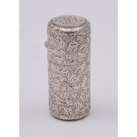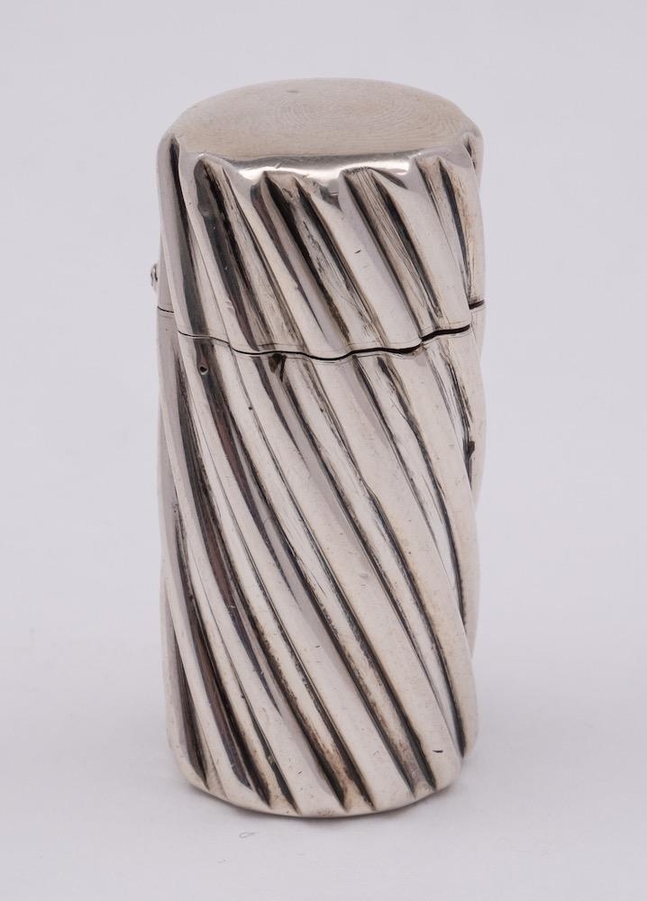 A Victorian silver scent bottle, maker Sampson Mordan & Co, London, 1887: of cylindrical outline with reeded writhen decoration, the hinged lid enclosing a glass stopper, 5.5cm high.