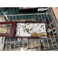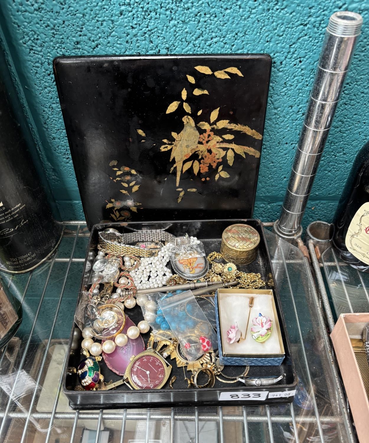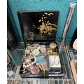 Vintage lacquered box containing curios including a trinket box, jewellery and a Timex watch