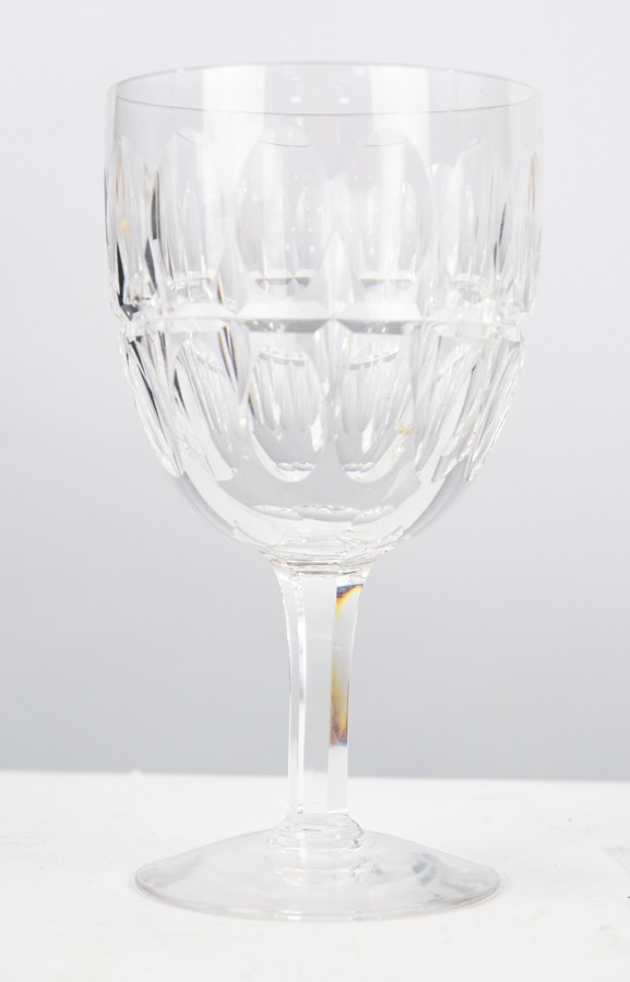 SET OF SIX STUART 'CLIFTON PARK' ENGLISH CUT CRYSTAL WATER GOBLETS, the bowls thumb cut with fluted girdle, on hexagonally panelled stem and plain circular foot, signed 'Stuart', 6 1/4" high (16cm)