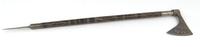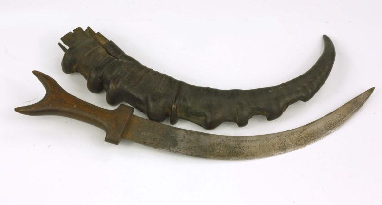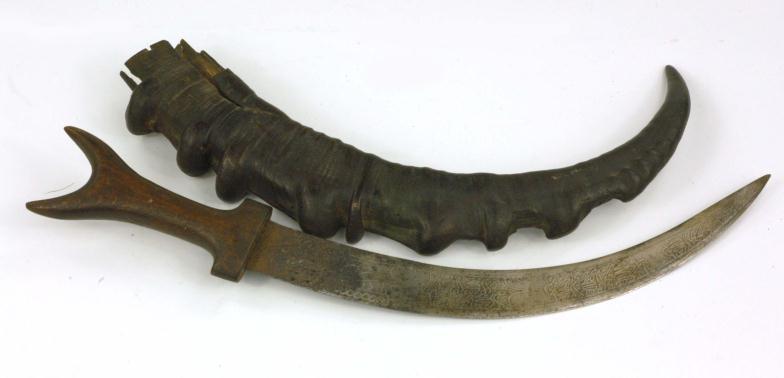 Far Eastern dagger, the curved steel blade decorated with script, with wooden grip and horn sheath, overall 49cm in length