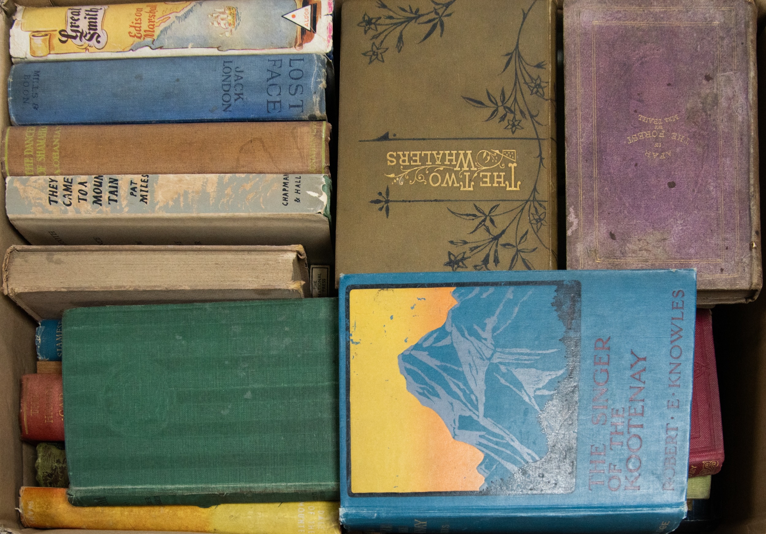 Mrs Traill - Afar in the Forest, pictures of Life and Scenery in the Wilds of Canada pub T Nelson Son 1870. Robert E Knowles - The Singer of the Kootenay, pub Partridge, n.d.. Grace Gallatin Seton -Thompson - A Woman Tenderfoot, pub David Nutt London 1900. Together with a further group of COLONIAL FICTION, mainly relating to CANADA, various authors to include G MANVILLE FENN, PAT MILES, JACK LONDON, EDISON MARSHALL, NORMAN LEVINE RUBY COMER, WILFRED CAMPBELL, GABRIELLE ROY, SARA JEANNETTE DUNCAN amongst others. Contents of a box