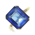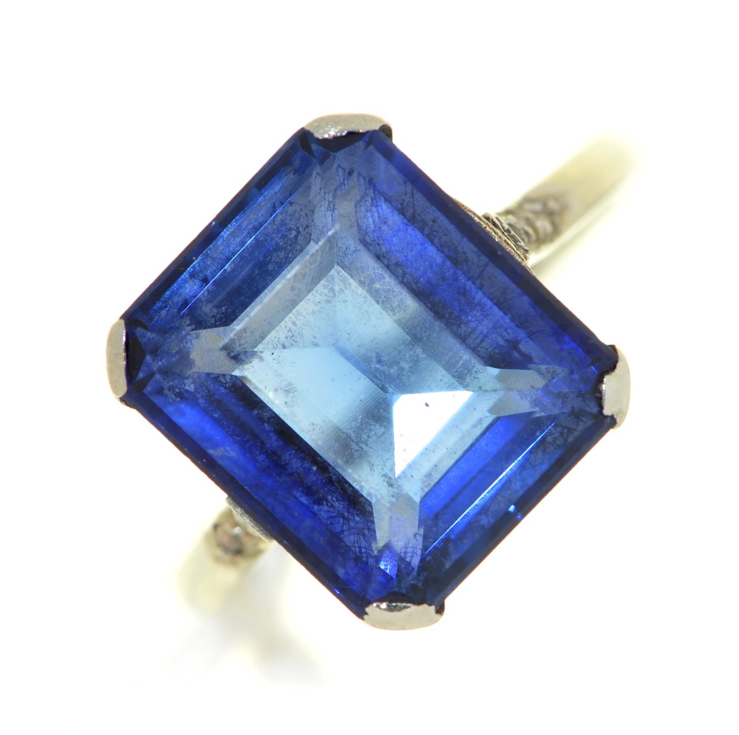 A synthetic sapphire ring, with diamond shoulders, in platinum coloured metal, 3.2g, size K½