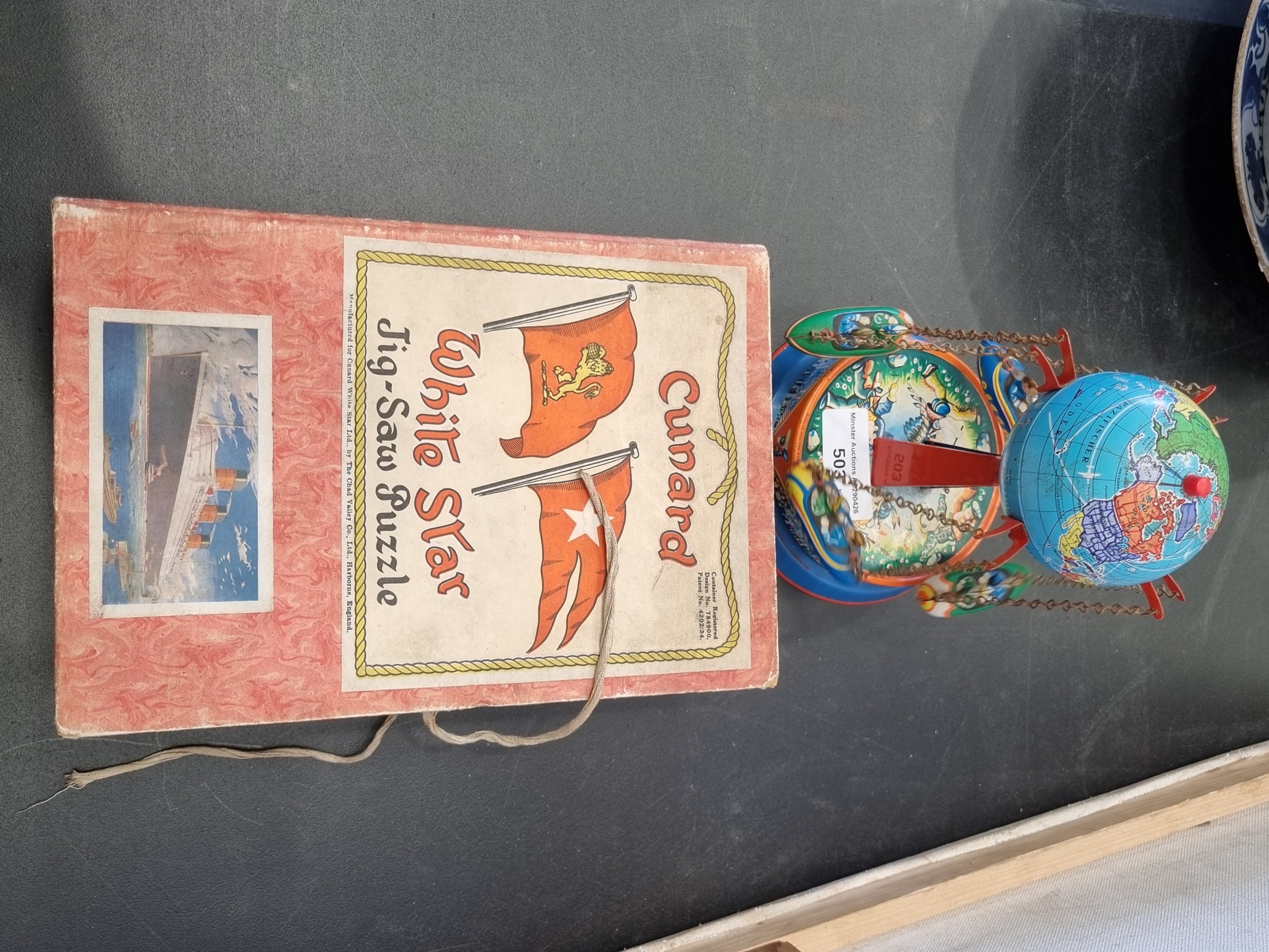 A Cunard White Star Jig-Saw Puzzle, boxed and a German tin-plate globe Roundabout (R5)