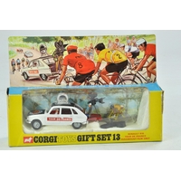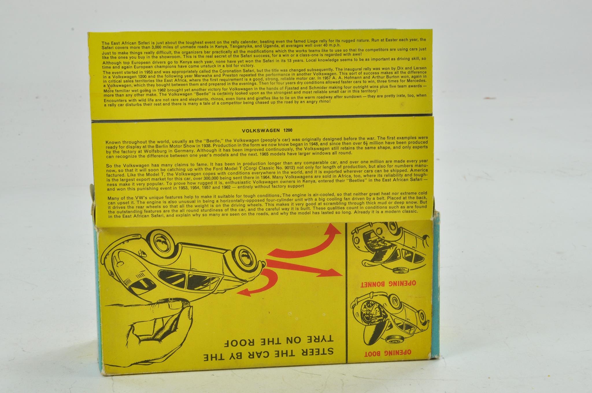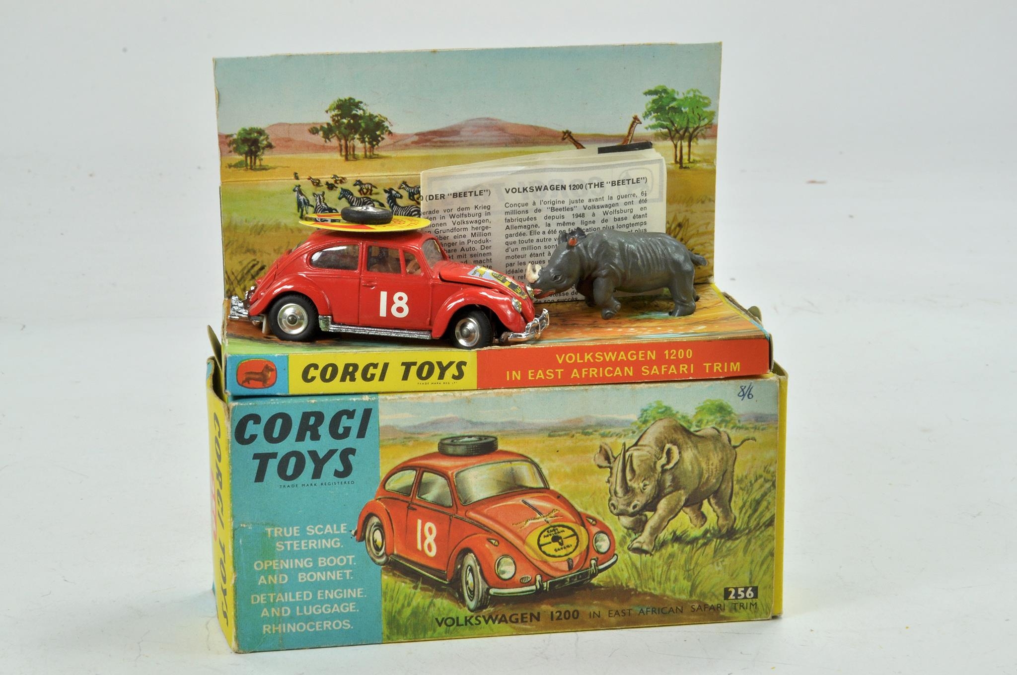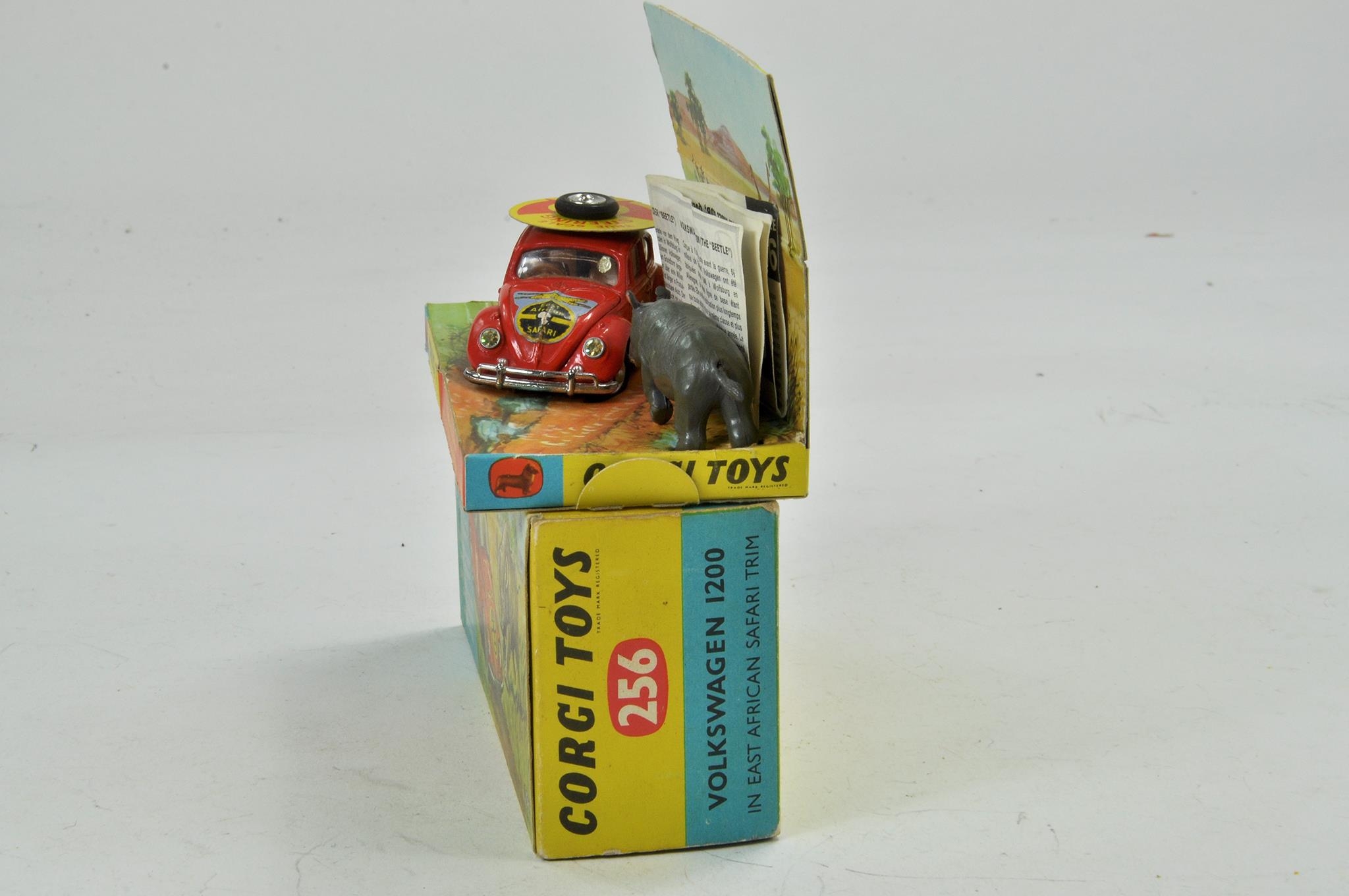 Corgi No. 256 Volkswagen 1200 Rally. Orange body with RN '18' 'East African Safari' on bonnet with steering wheel on roof of car. Brown interior. Yellow cardboard roof fitting and Rhinoceros figurine. Appears excellent with little if any marks present contained in very good original box with leaflet.