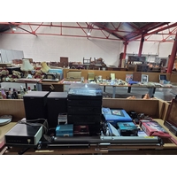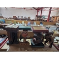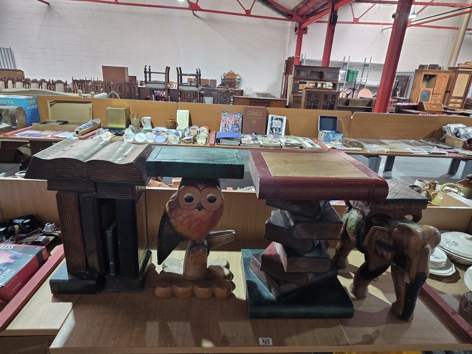 Two carved side tables designed to look like a stack of books together with a carved owl side table and a carved elephant stool