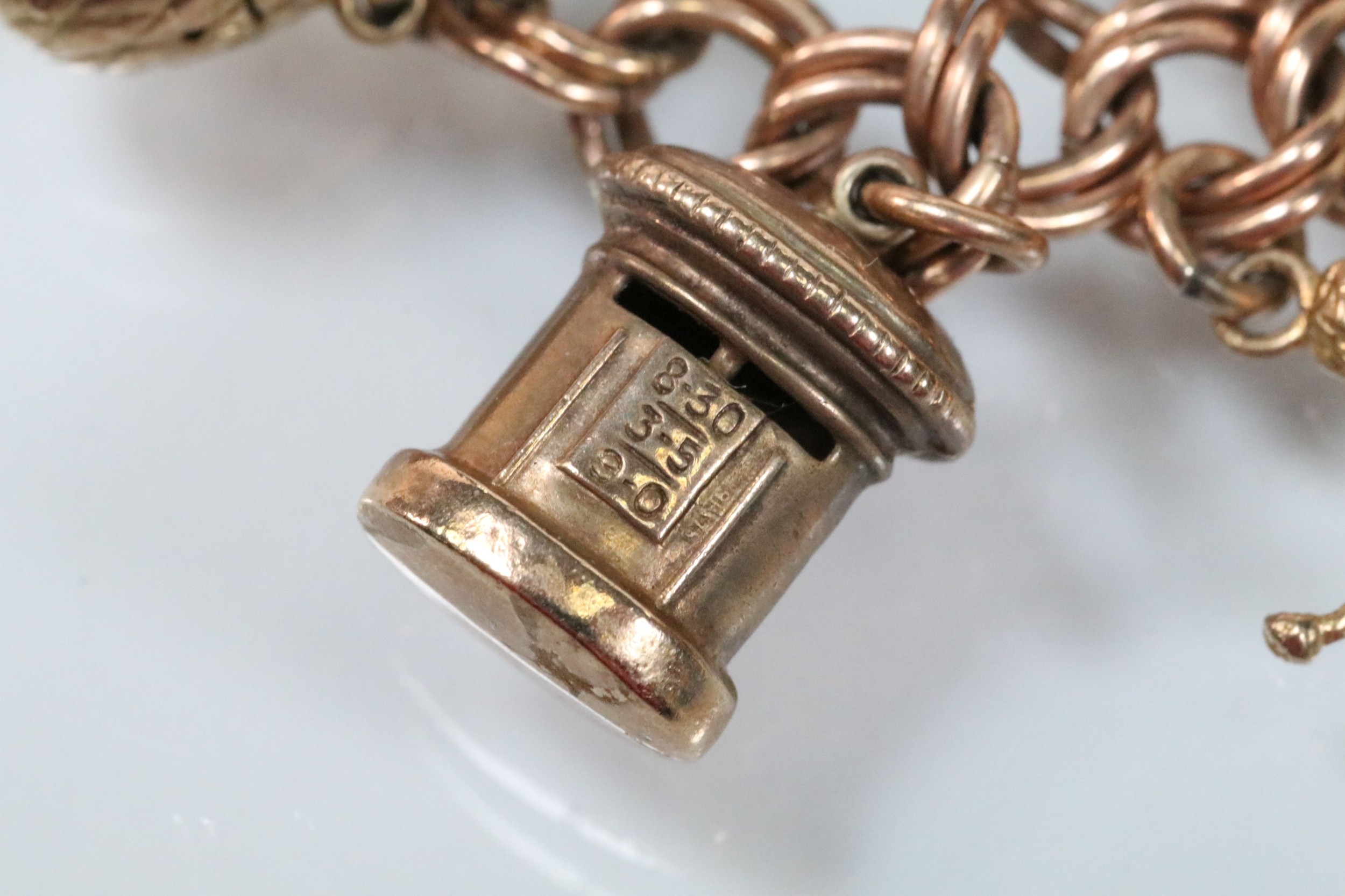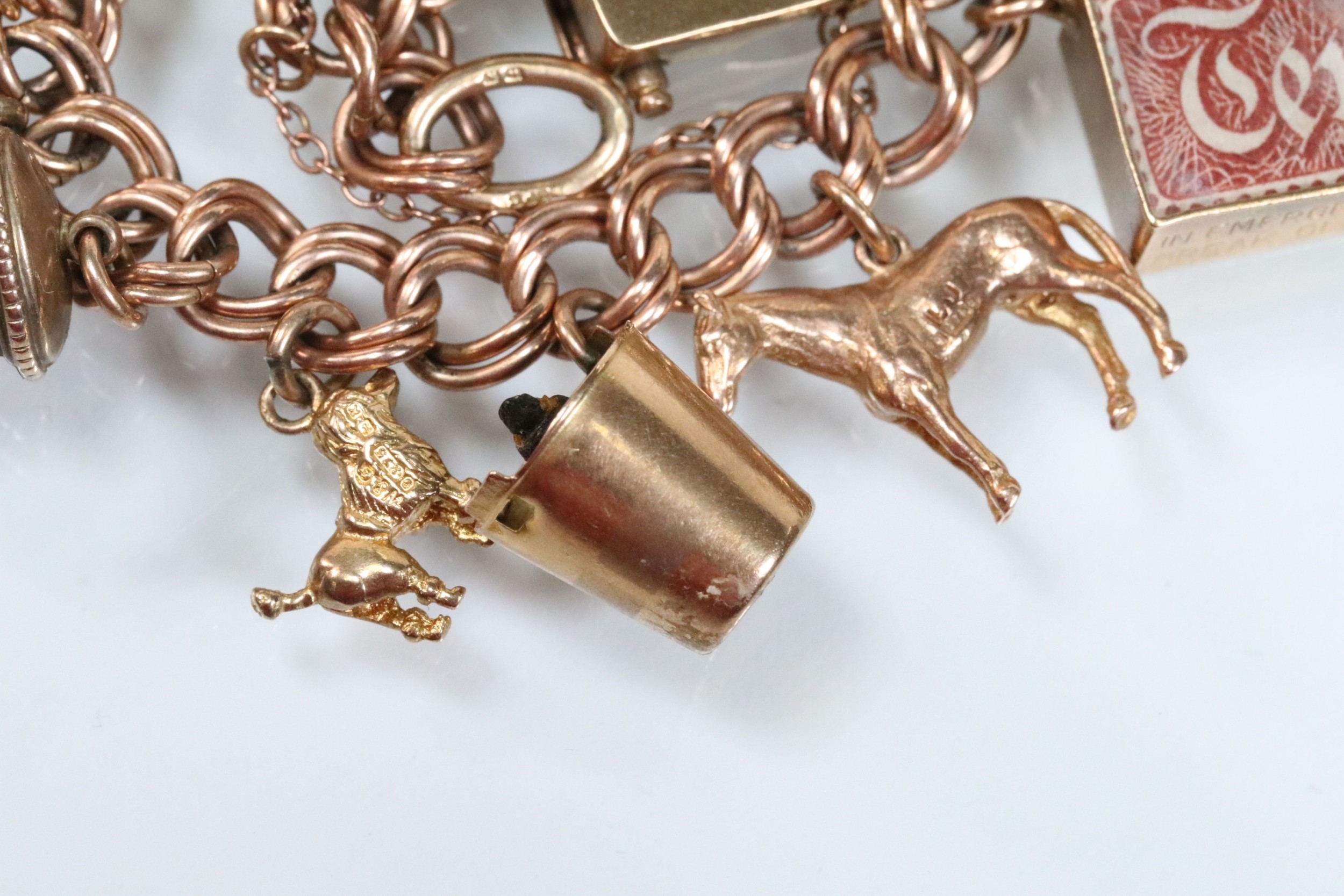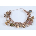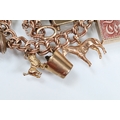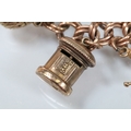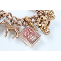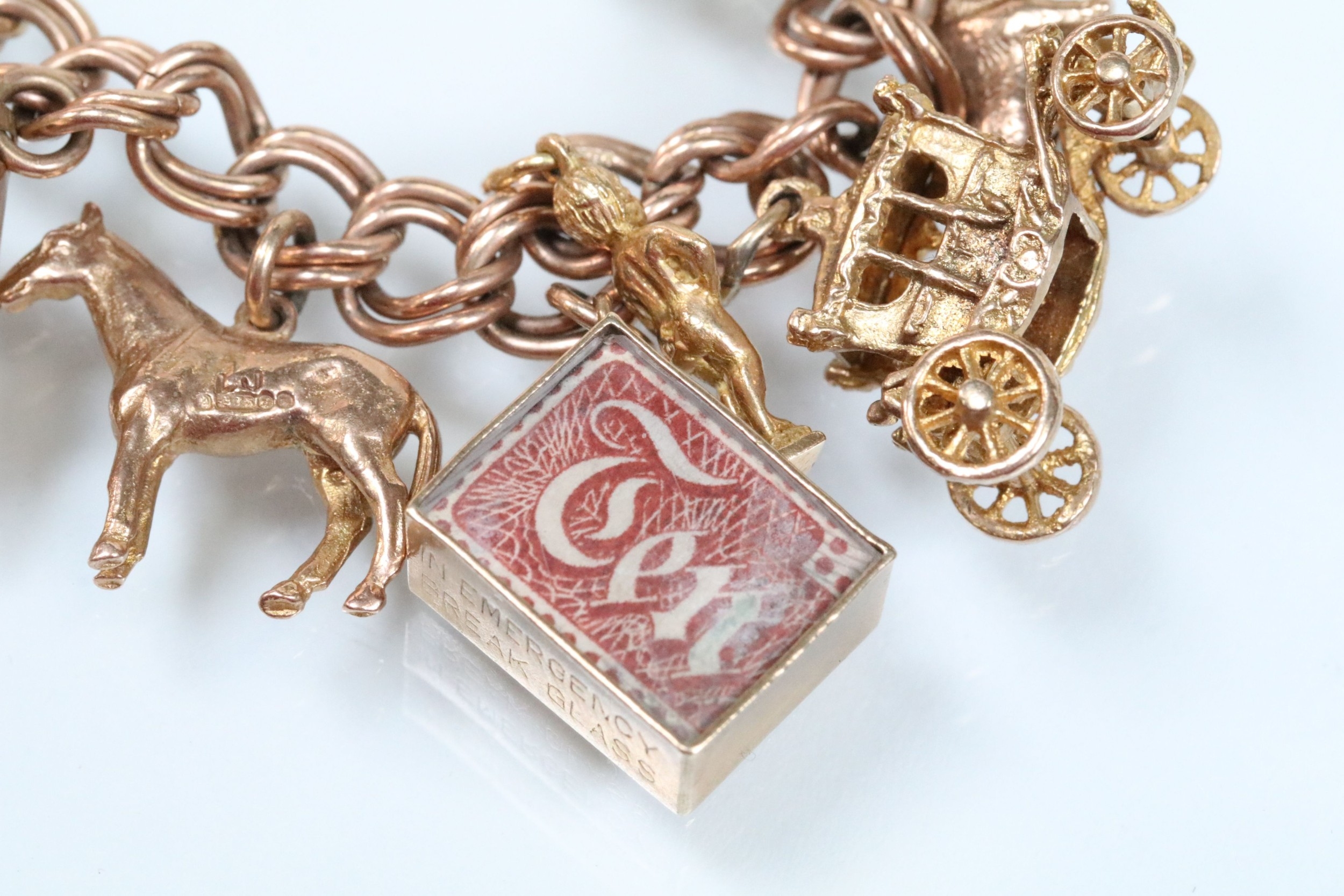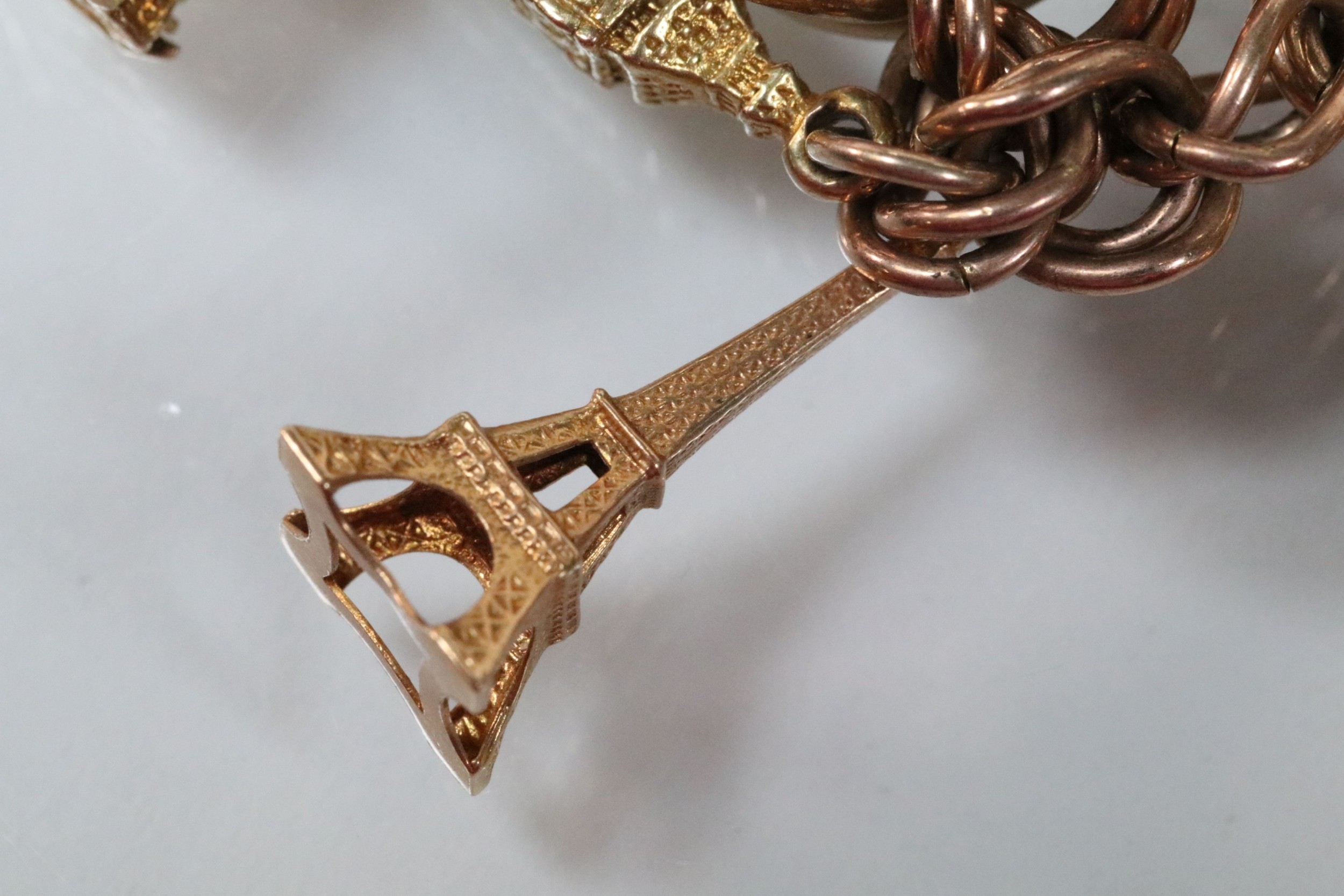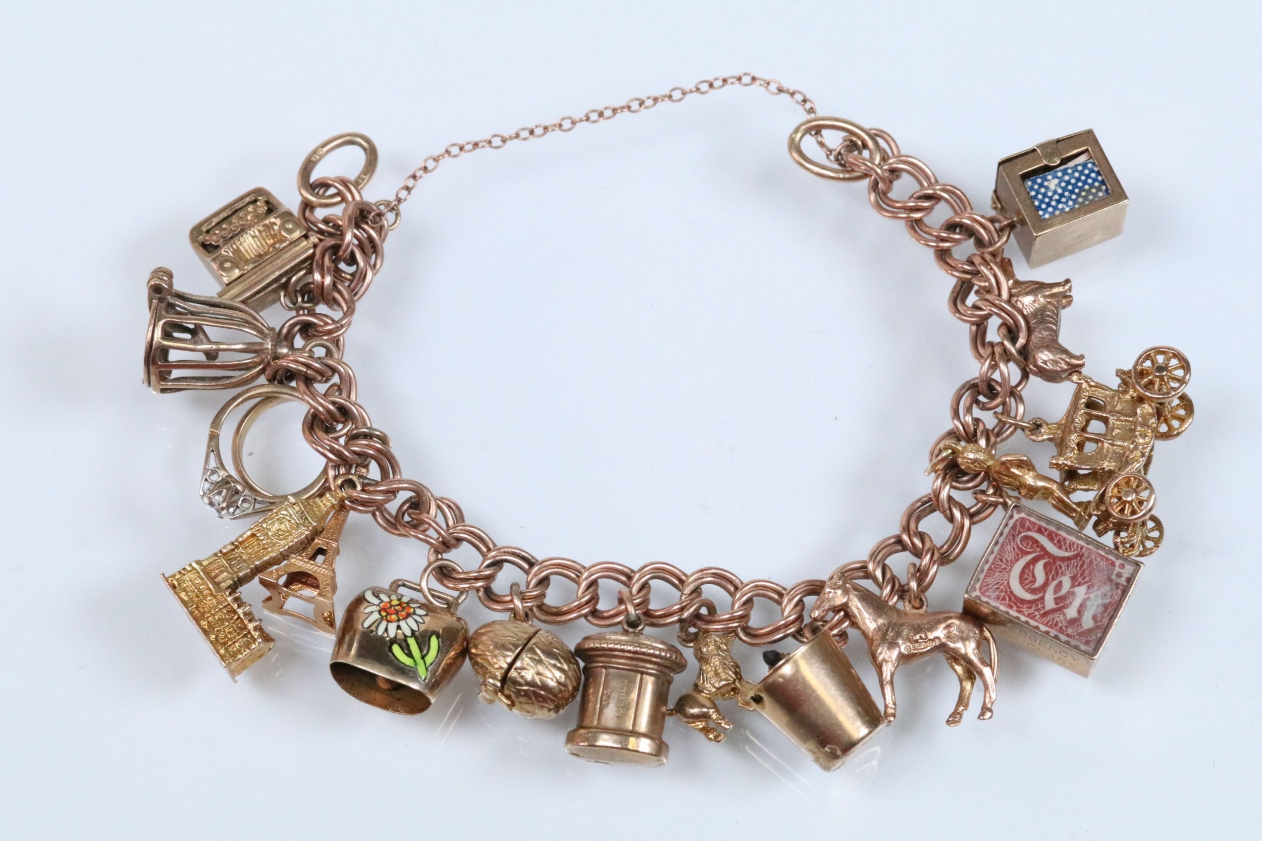 9ct gold charm bracelet having a double curb link chain. All charms hallmarked apart from carriage, Eiffel tower charm 18ct with French hallmark. Bracelet measures 7 inches.