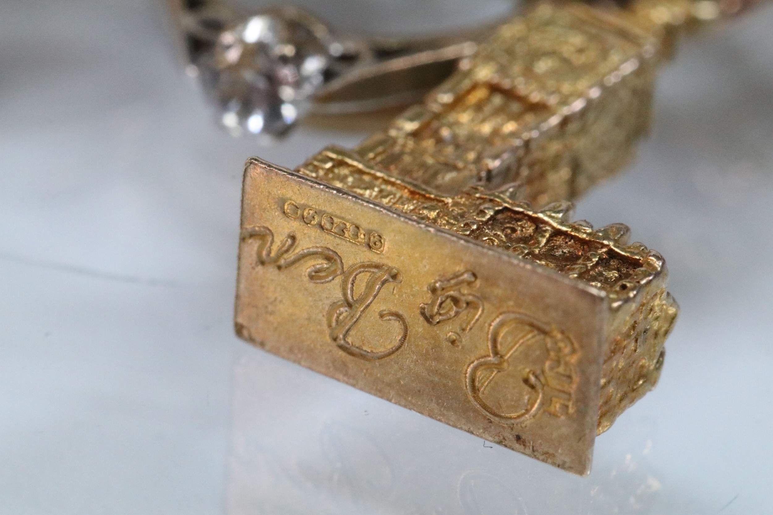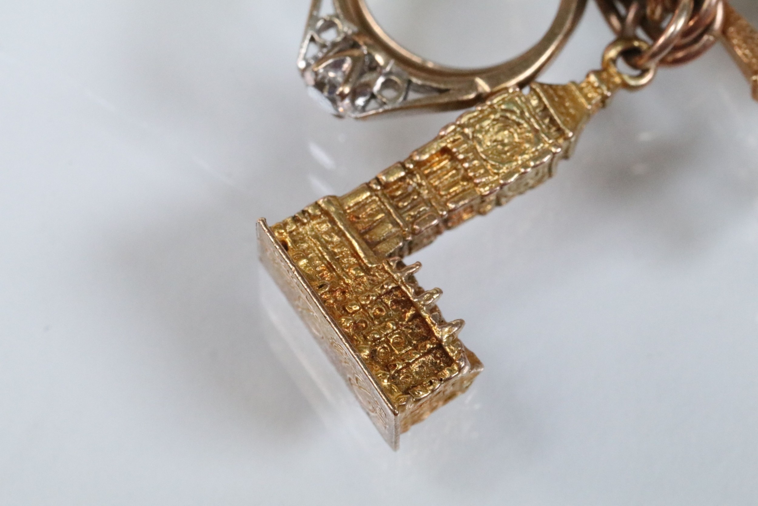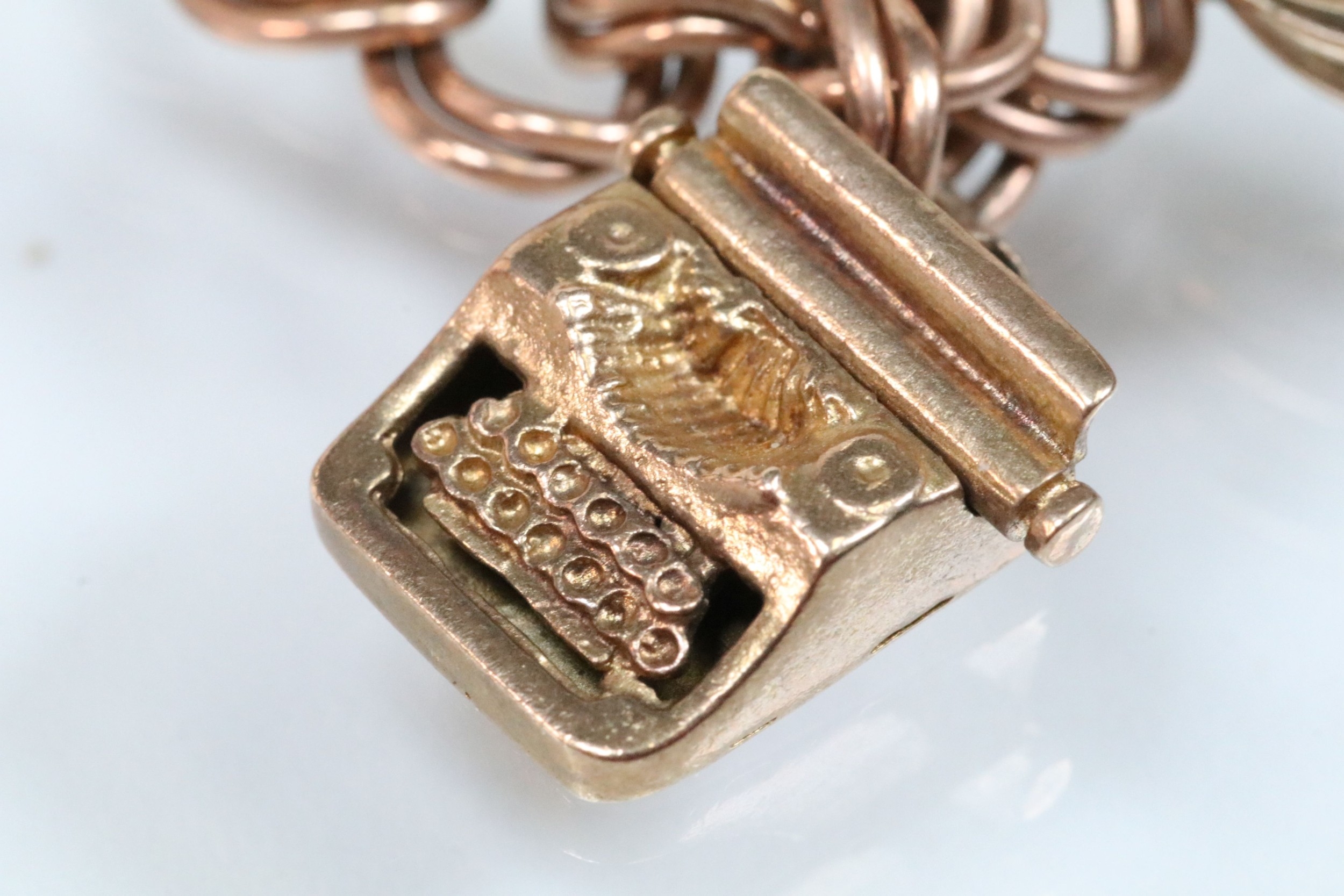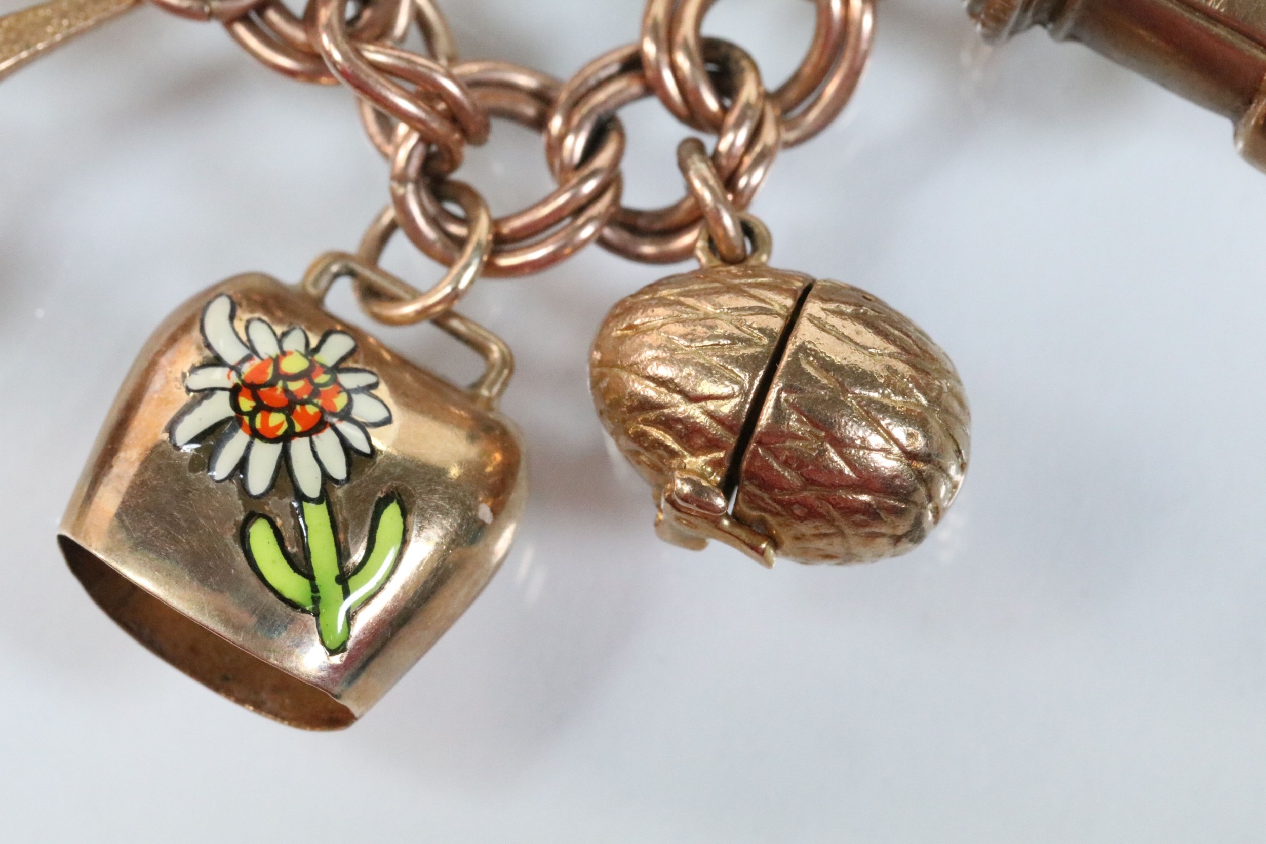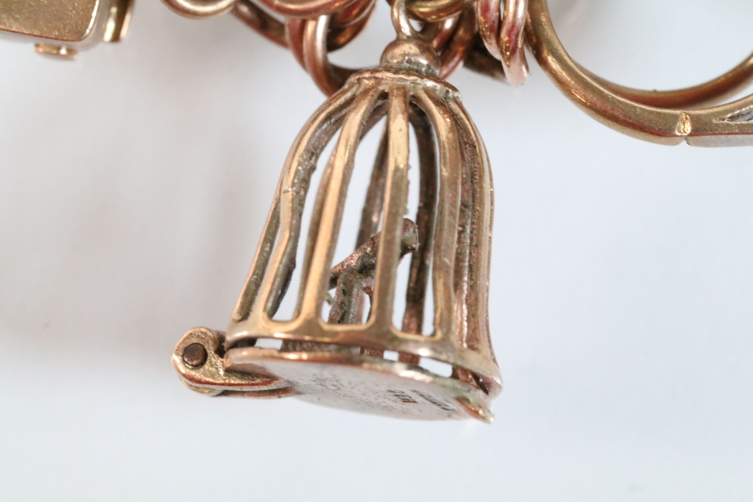 9ct gold charm bracelet having a double curb link chain. All charms hallmarked apart from carriage, Eiffel tower charm 18ct with French hallmark. Bracelet measures 7 inches.