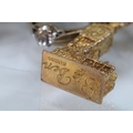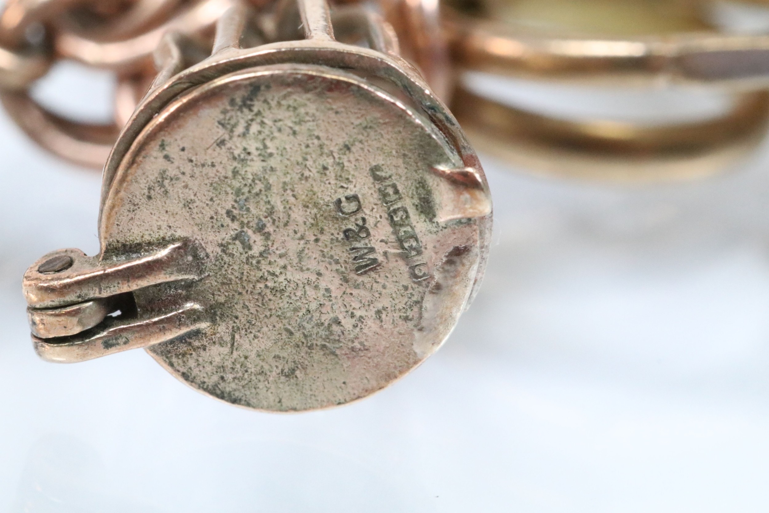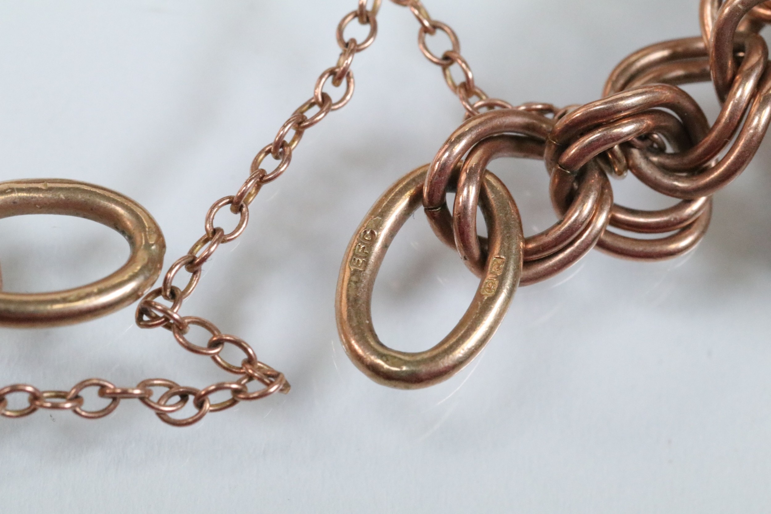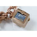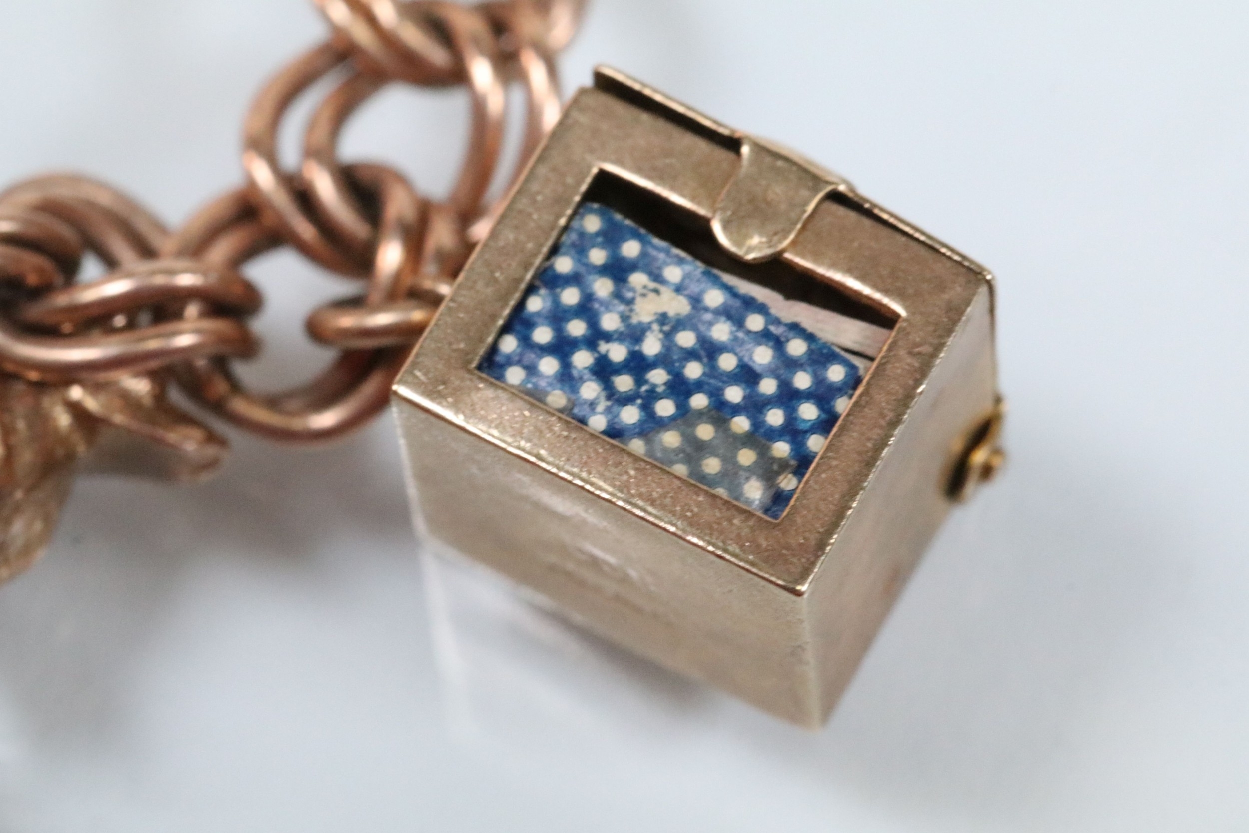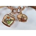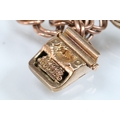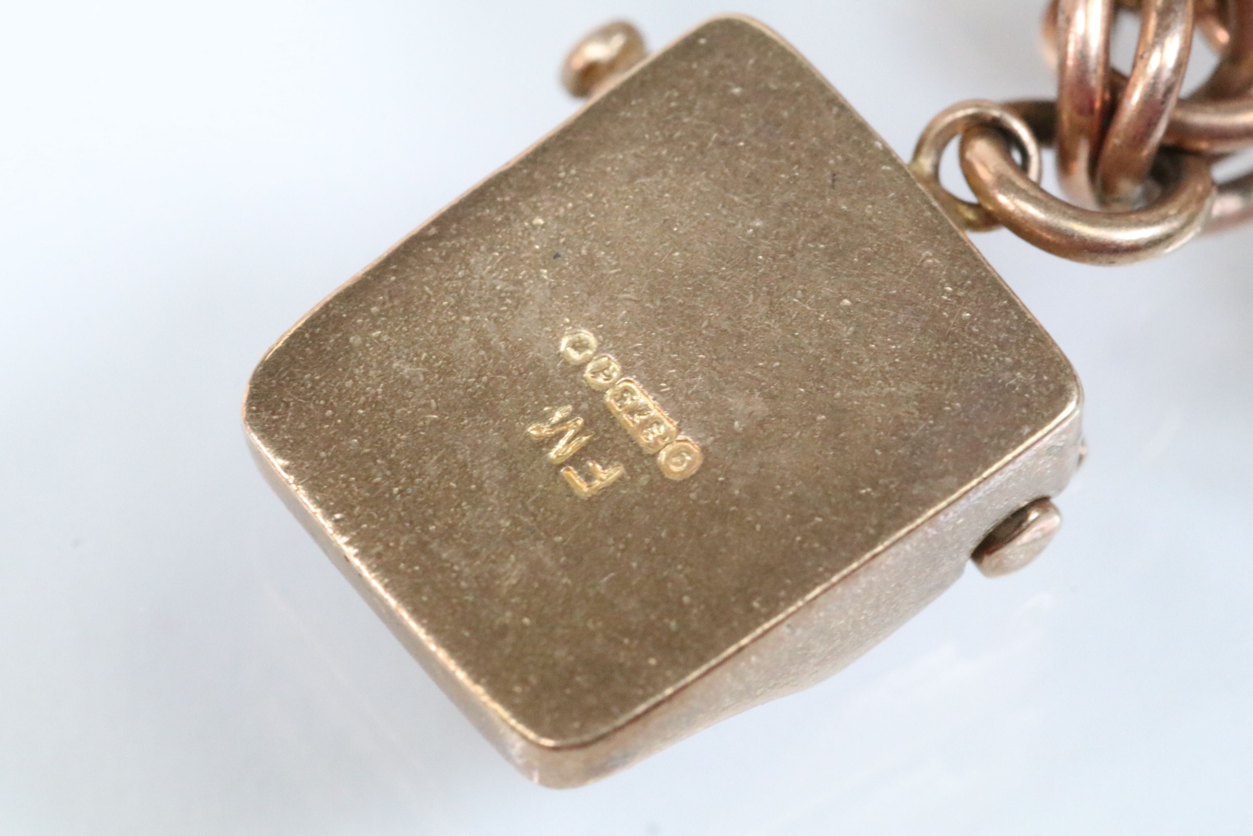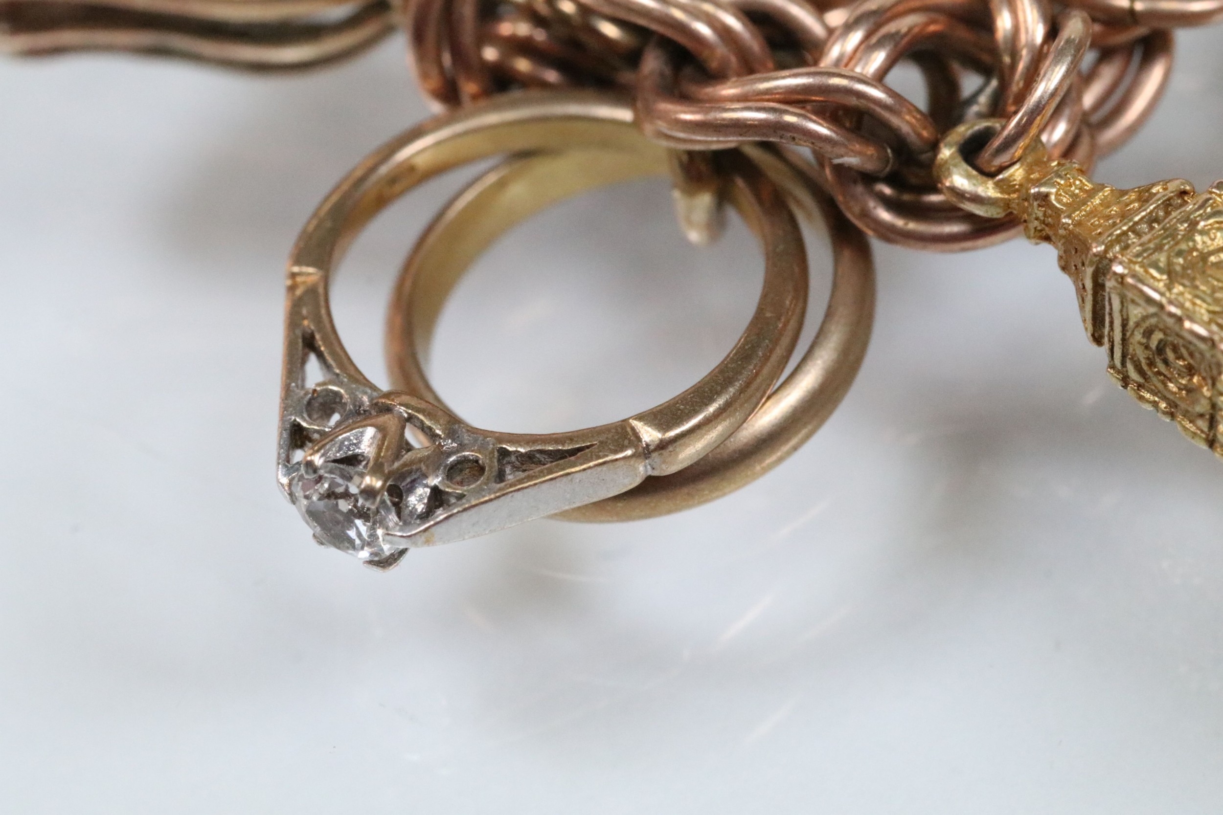 9ct gold charm bracelet having a double curb link chain. All charms hallmarked apart from carriage, Eiffel tower charm 18ct with French hallmark. Bracelet measures 7 inches.