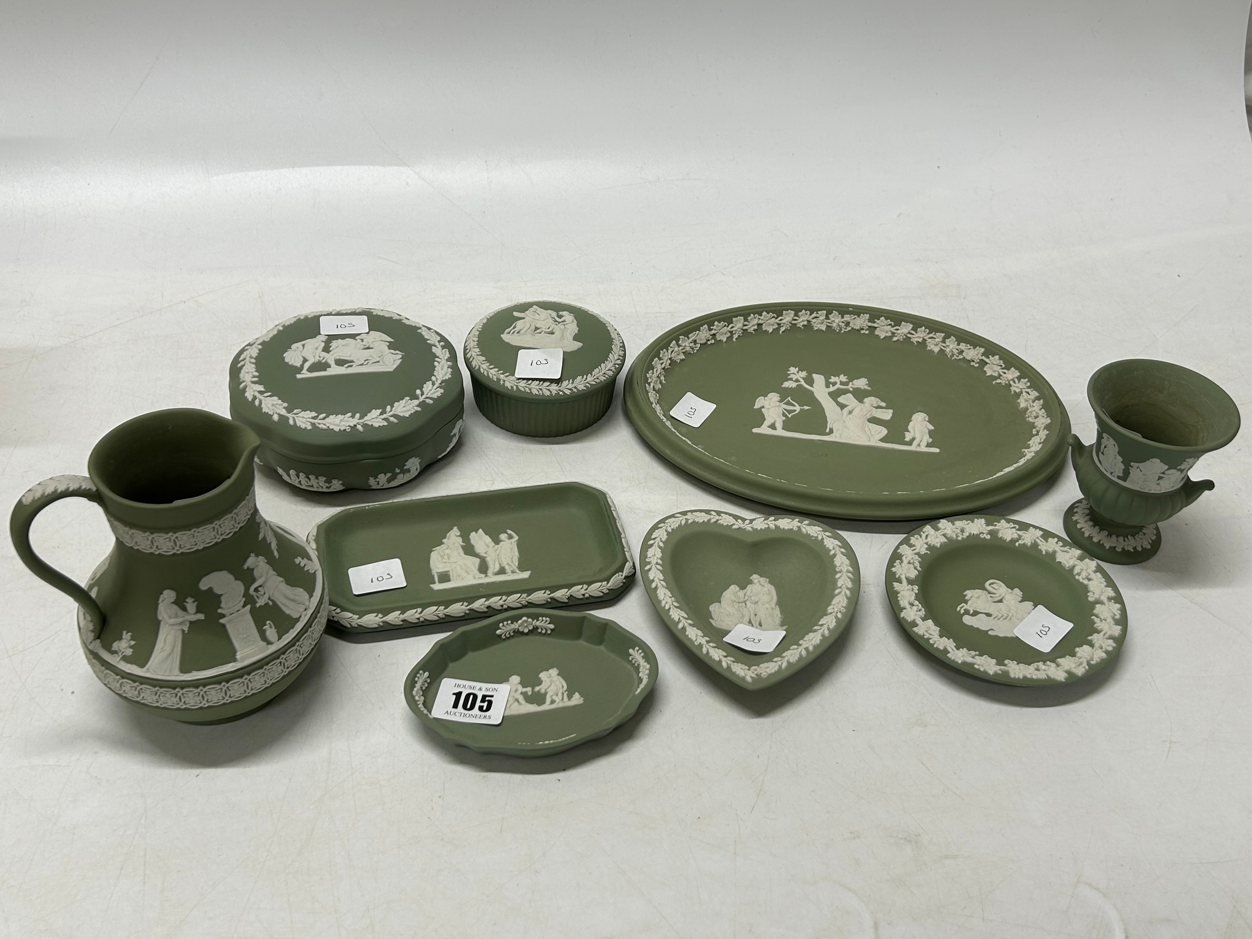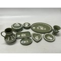 A selection of Wedgwood green jasper wares including trinket boxes, dishes, jug etc..