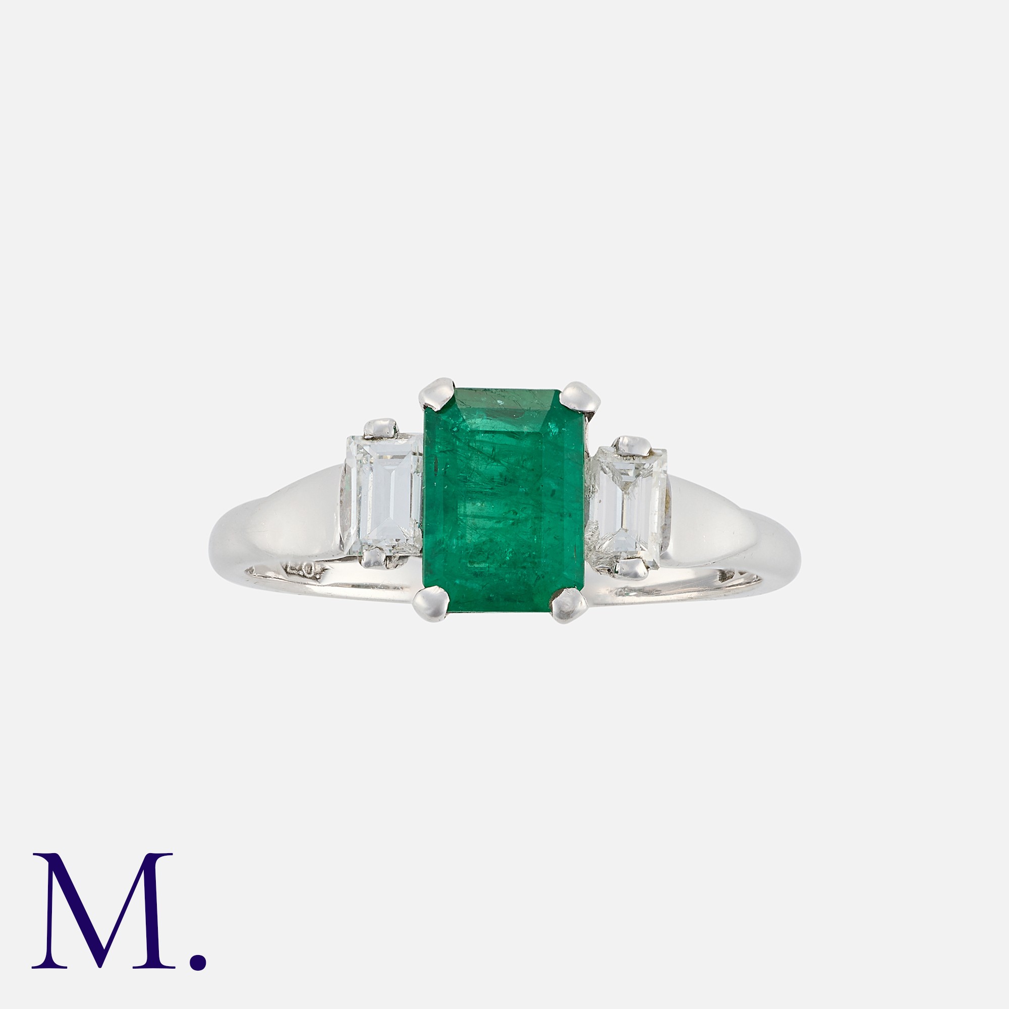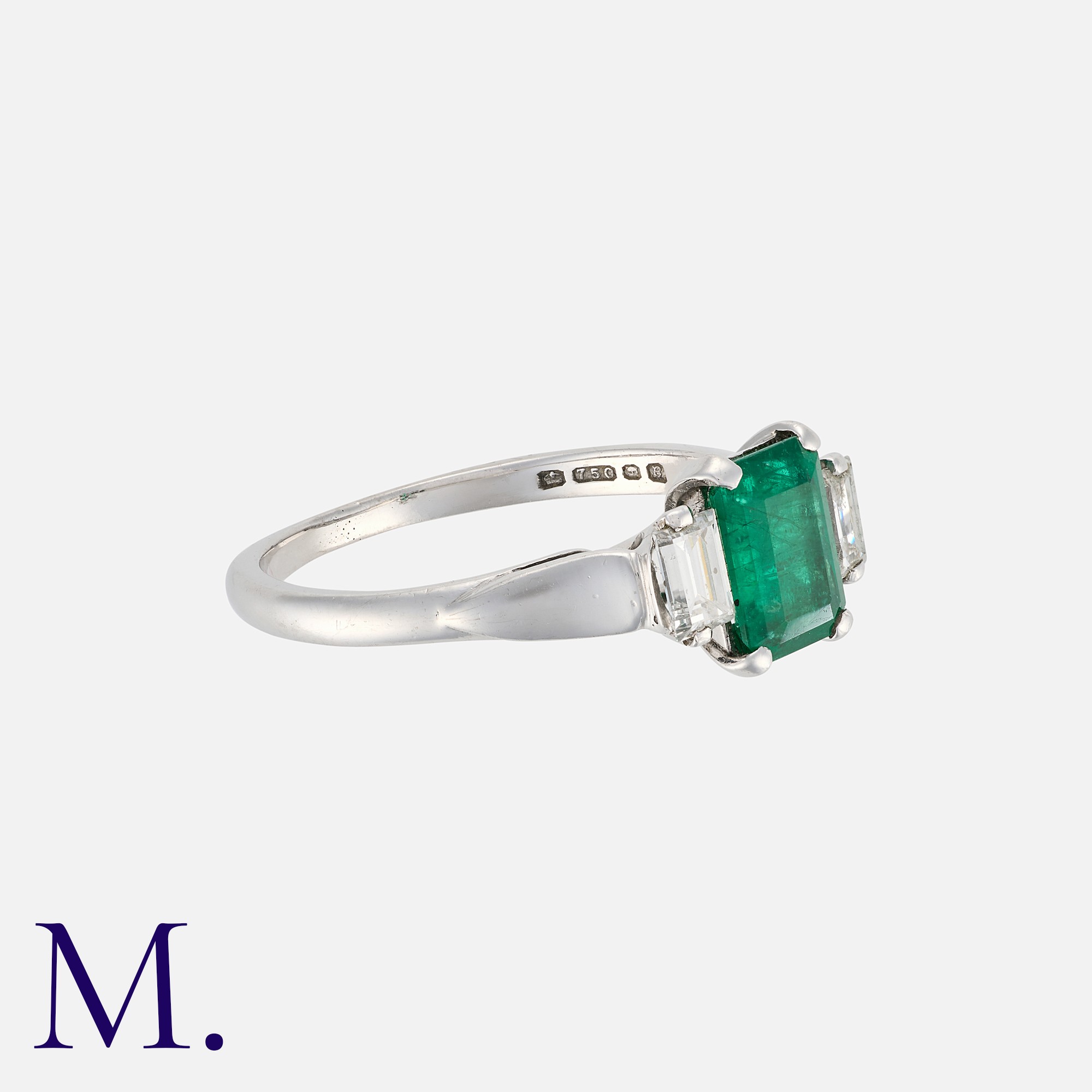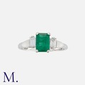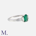 An Emerald and Diamond Ring, in 18 carat gold, set with a central step cut emerald of approximately 1.60 carats, flanked between two baguette cut diamonds. Hallmarked for 18 carat gold.