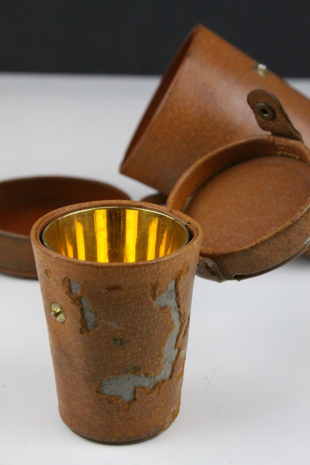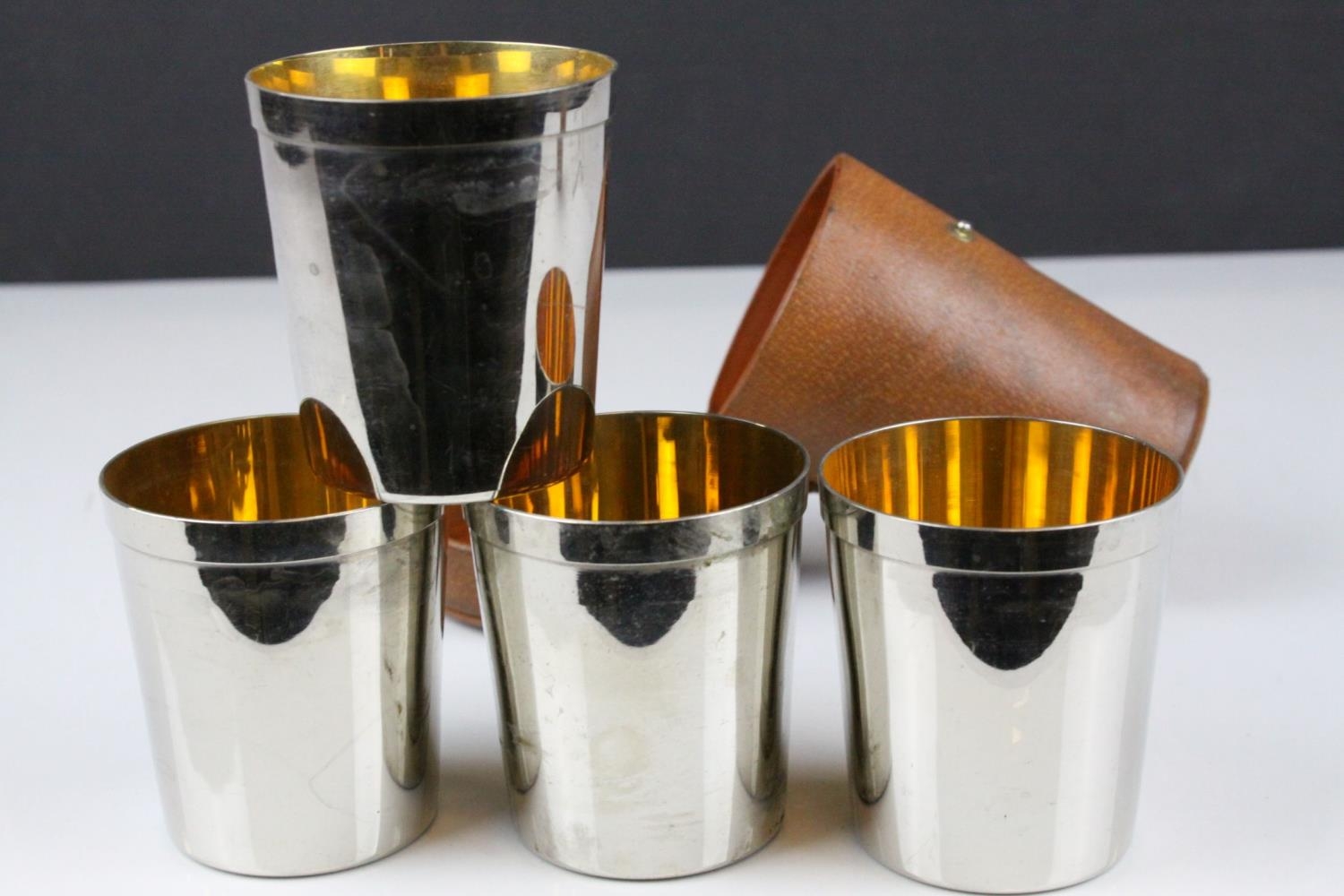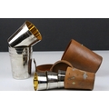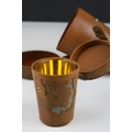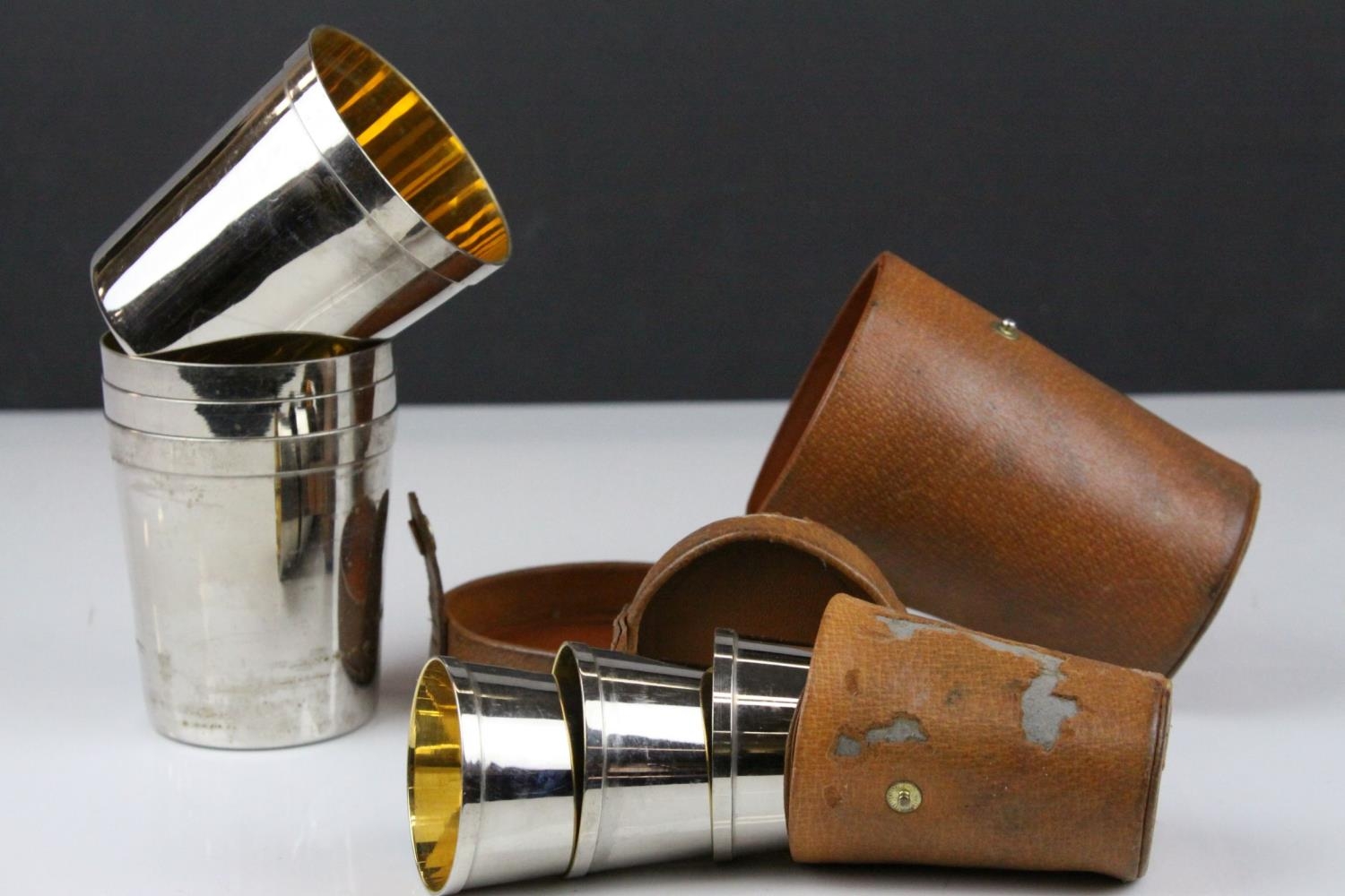 Two Sets of Early 20th century Stacking Stirrup Cups, Silver Plated with Gilt Interiors, Four Cups in each set, each set contained within a cylindrical leather case, 12cms and 8cms high
