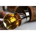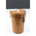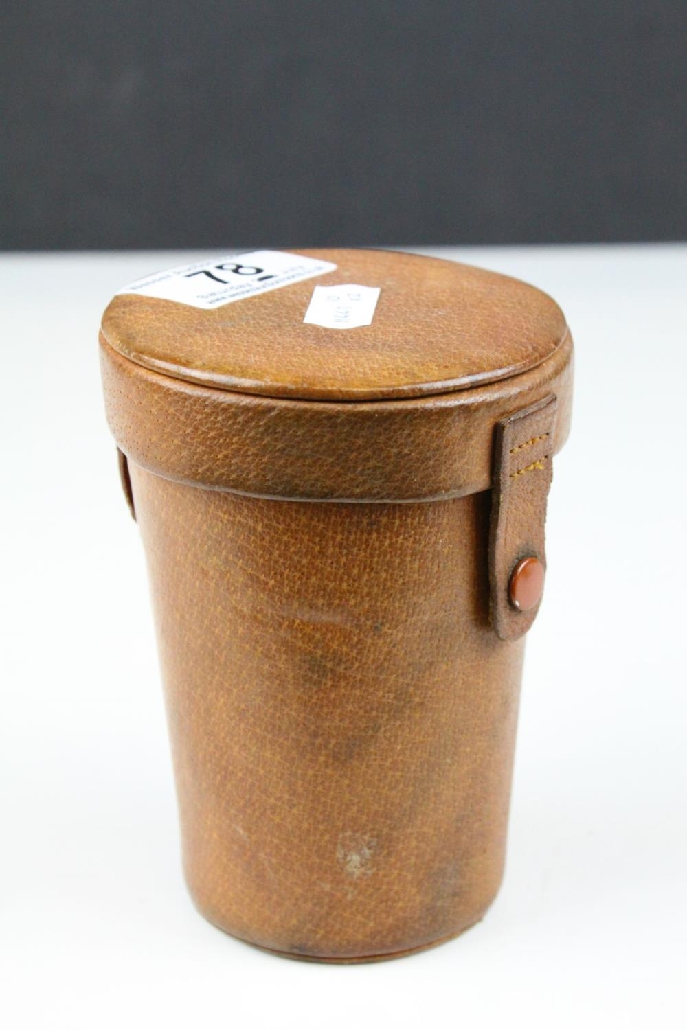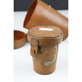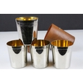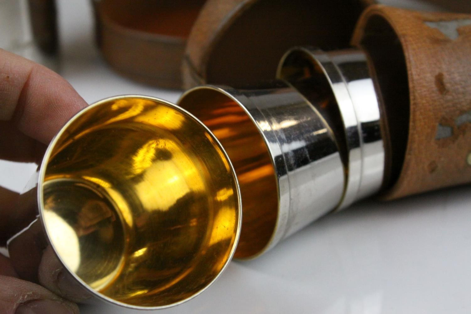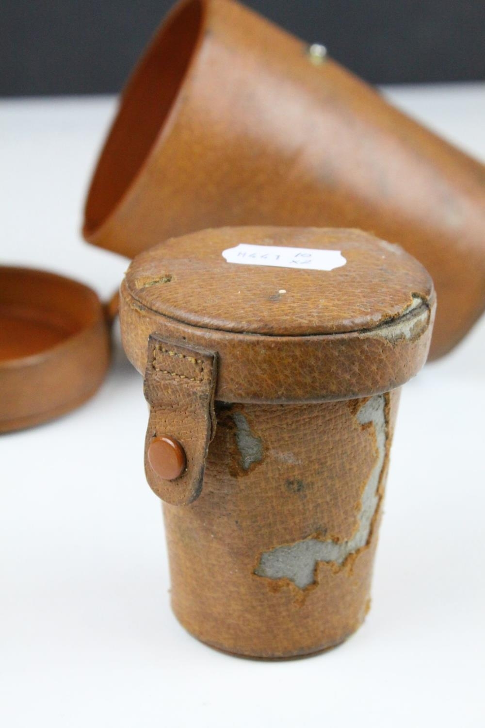 Two Sets of Early 20th century Stacking Stirrup Cups, Silver Plated with Gilt Interiors, Four Cups in each set, each set contained within a cylindrical leather case, 12cms and 8cms high