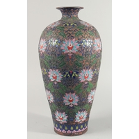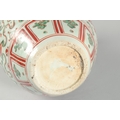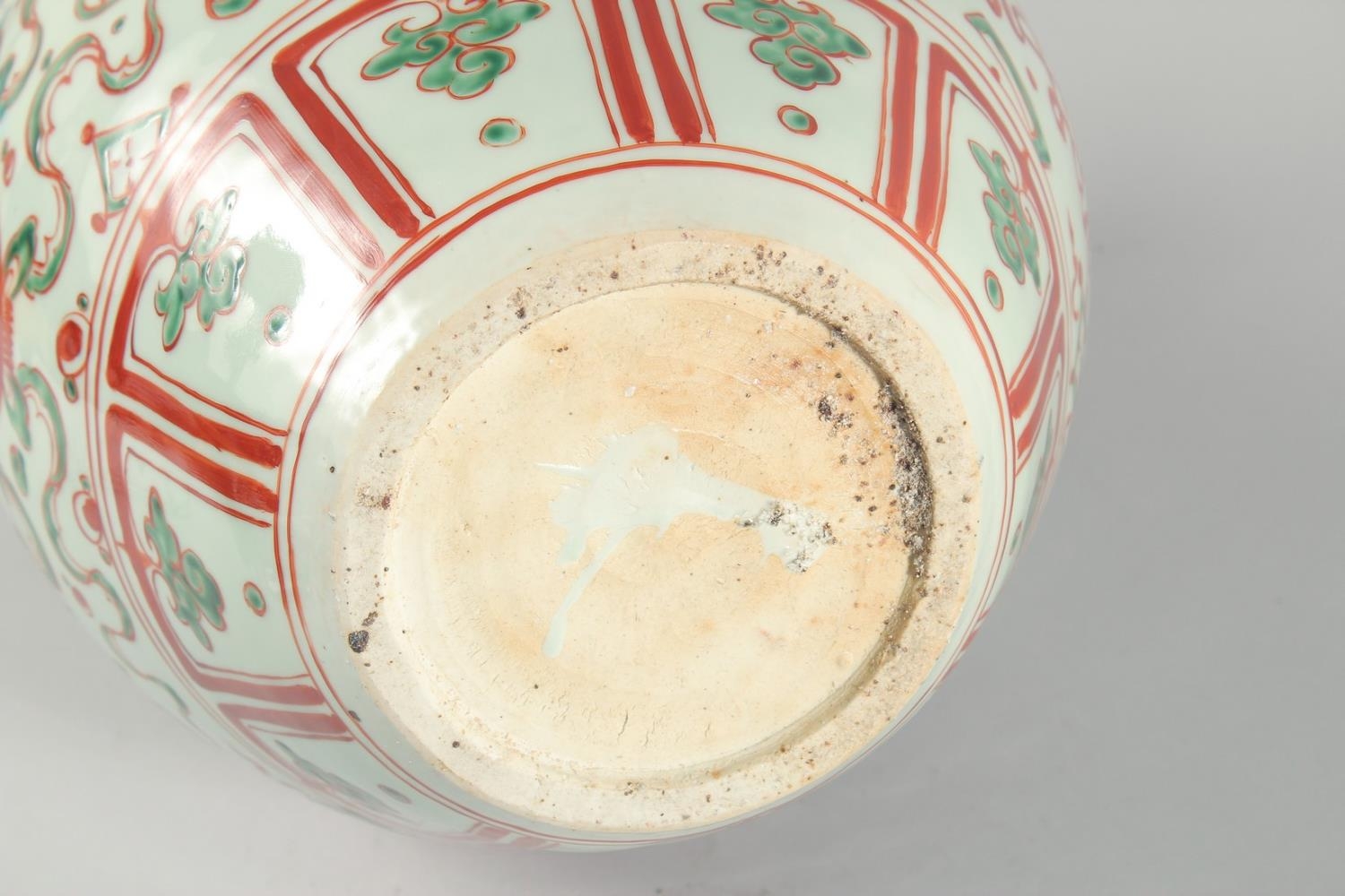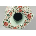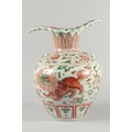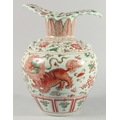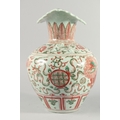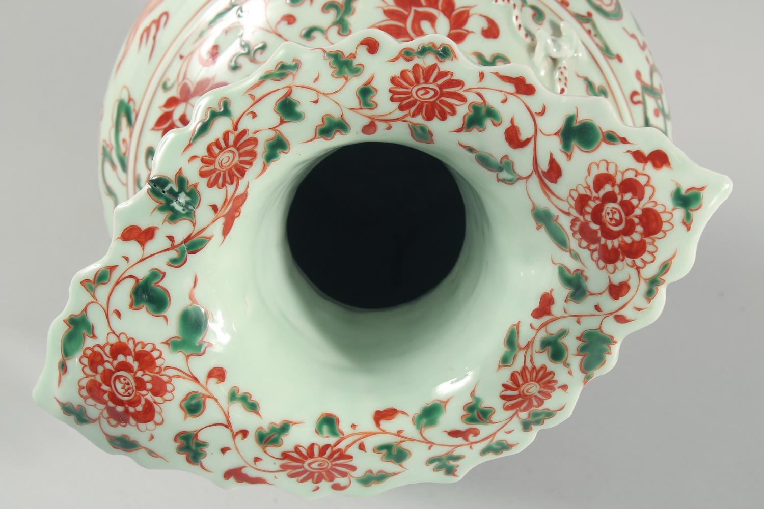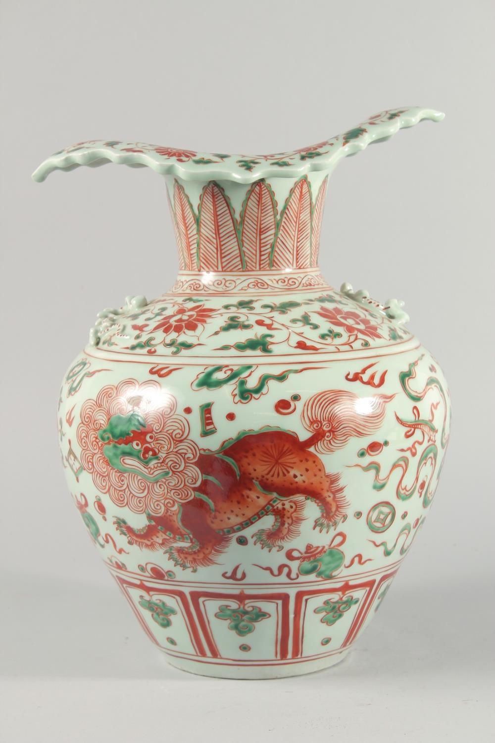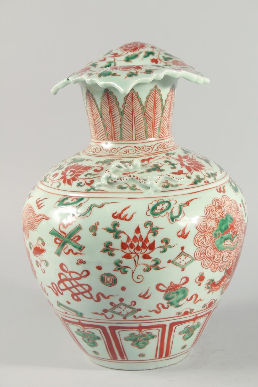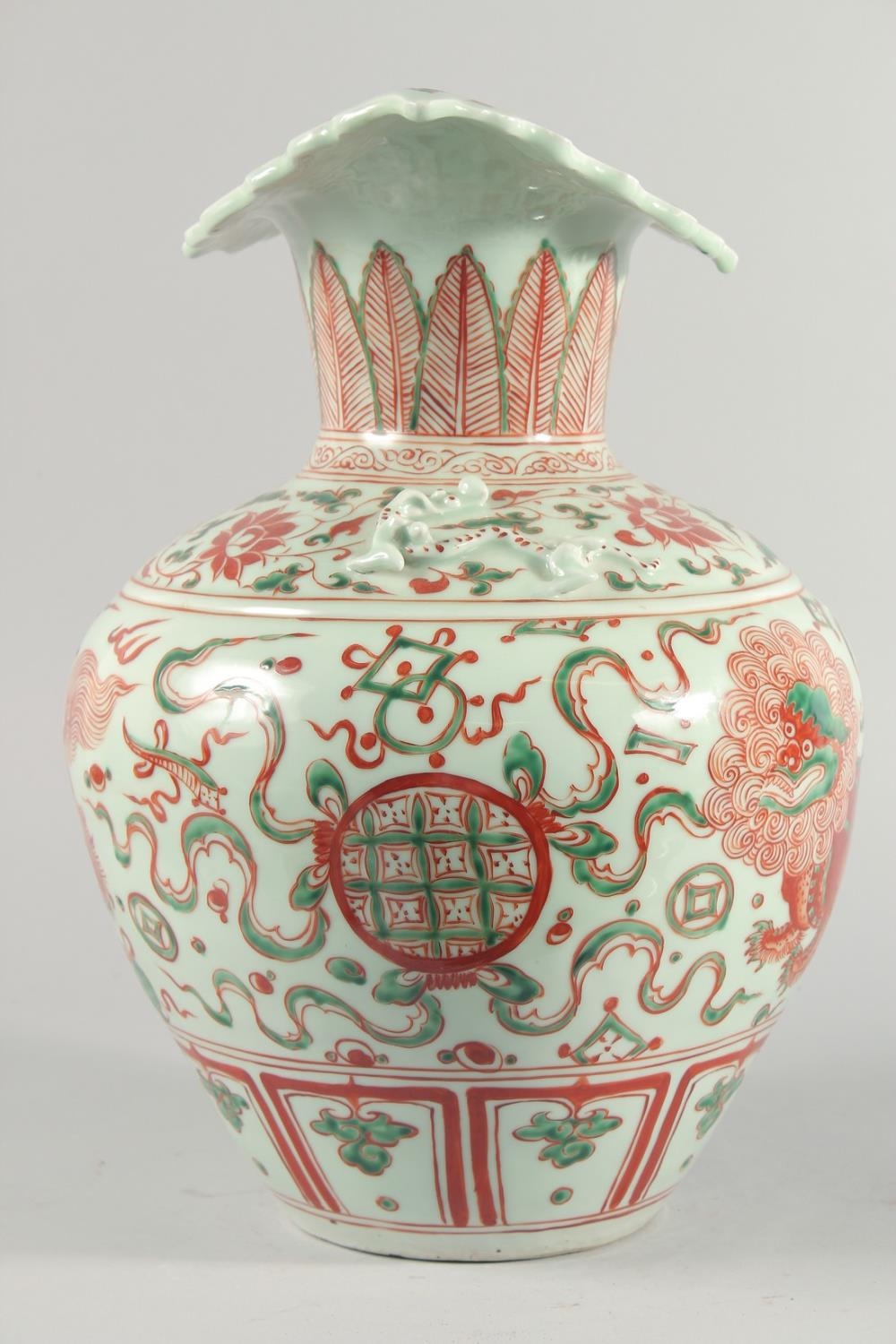 A VERY LARGE CHINESE IRON RED AND GREEN PORCELAIN VASE, with unusual leaf-form rim, moulded chilong to the shoulder and painted with lion dogs, flora and precious objects, 42.5cm high.