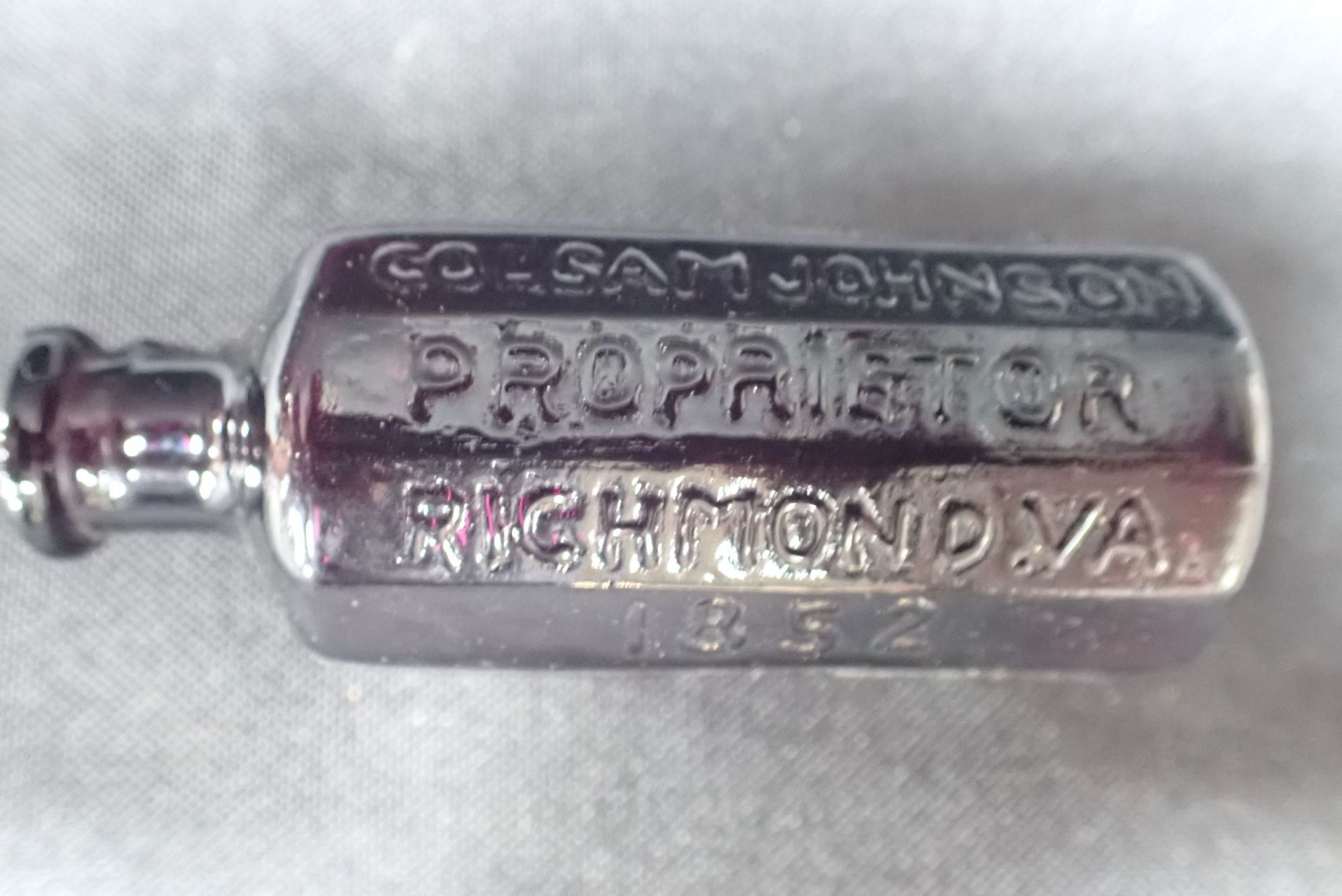 A MEDICINE BOTTLE: 'A. LANCASTER'S INDIAN VEGETABLE JAUNDICE BITTERS' 'Col. Sam Johnson....Richmond VA.1852' 7.5CM