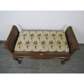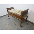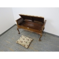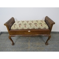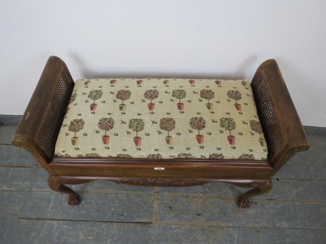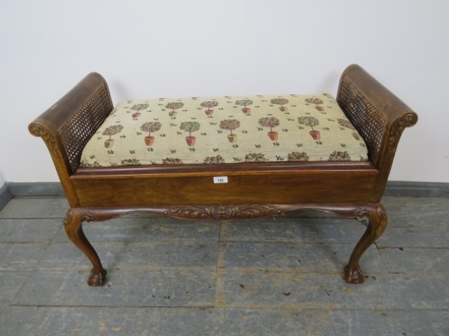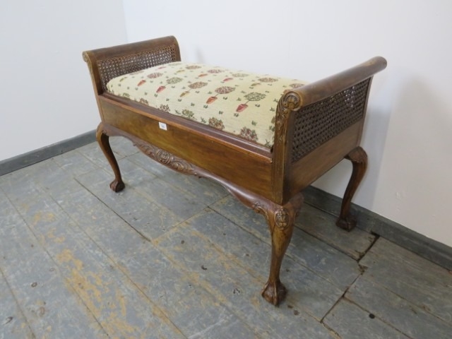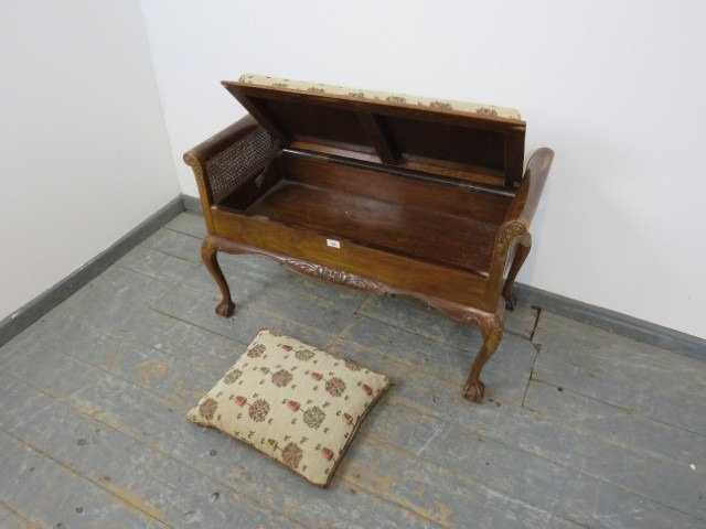 A 1920's walnut and bergere duet piano stool, with scroll ends, raised on cabriole claw and ball supports. 63 x 99 x 43cms (approx).