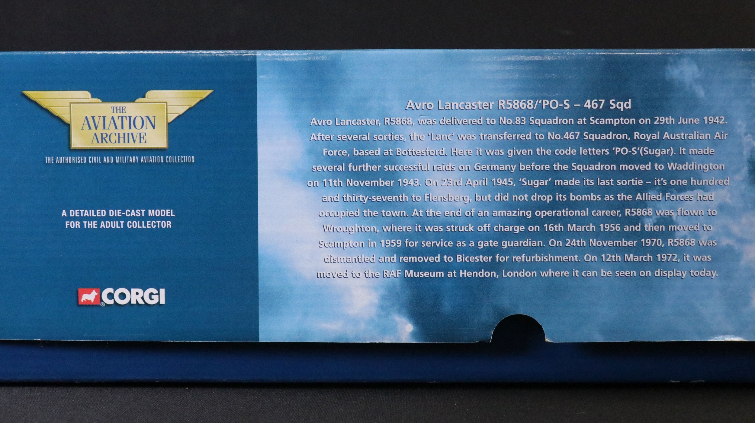 Boxed 1/72 Corgi Aviation Archive AA32601 Avro Lancaster R5868/'PO-S 467 Squadron diecast model, diecast ex and appearing complete, box vg