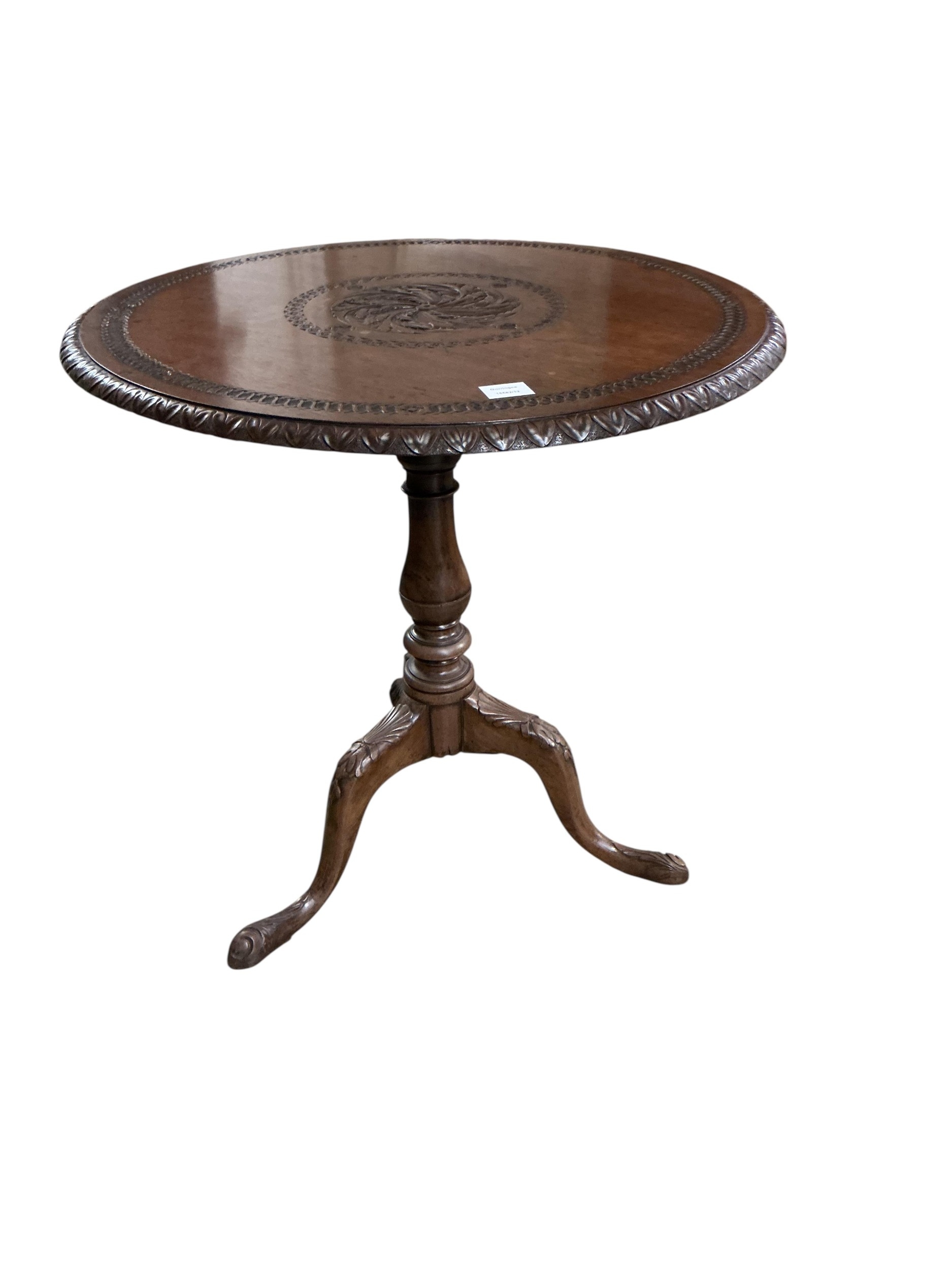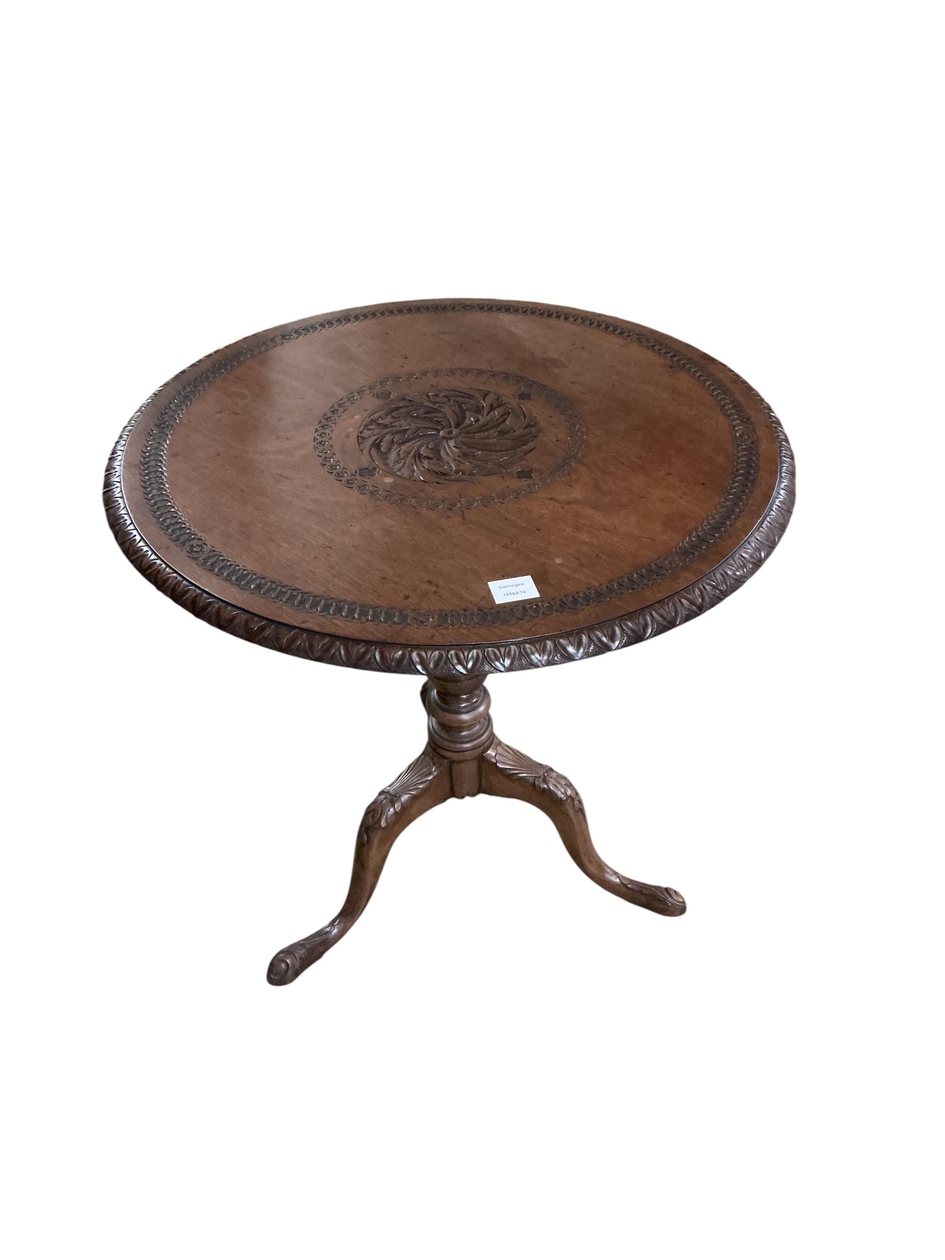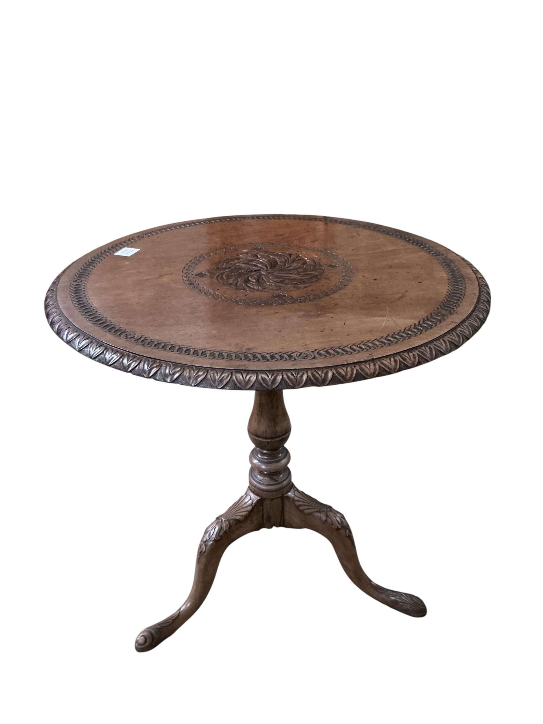 A George III and later mahogany circular tripod tea table, the carving later, diameter 73cm, height 73cm