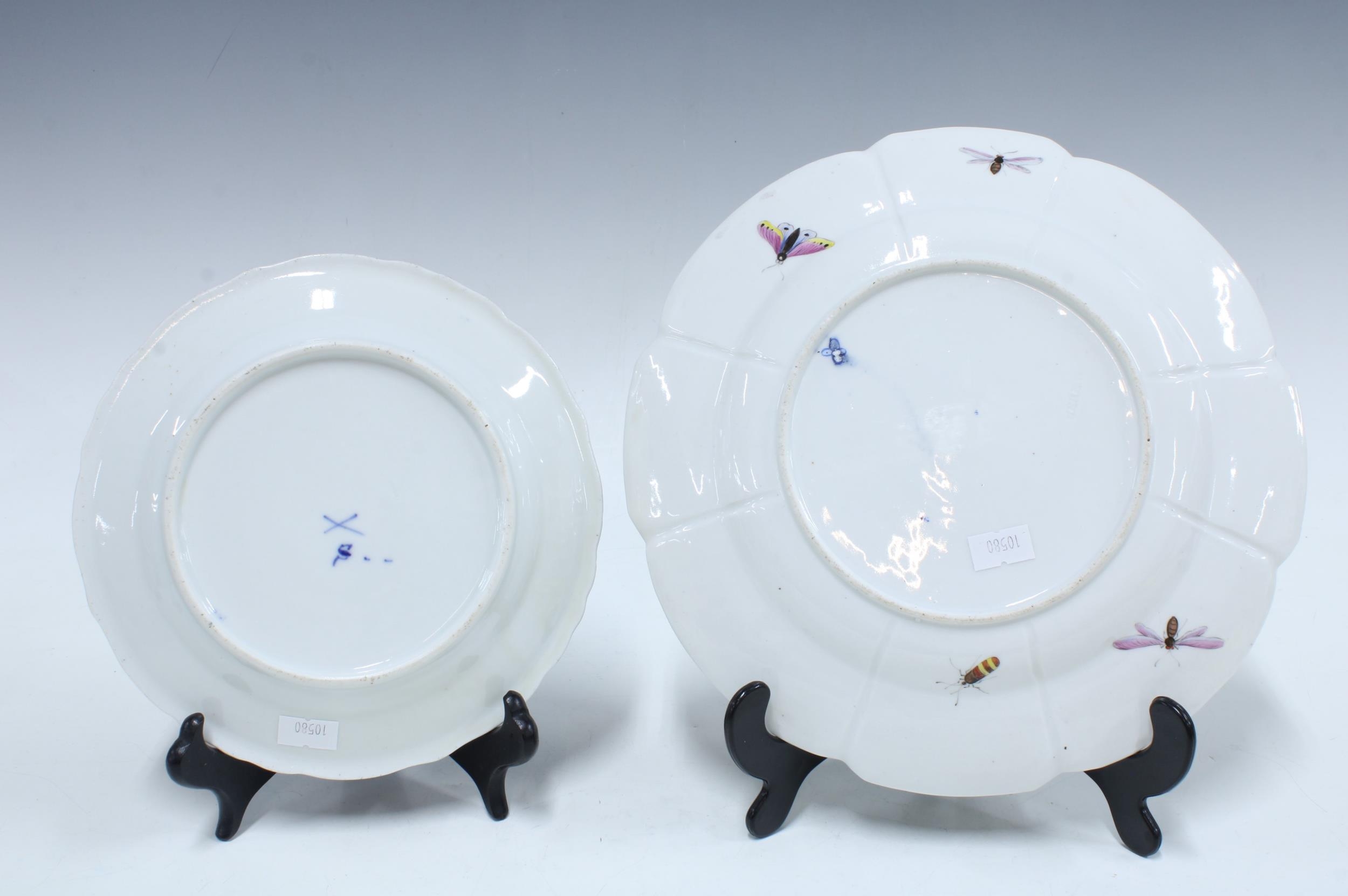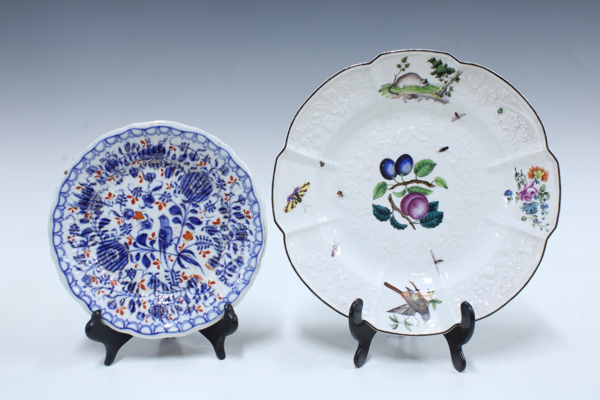 Continental porcelain plate with moulded fruit and vine decorated with fruit, insects, a cat etc, 25cm, together with a blue onion pattern plate (2)