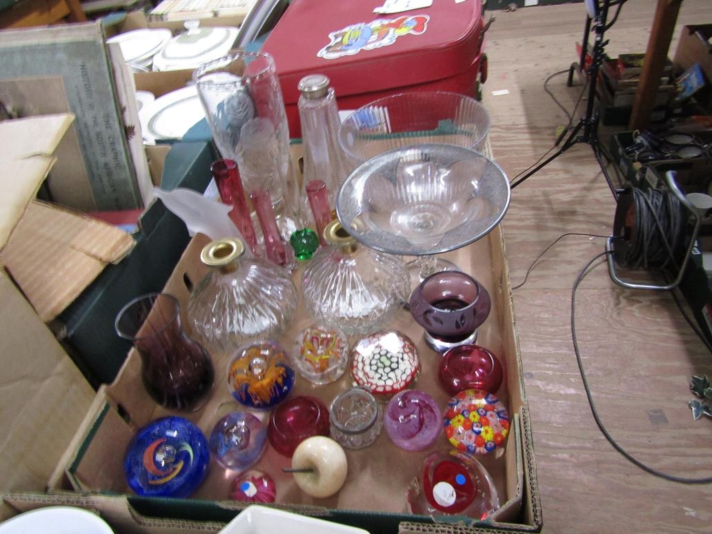 BOX OF GLASSWARE TO INCL PAPERWEIGHTS, VASES ETC