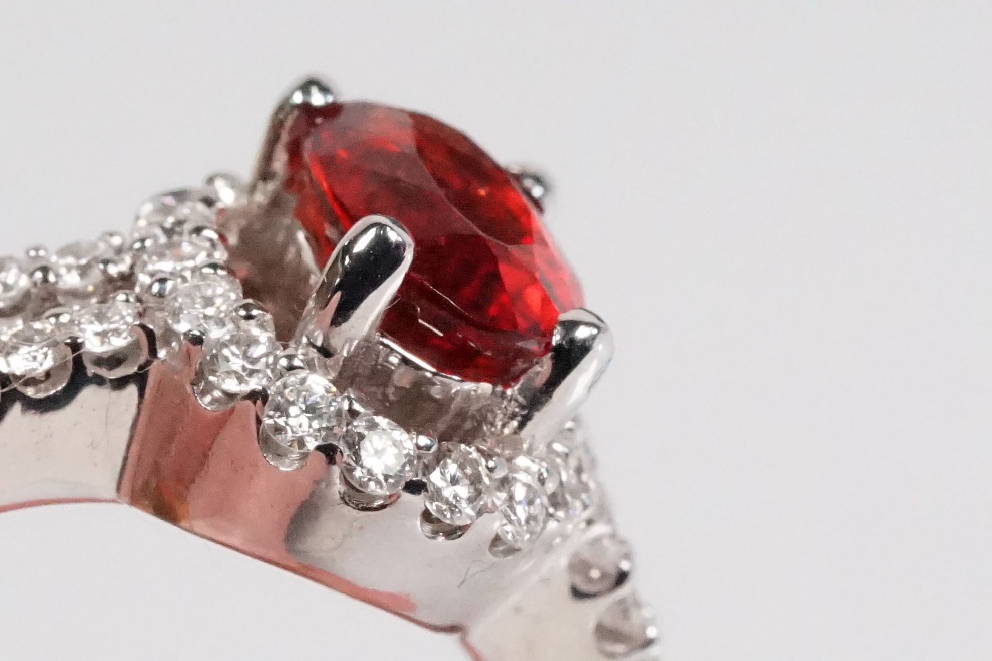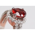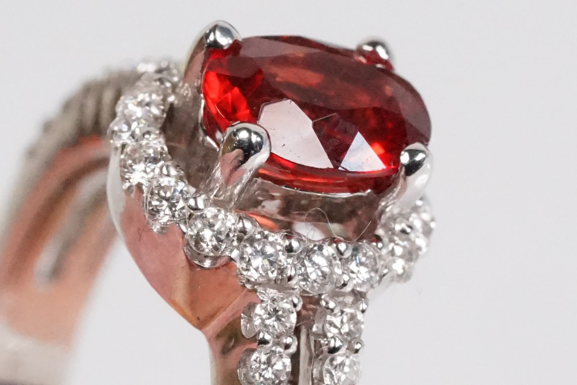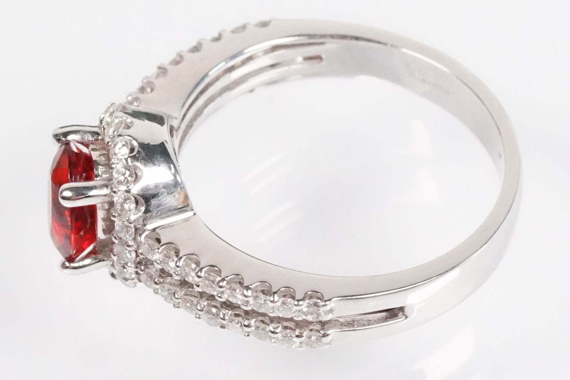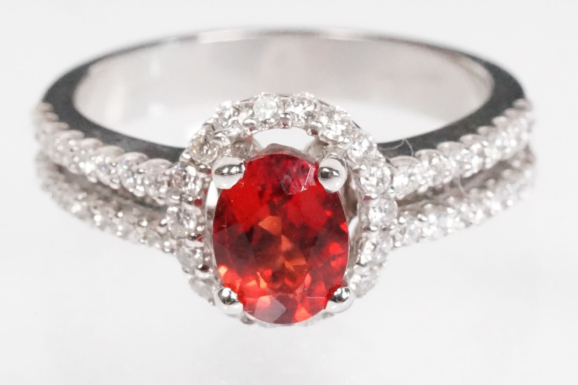 18ct gold red Andesine feldspar and diamond dress ring. The ring being set with an oval red a Andesine (type of Feldspar closely related to Sunstone) with a halo of round cut diamonds to the head and two rows of diamonds to the shoulders. Hallmarked London 2007. Size P. Diamonds estimated 0.60ct in total.
