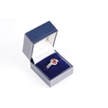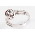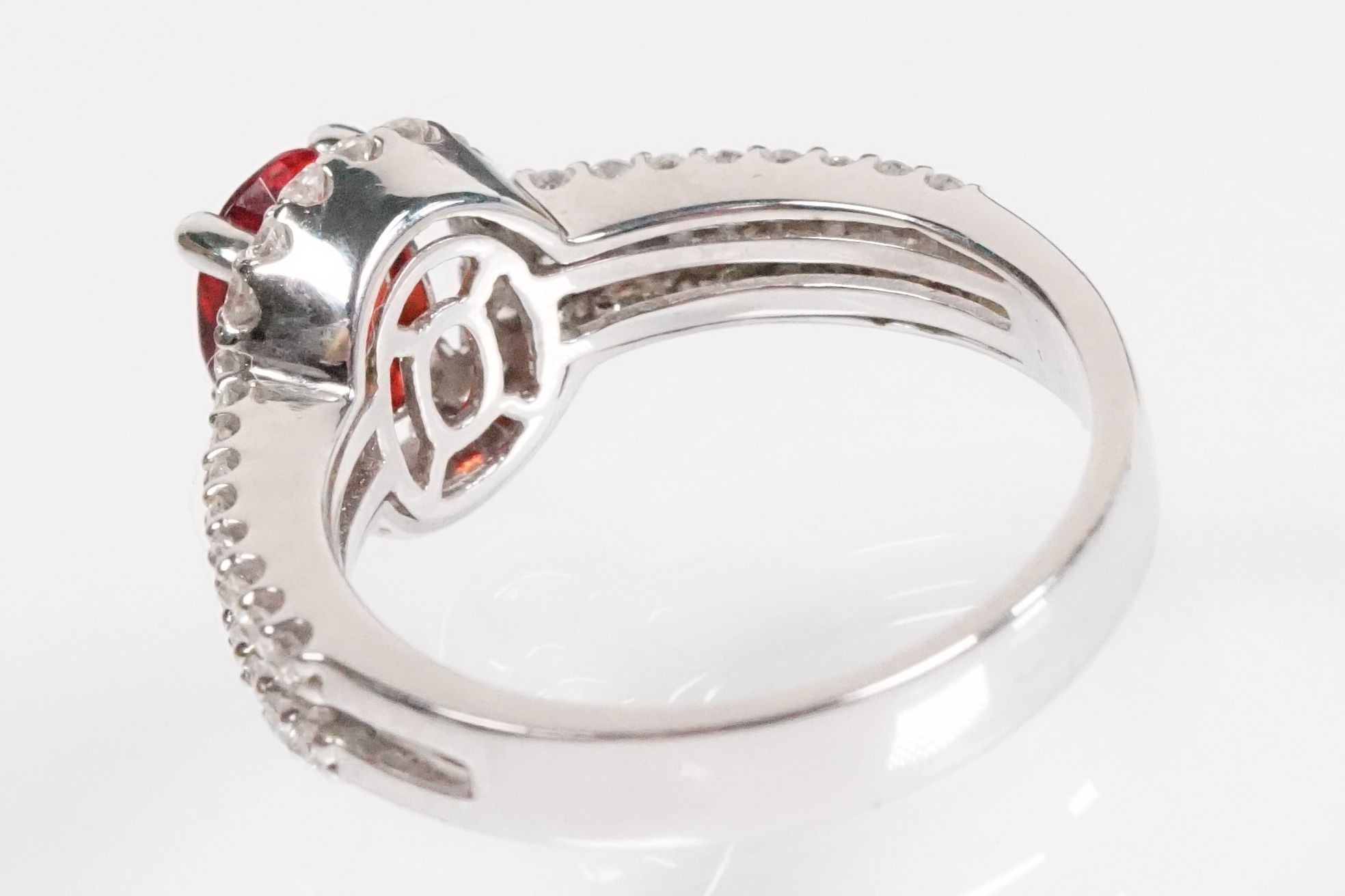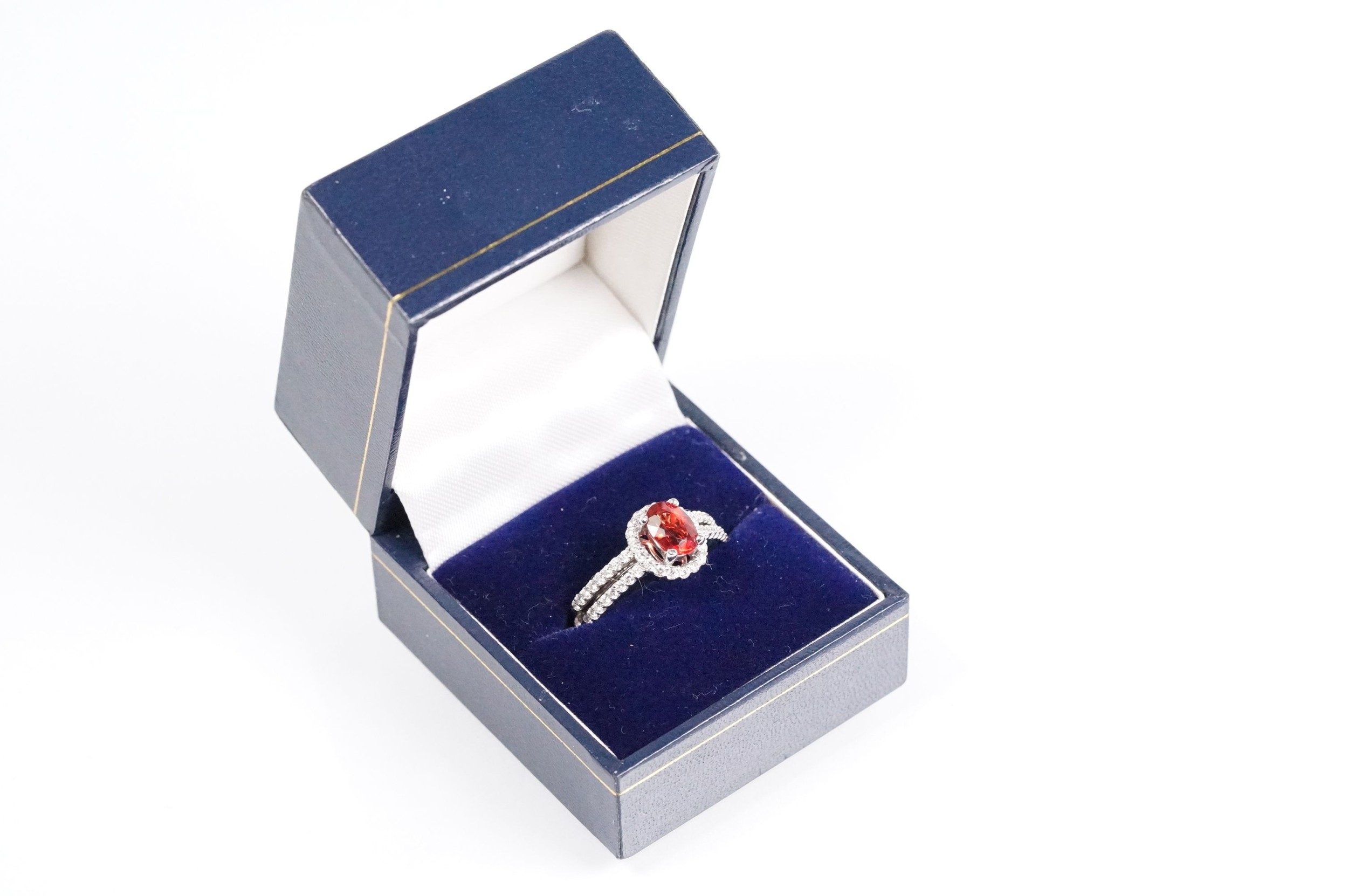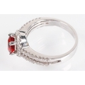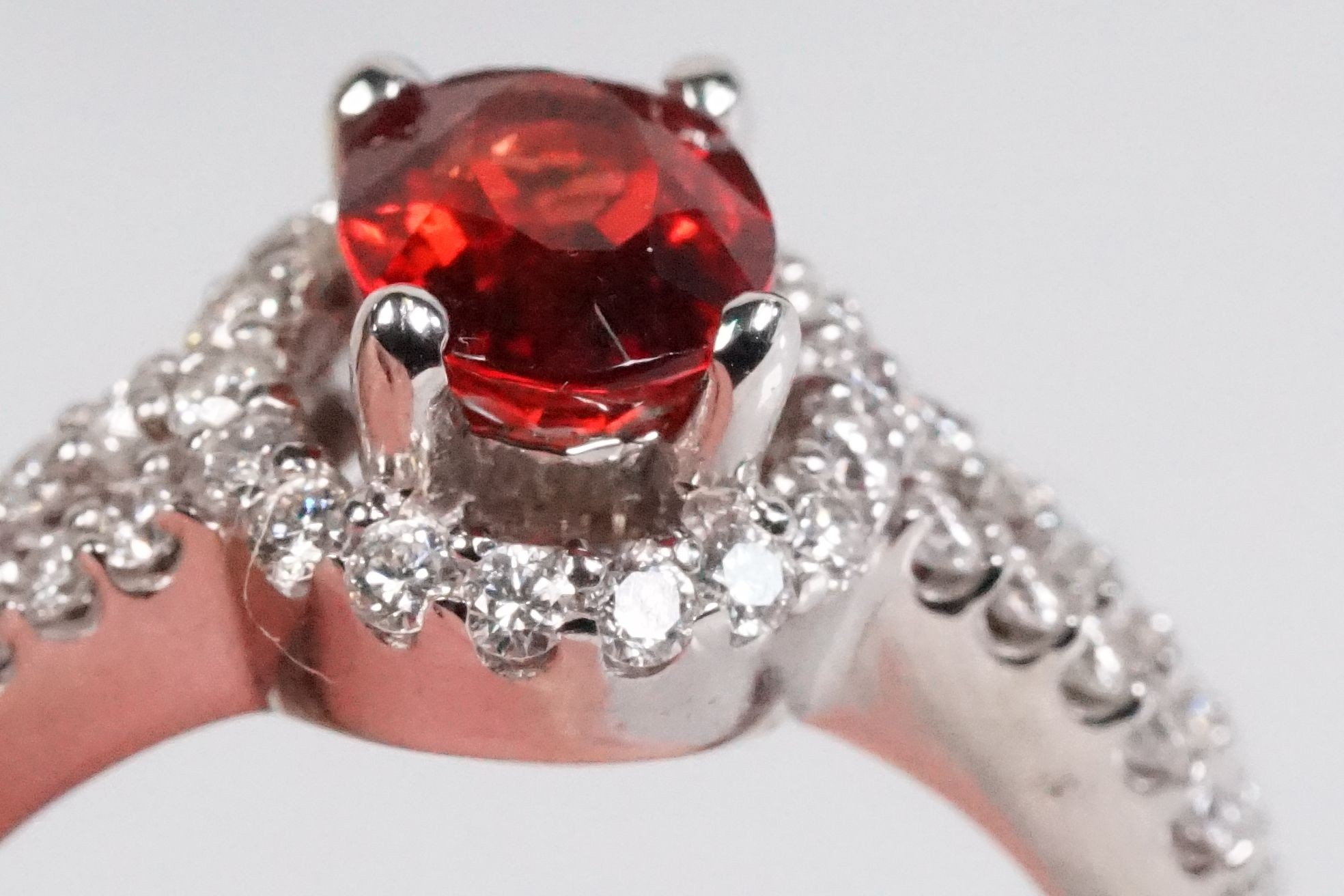 18ct gold red Andesine feldspar and diamond dress ring. The ring being set with an oval red a Andesine (type of Feldspar closely related to Sunstone) with a halo of round cut diamonds to the head and two rows of diamonds to the shoulders. Hallmarked London 2007. Size P. Diamonds estimated 0.60ct in total.