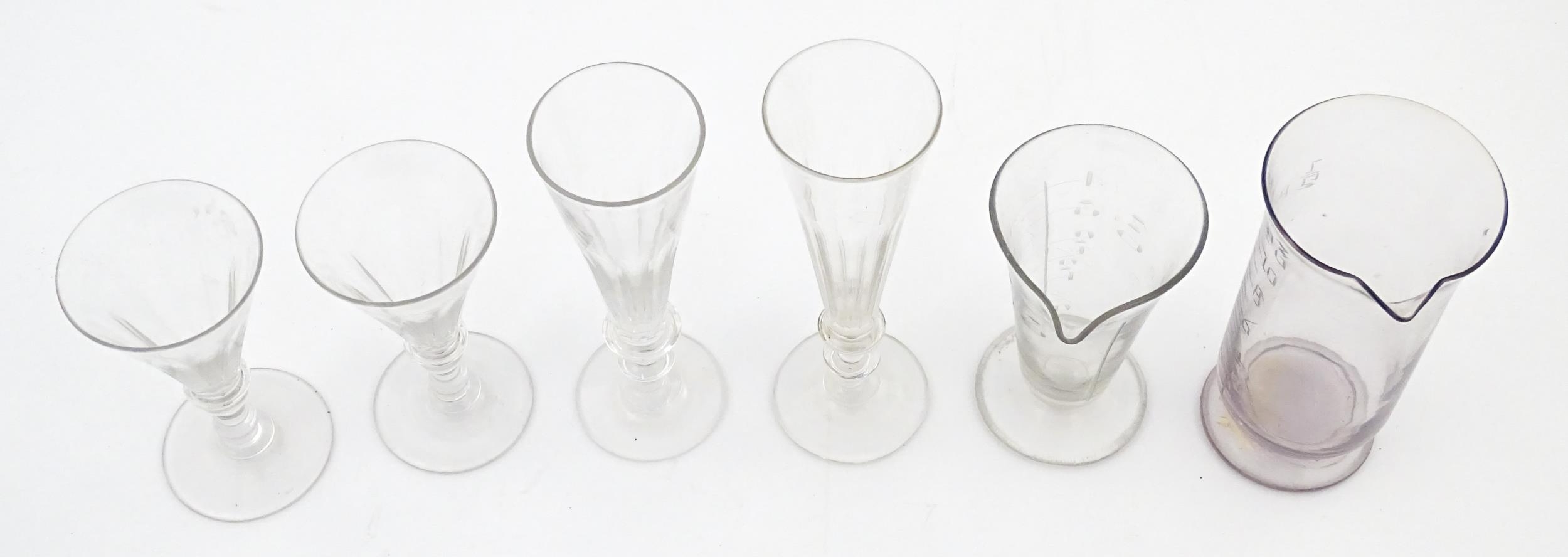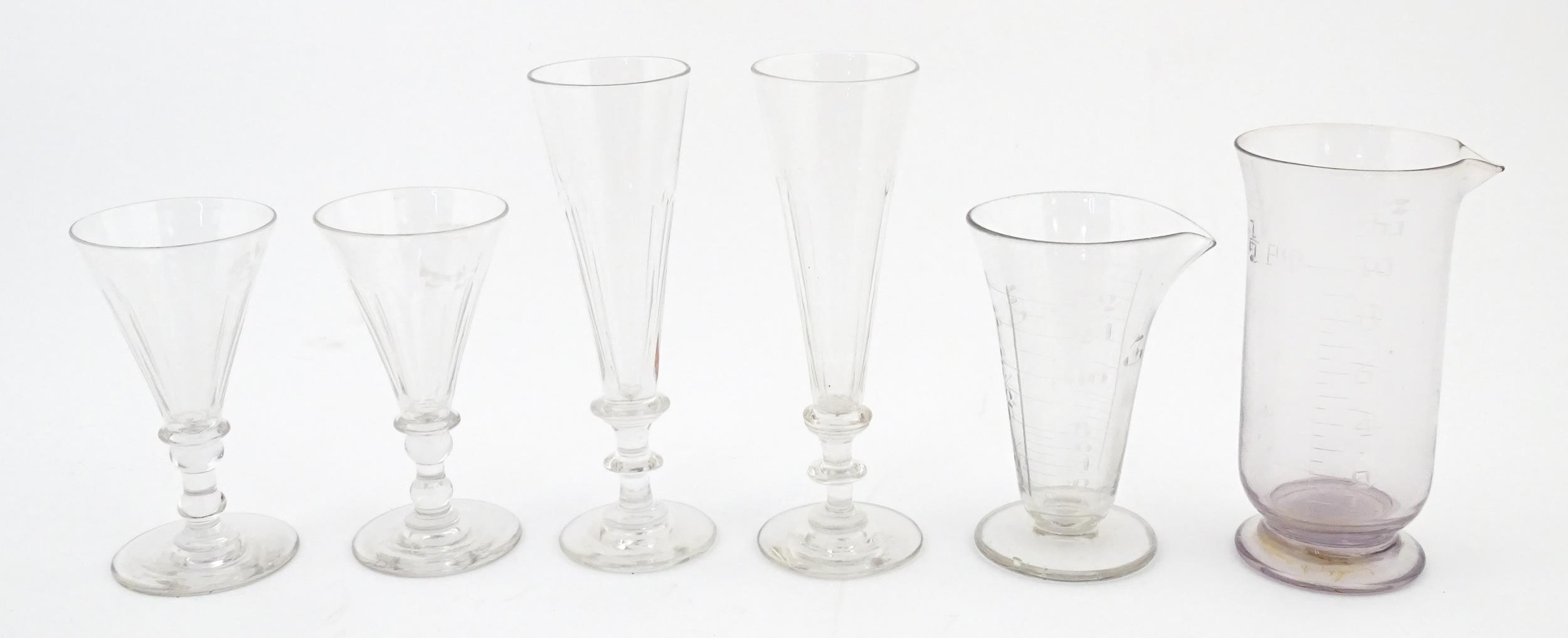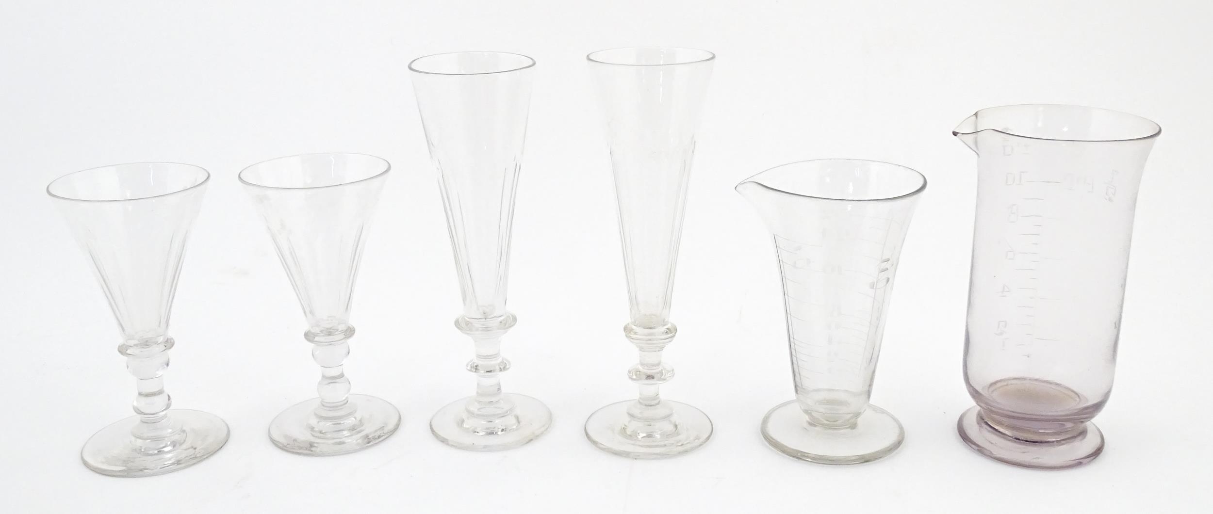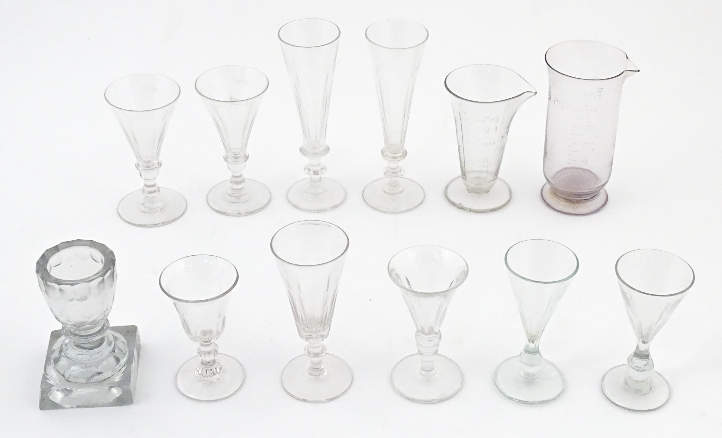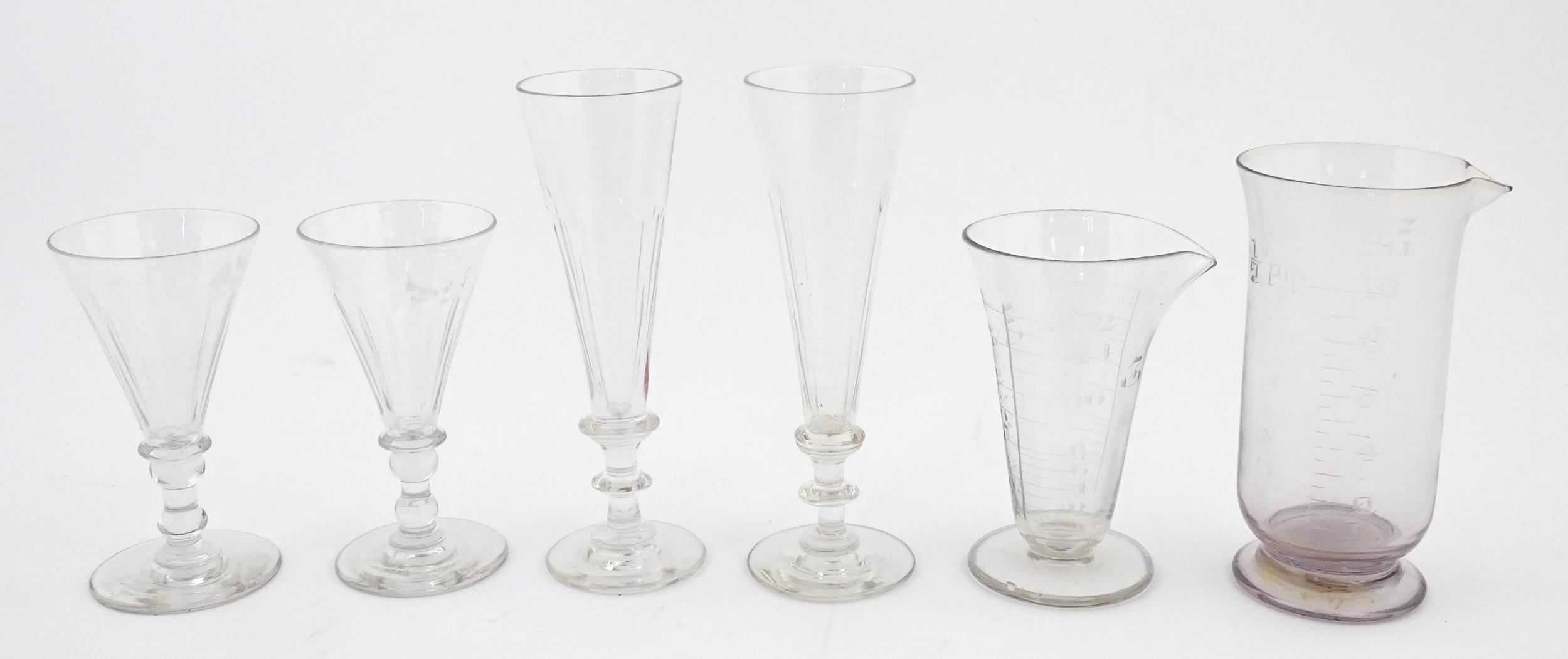 A quantity of assorted 19thC and later drinking glasses together with two measuring jugs / beakers with etched scales. Largest approx. 7" high