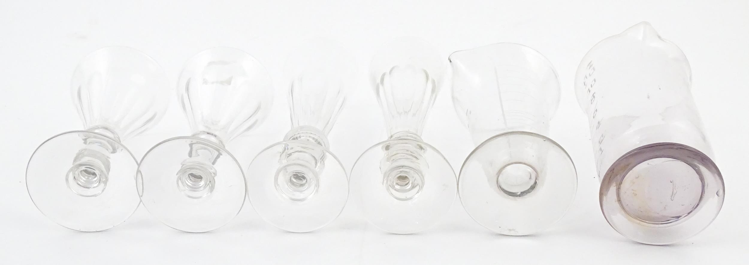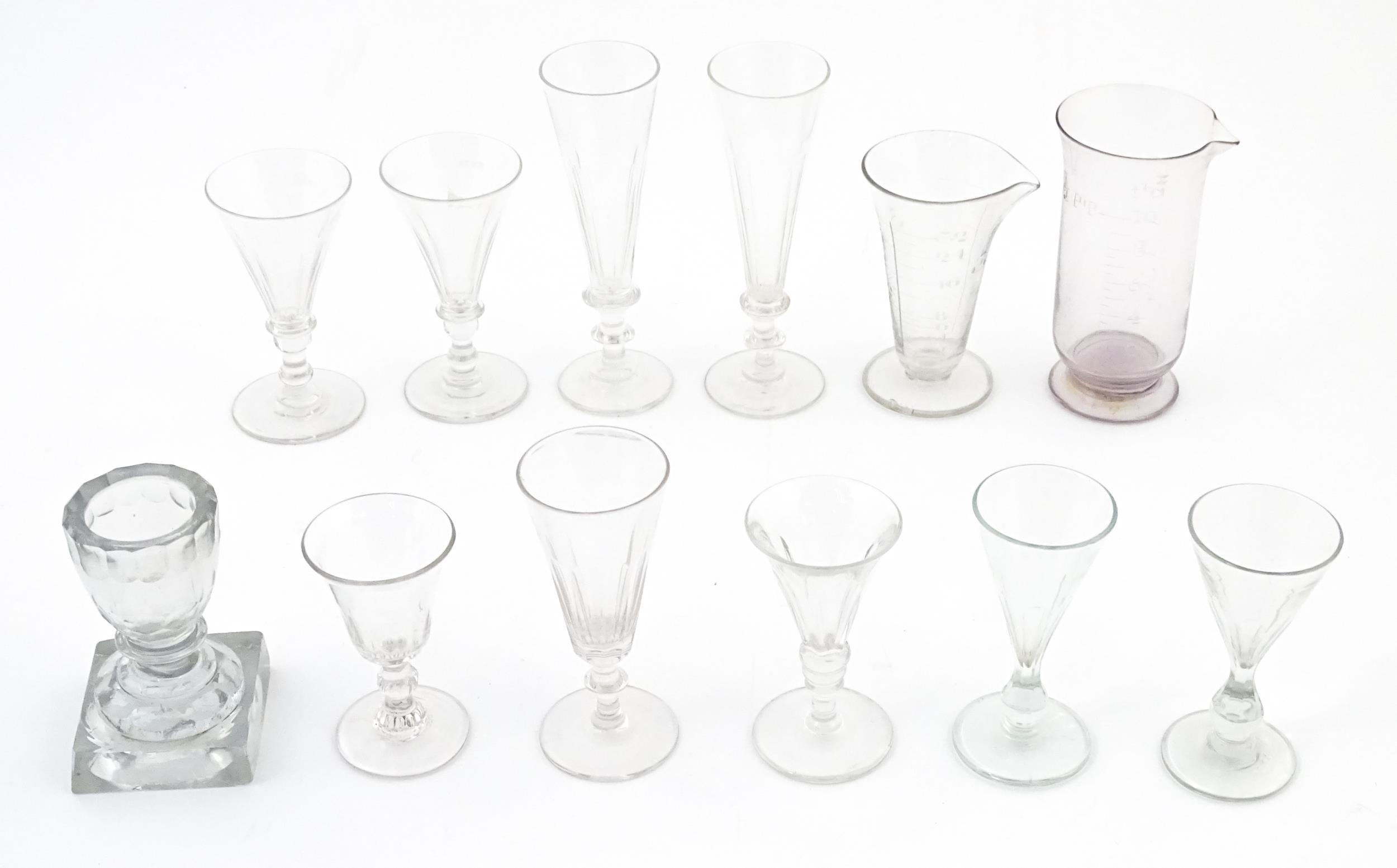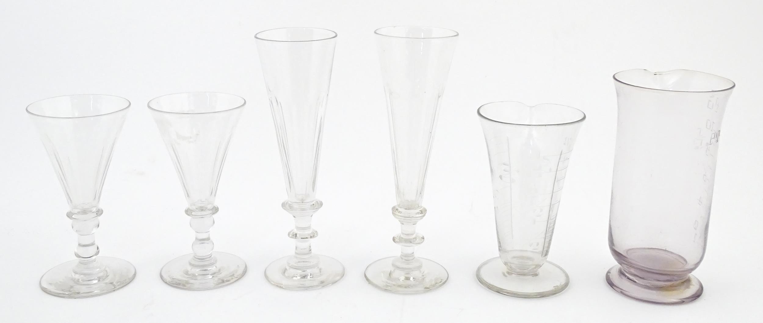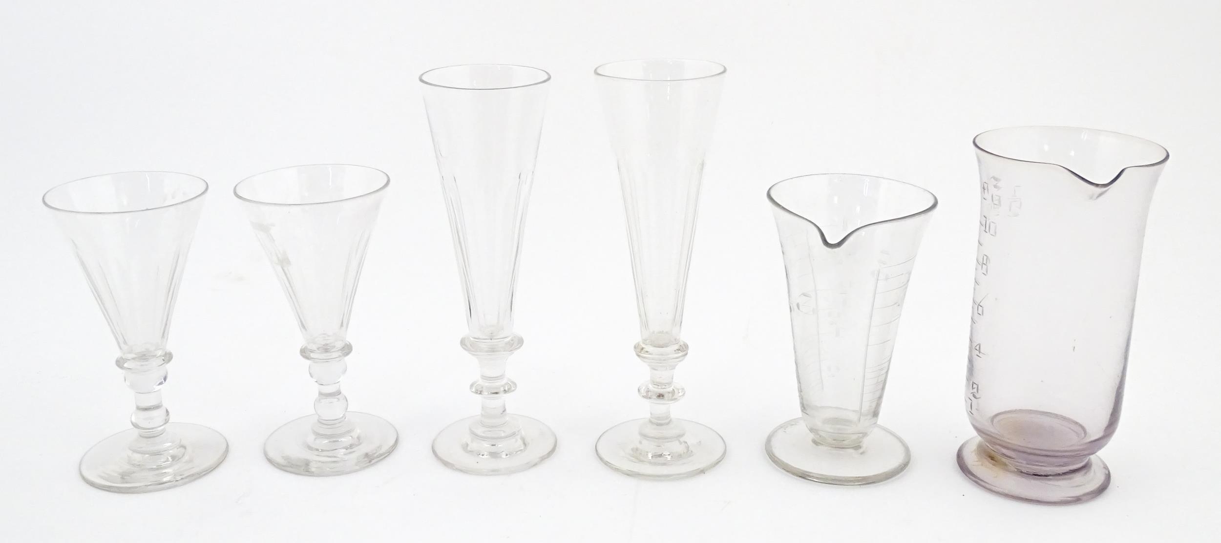 A quantity of assorted 19thC and later drinking glasses together with two measuring jugs / beakers with etched scales. Largest approx. 7" high