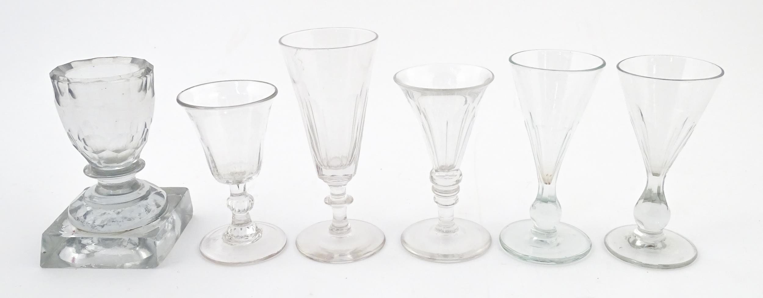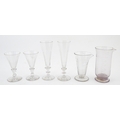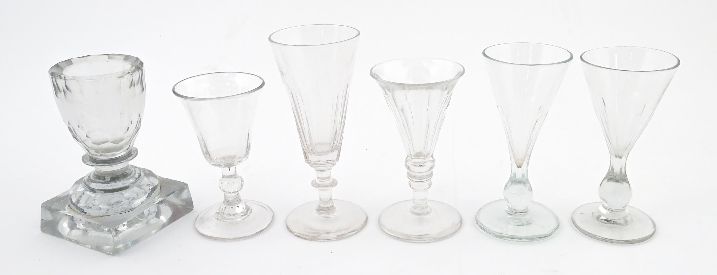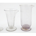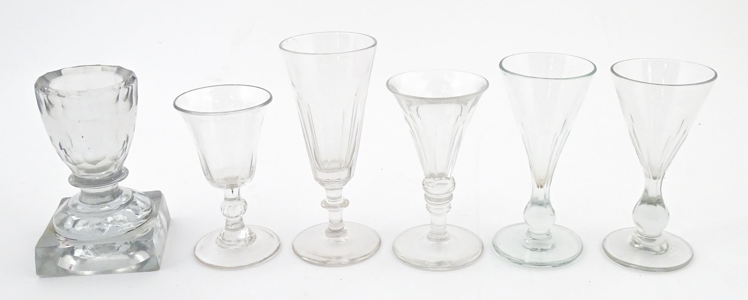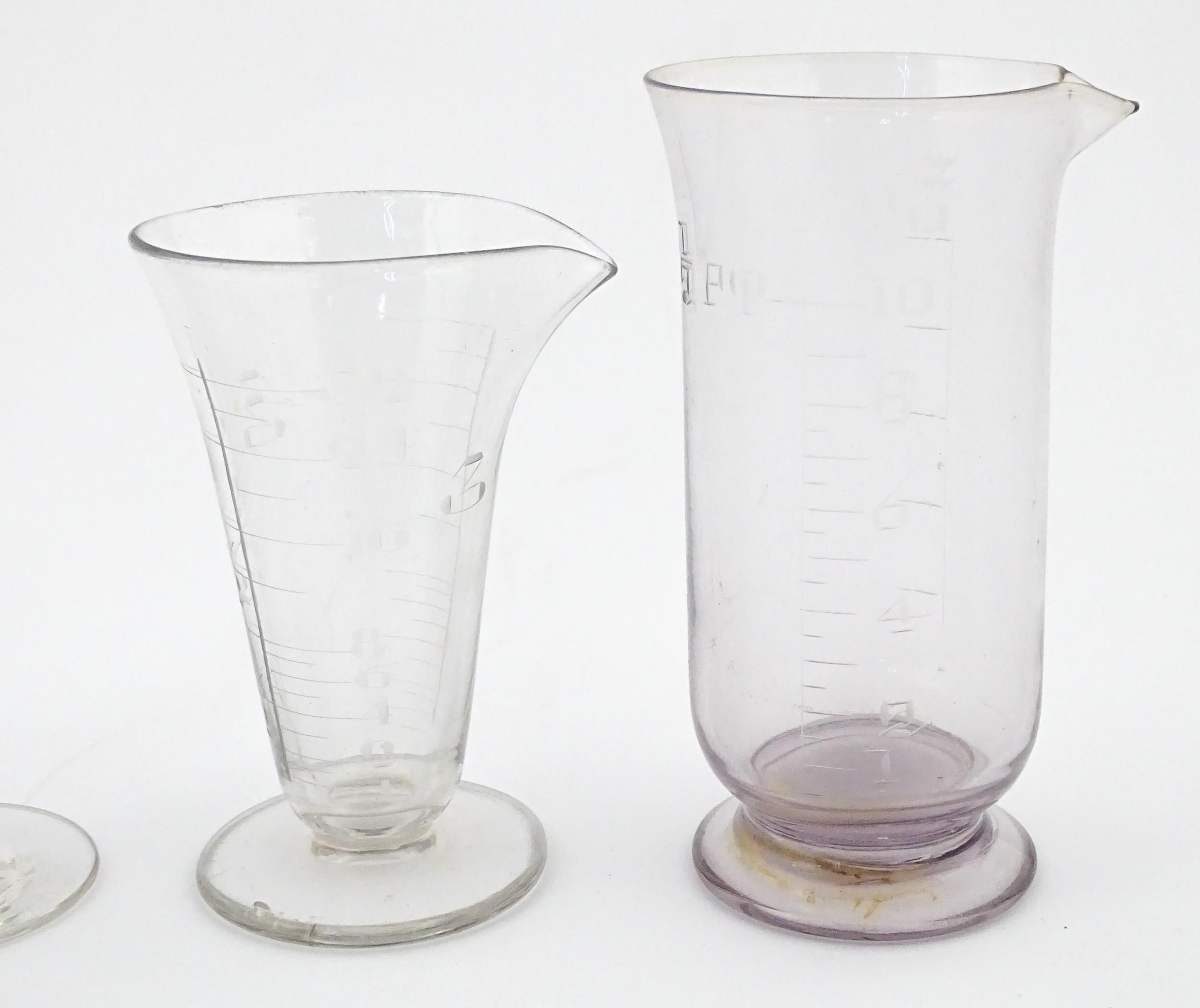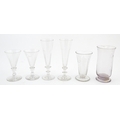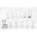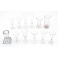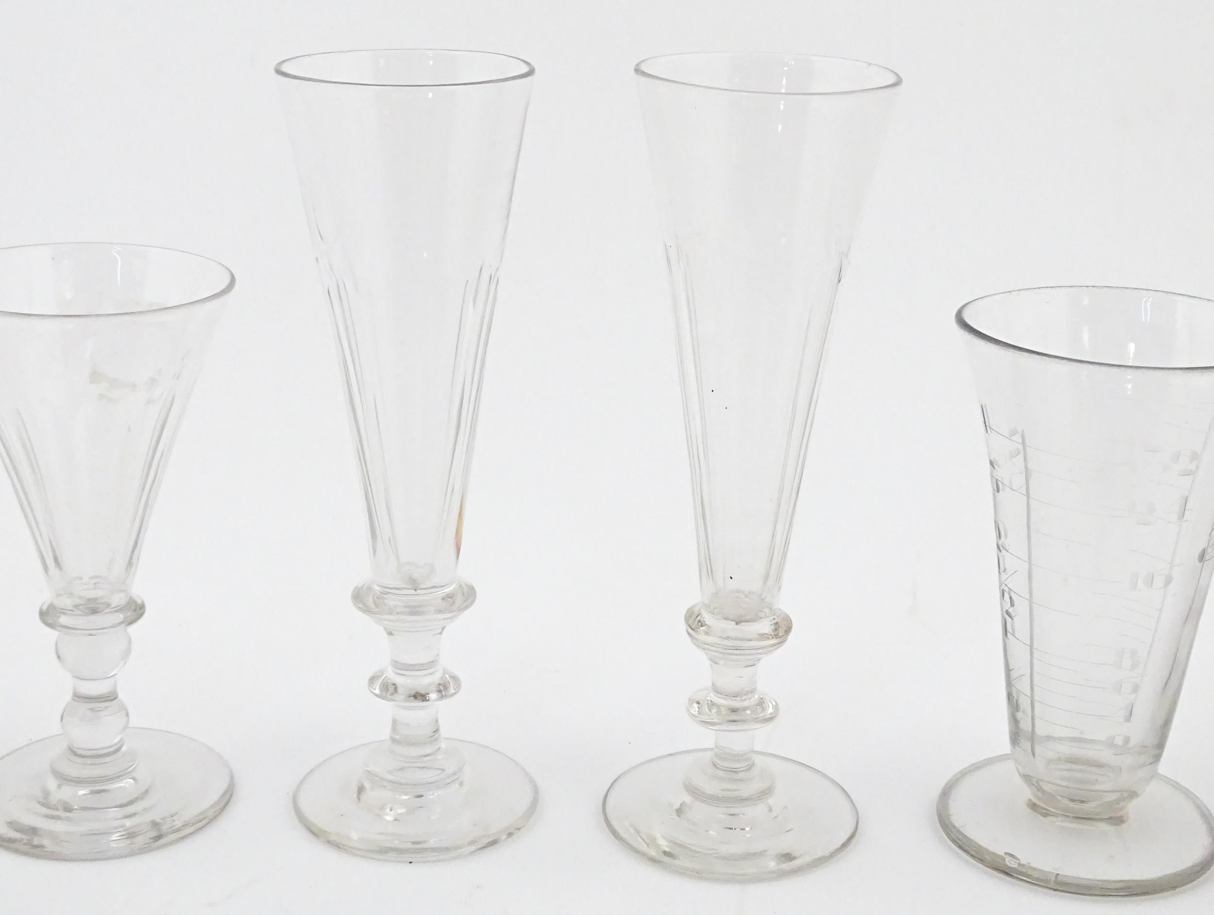 A quantity of assorted 19thC and later drinking glasses together with two measuring jugs / beakers with etched scales. Largest approx. 7" high