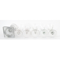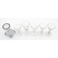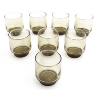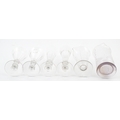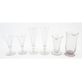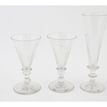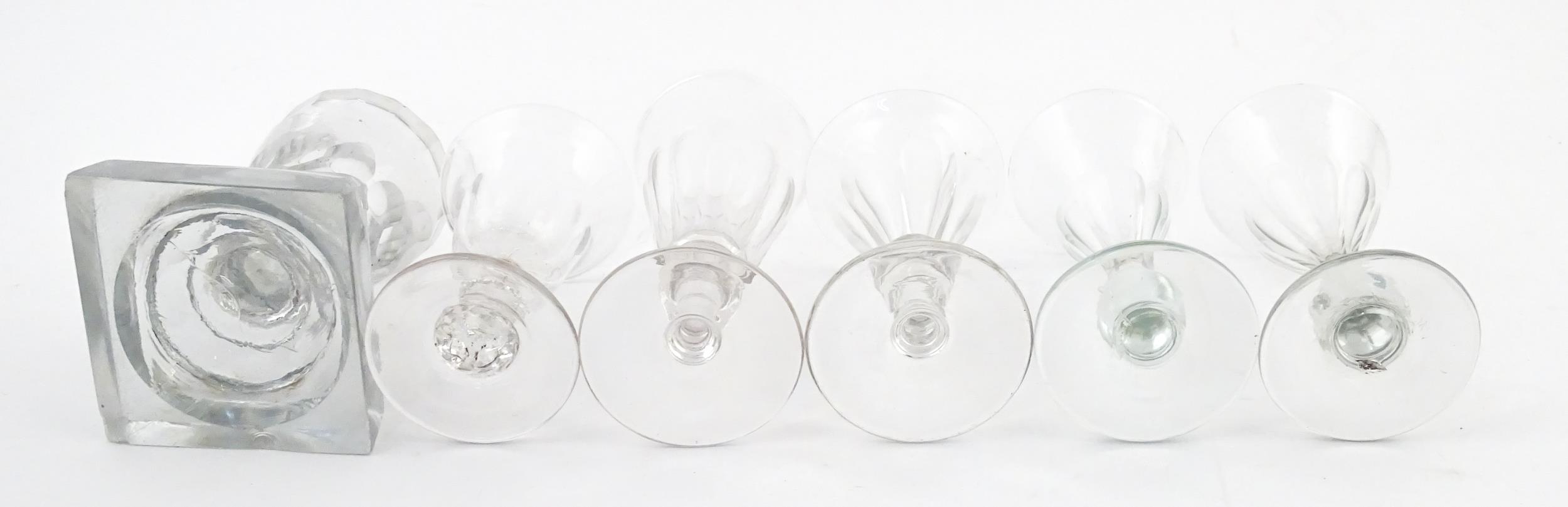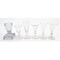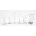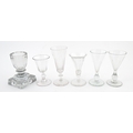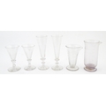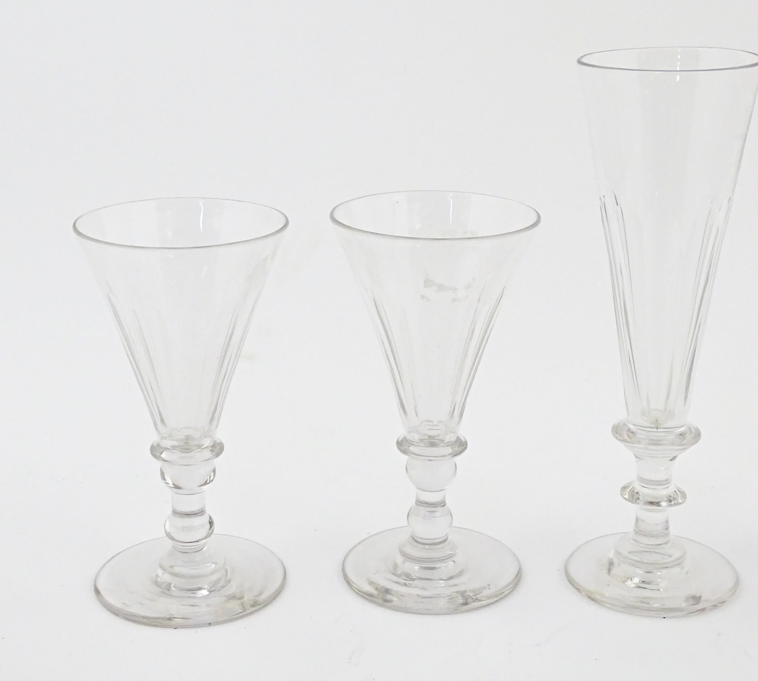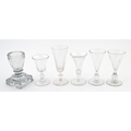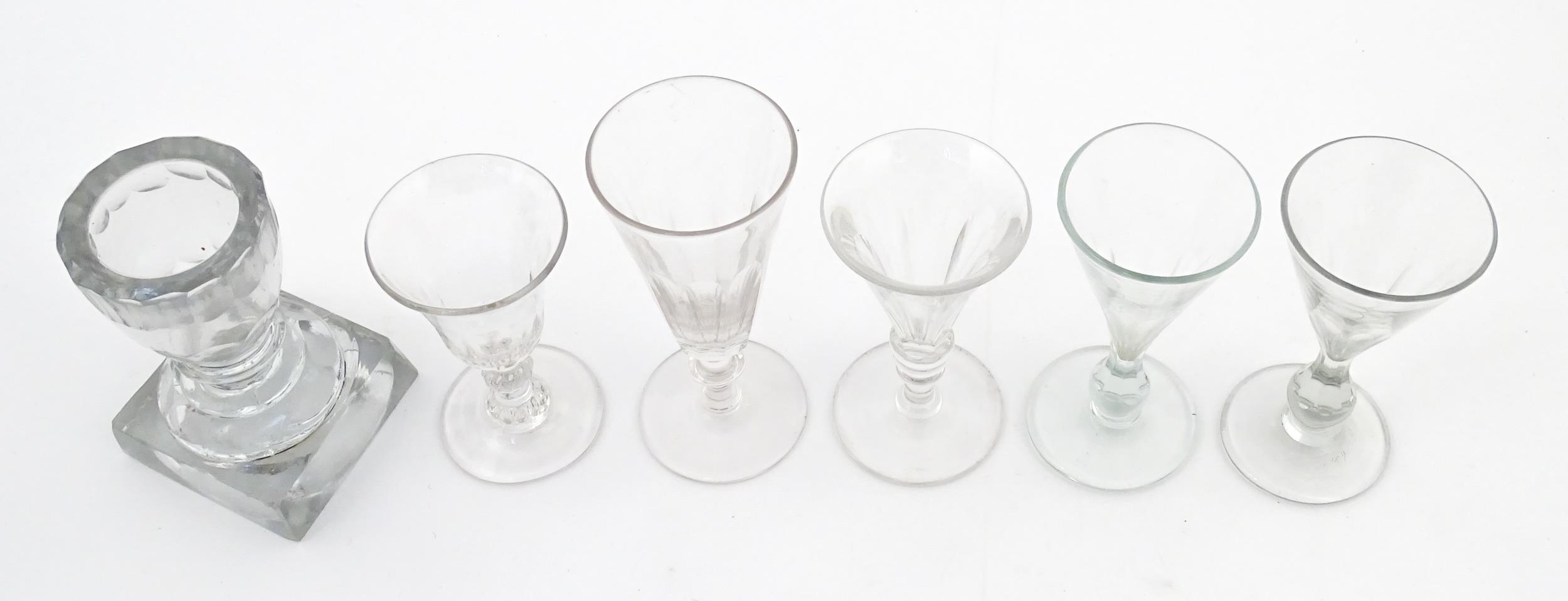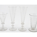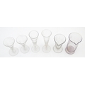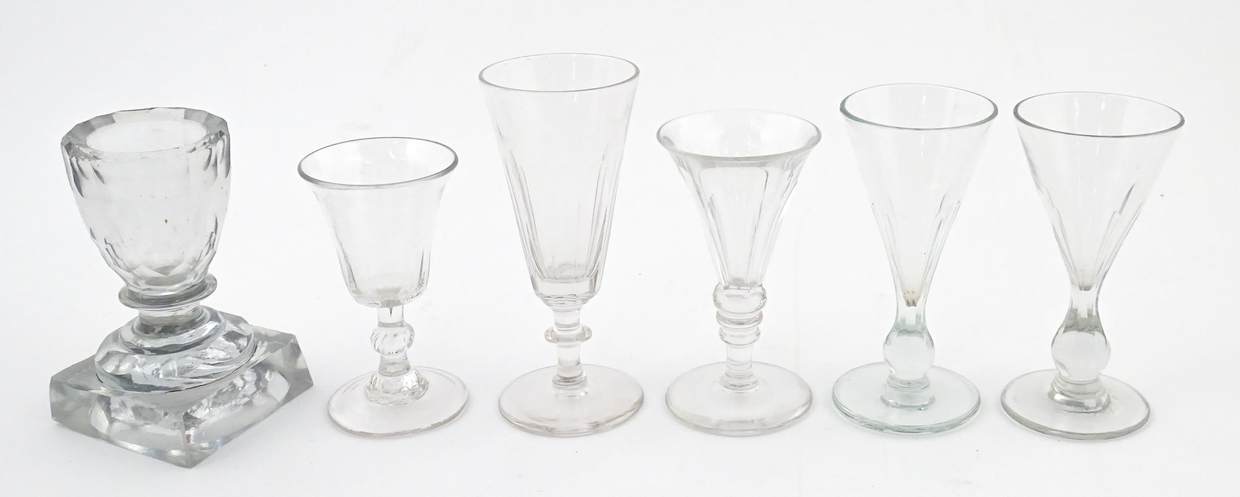 A quantity of assorted 19thC and later drinking glasses together with two measuring jugs / beakers with etched scales. Largest approx. 7" high