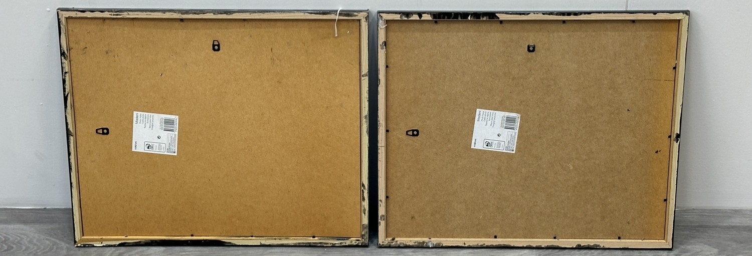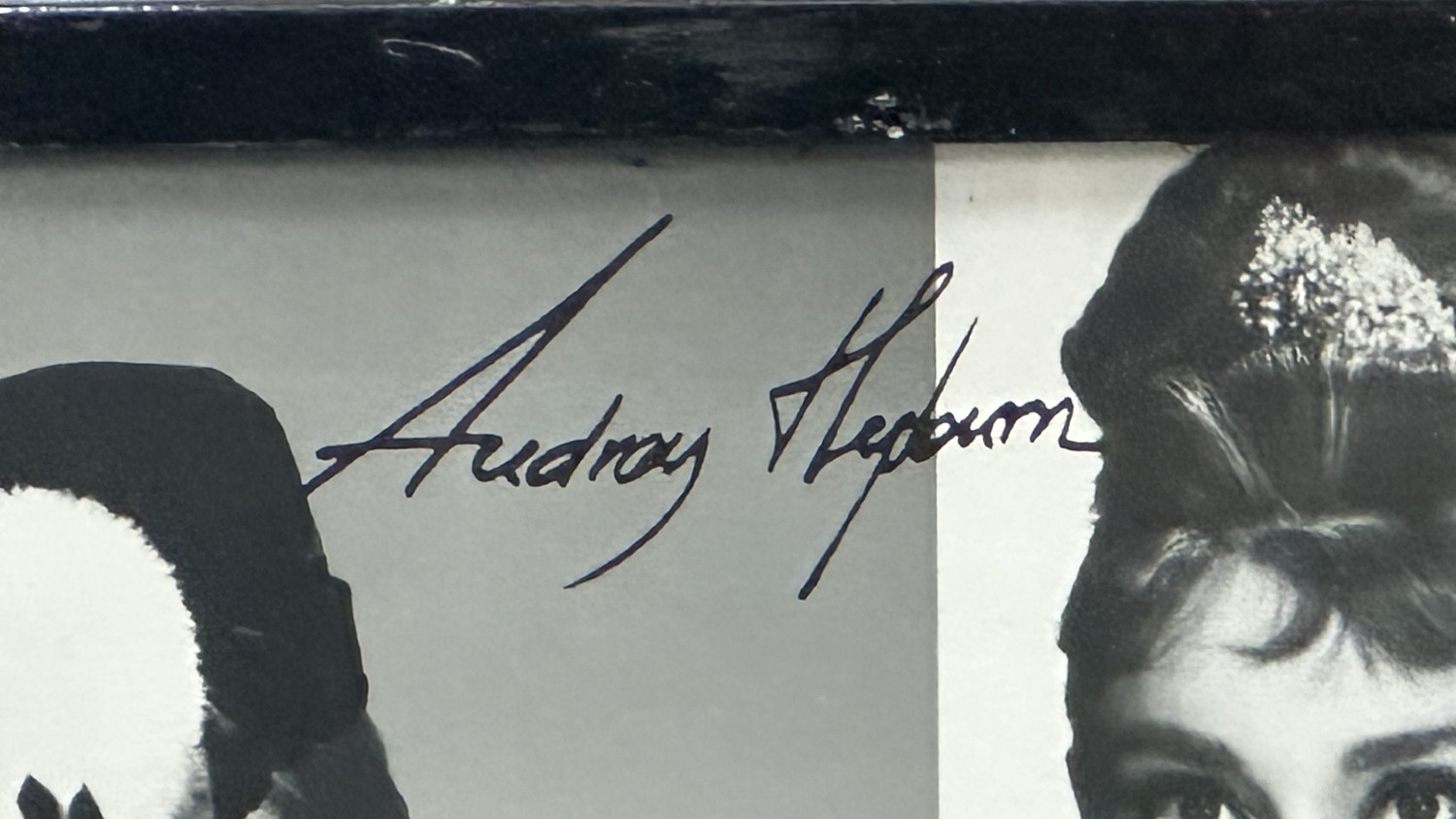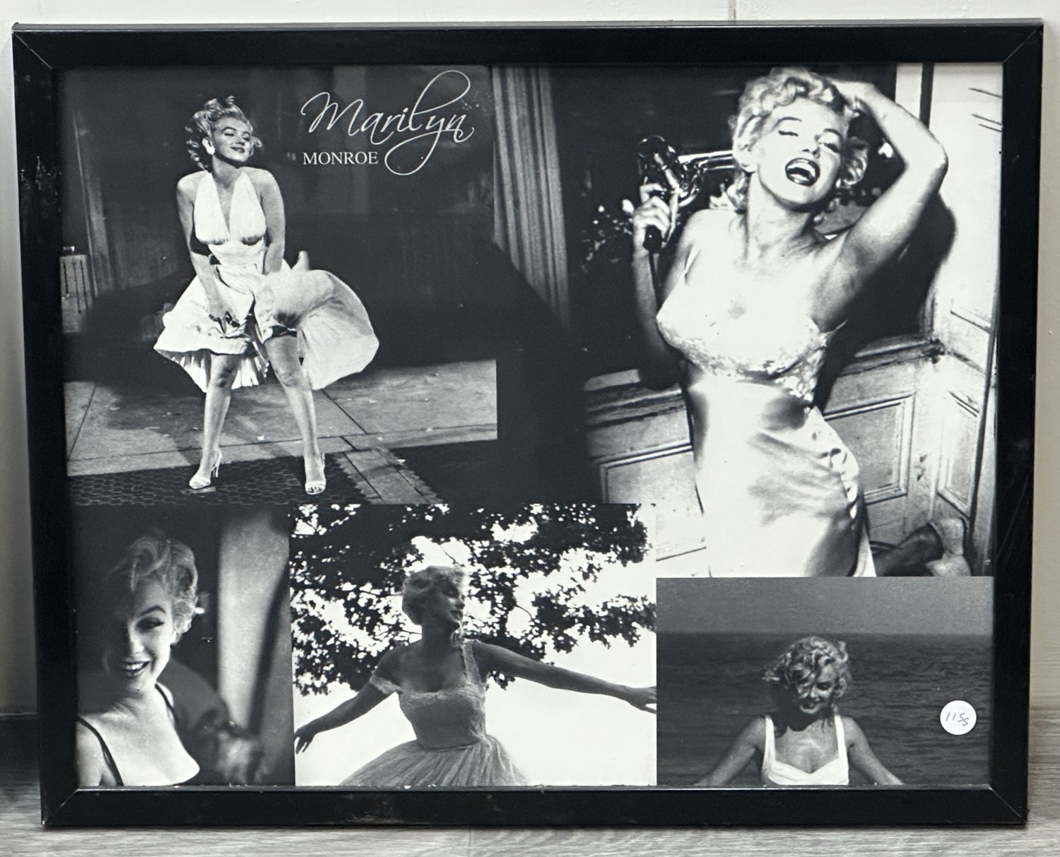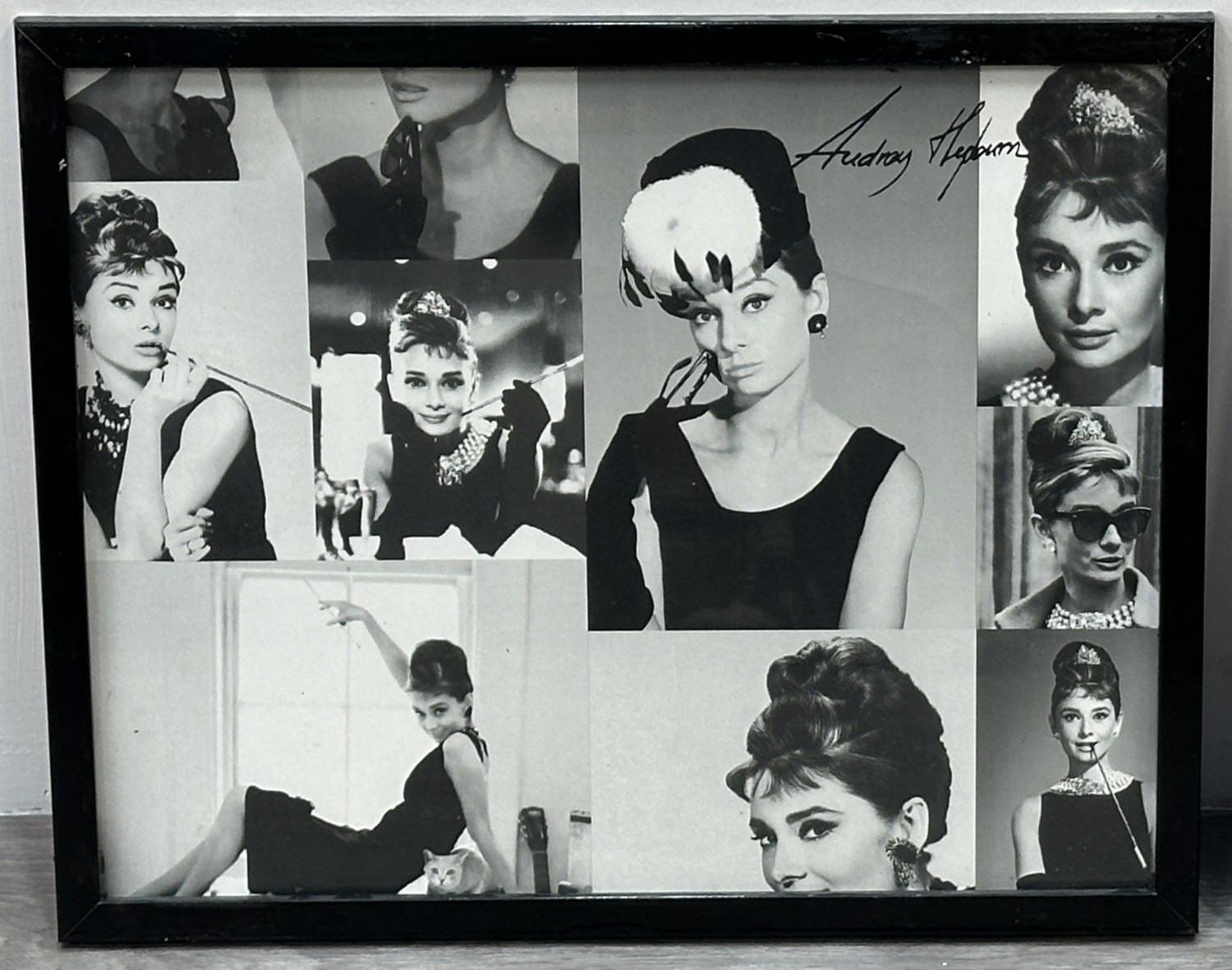 Two framed black and white collage prints, one Marilyn Monroe and one Audrey Hepburn - approx. 43cm high x 53cm wide