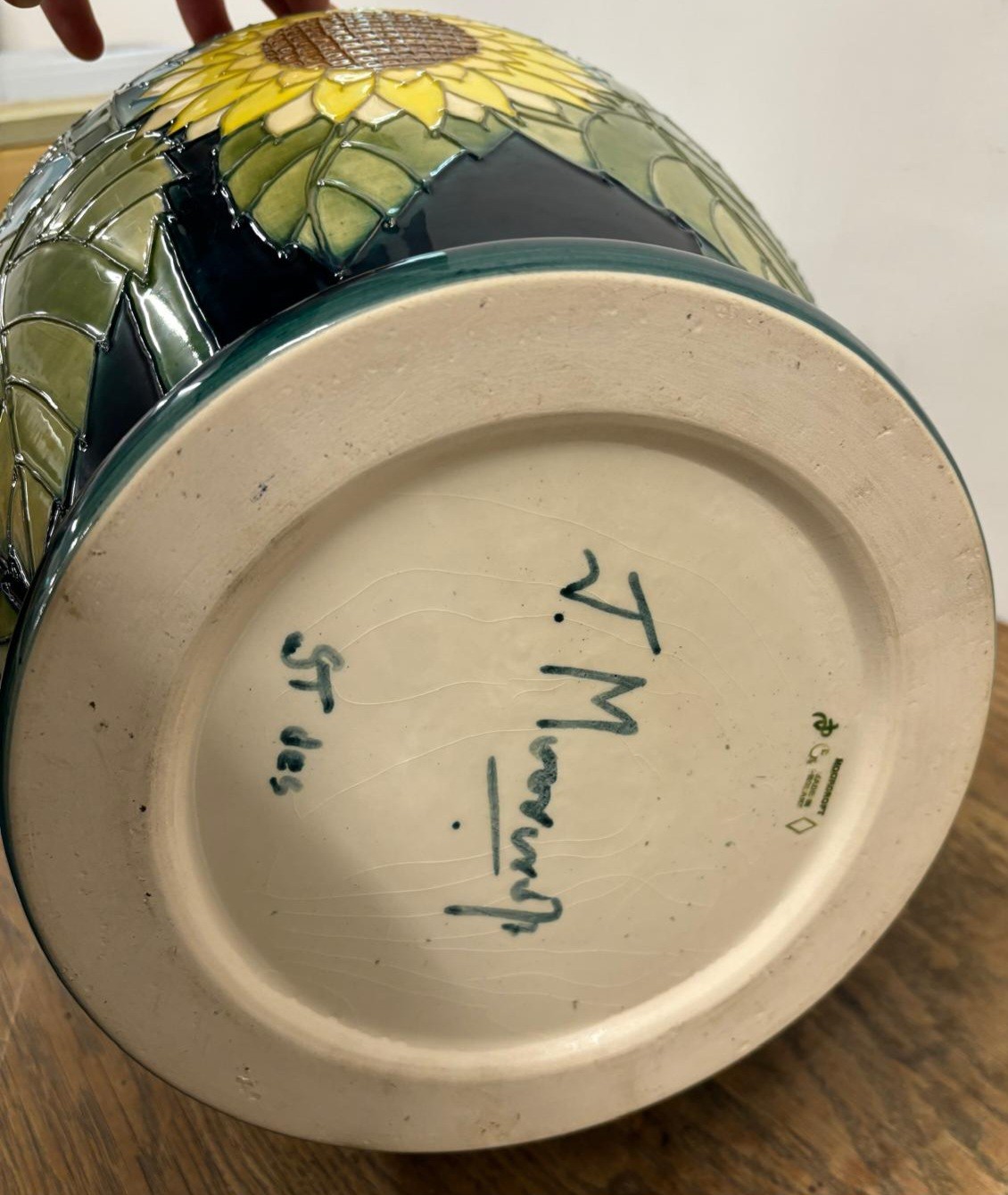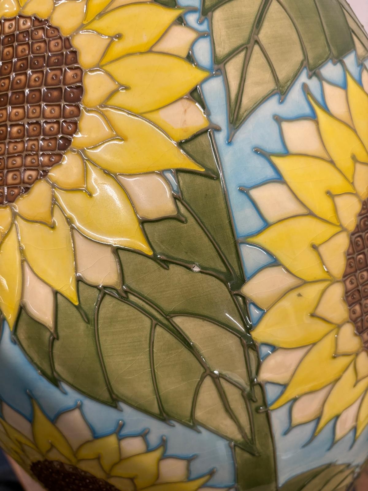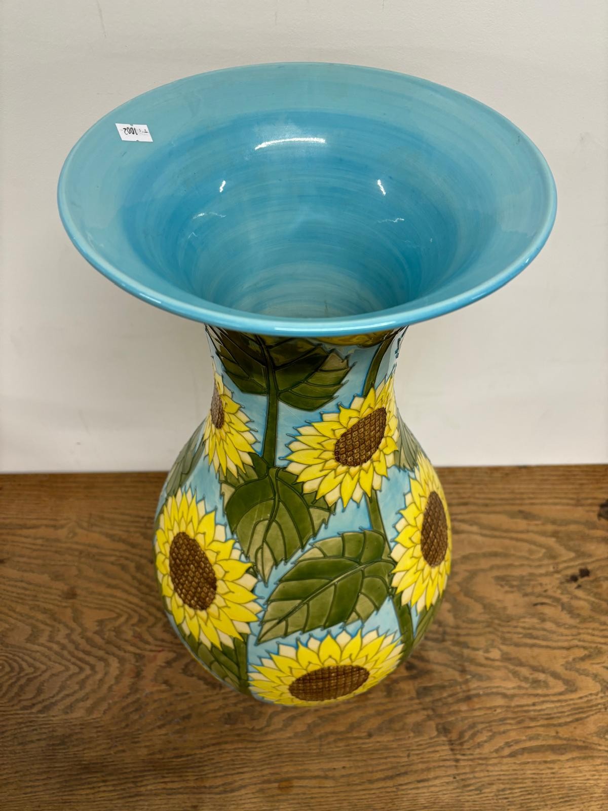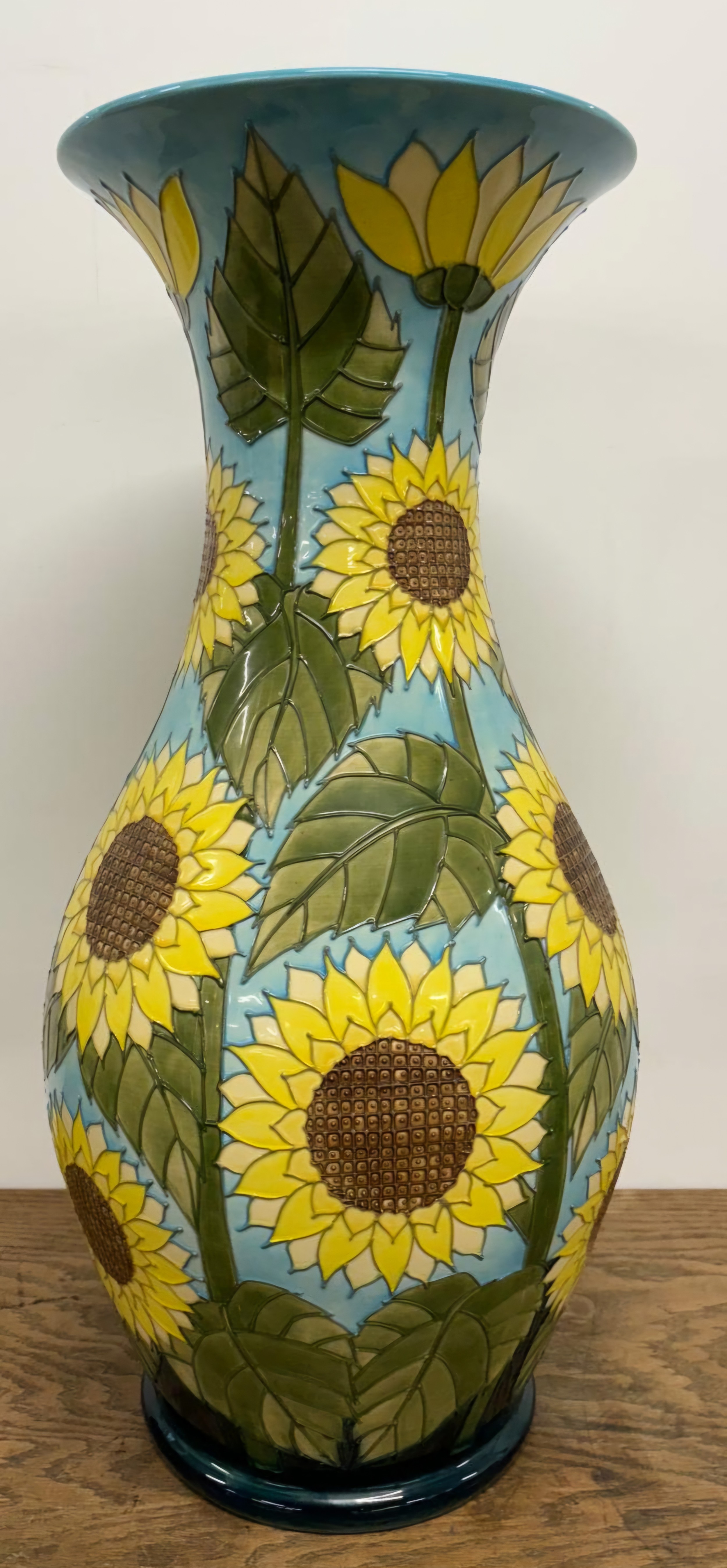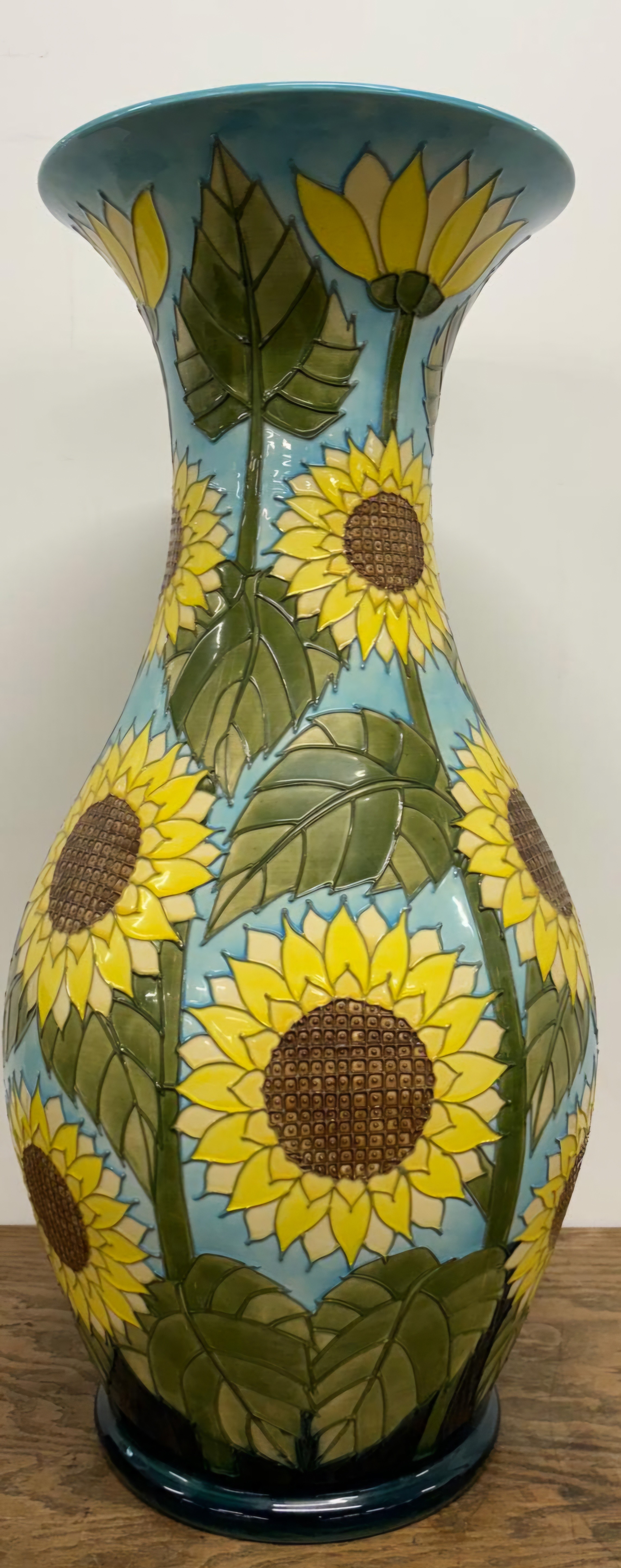 Large and impressive Moorcroft sunflowers pattern vase, Signed J Moorcroft. [Small Chip to tube line work- see images] [67.5cm high]