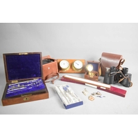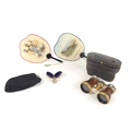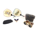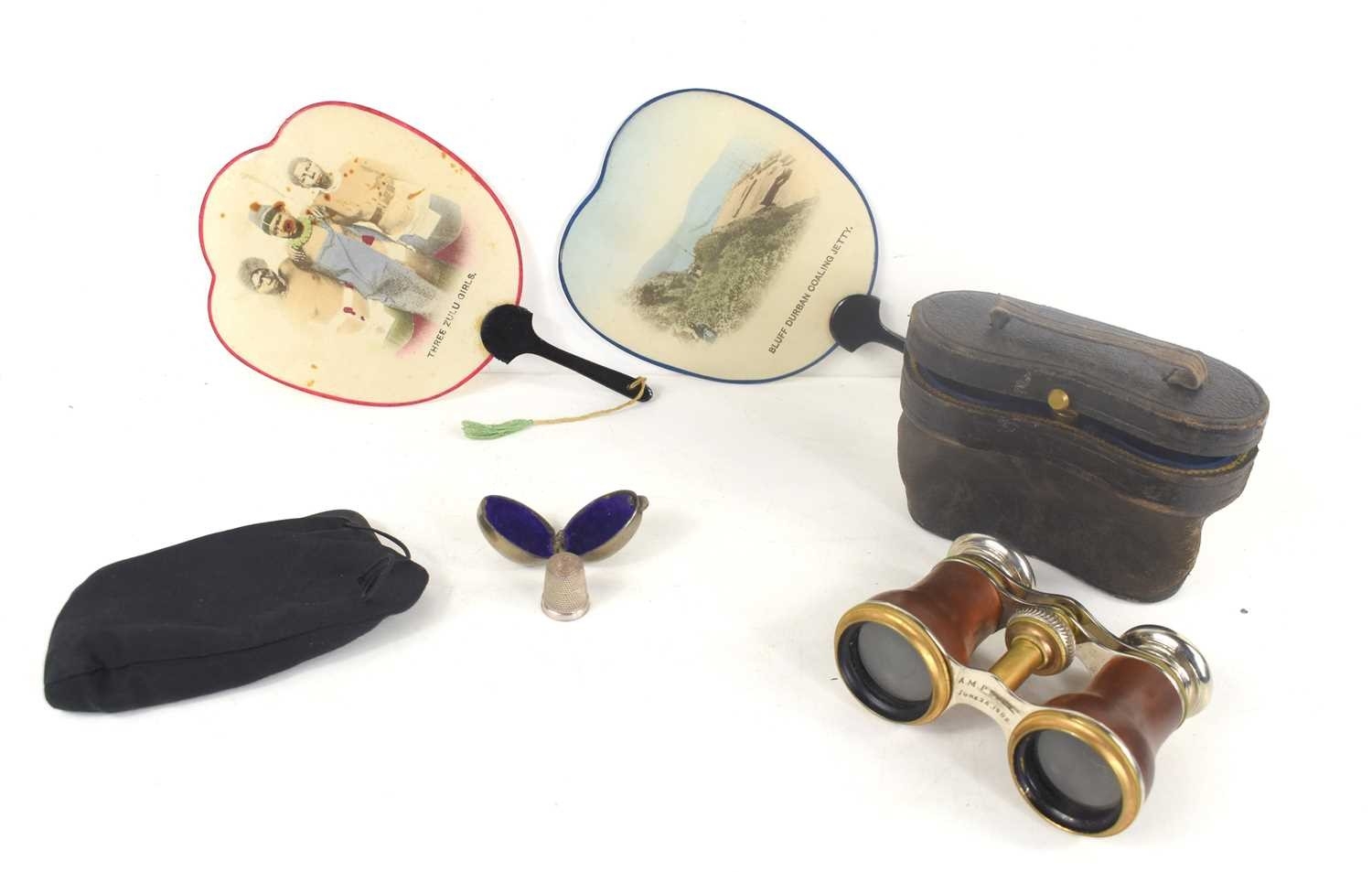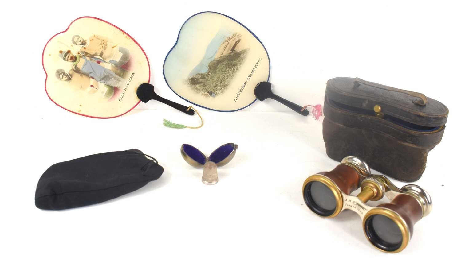 A group of collectables comprising a silver thimble housed in a silver plated case, two African tourist made hand fans, a coin purse and a pair of cased opera glasses.