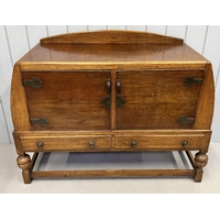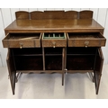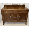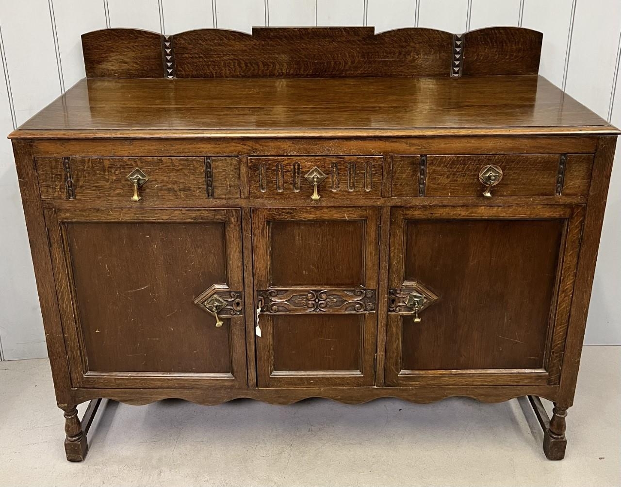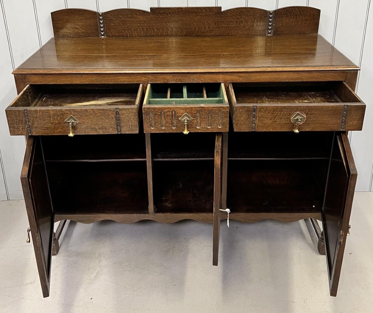 An Edwardian oak buffet sideboard. Three drawers, over triple cupboard. Central cutlery drawer. Key present. Dimensions(cm) H110, W136, D50.