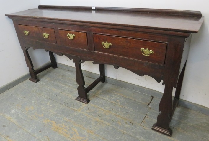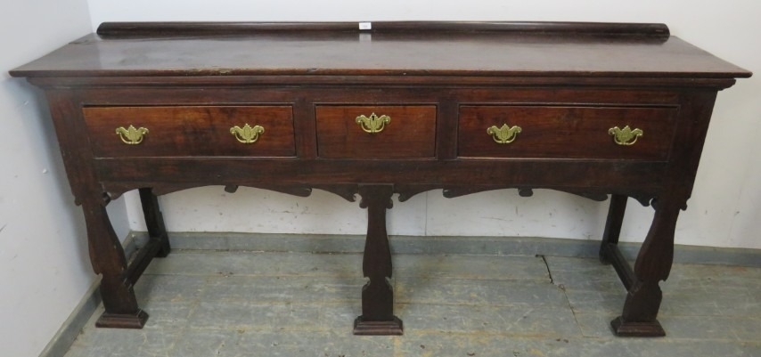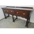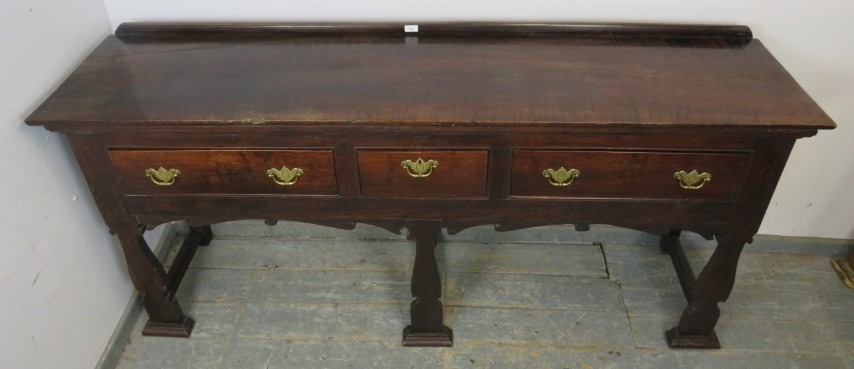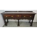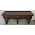 A C1900 mahogany sideboard with three drawers each with brass handles over an ornate six legged support. H95cm x W196cm x D46cm approx.