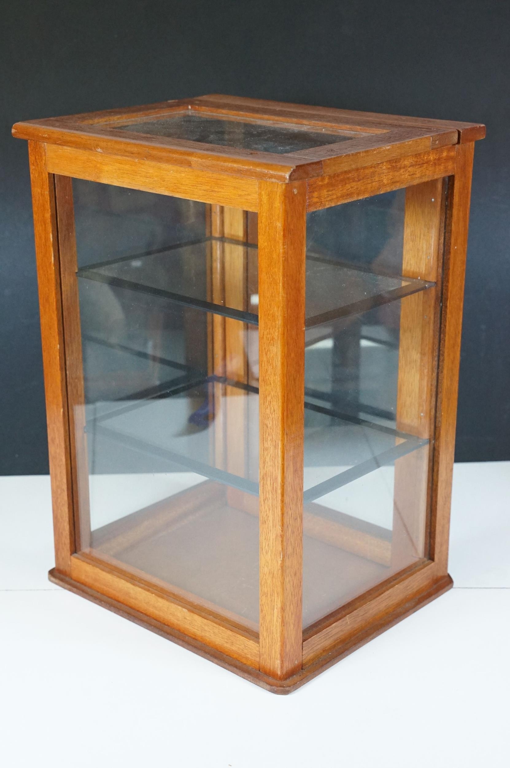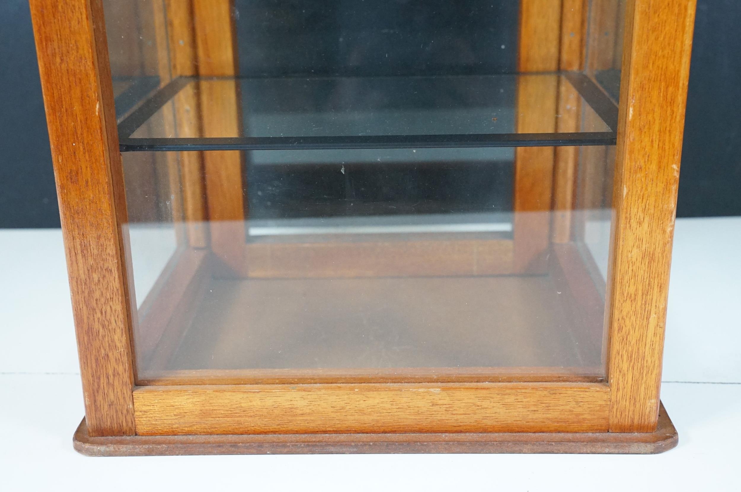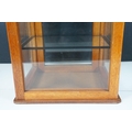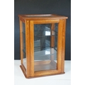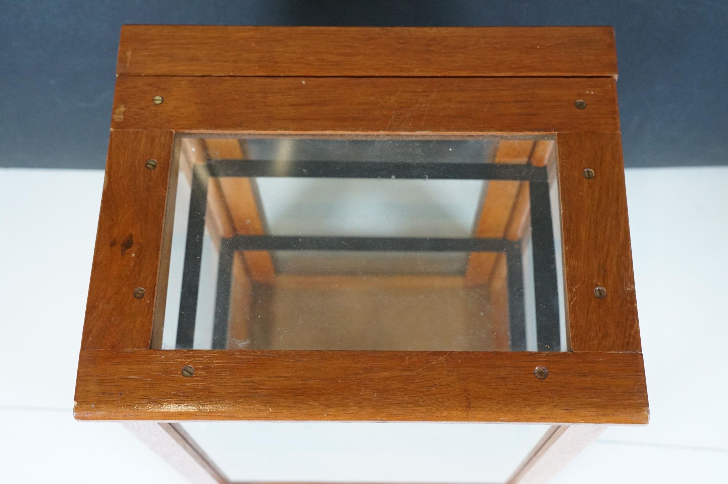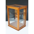 Vintage oak framed table top display cabinet, with glazed top and four sides, slide up door to back opening to two glass shelves, 42cm high x 31cm wide