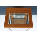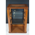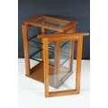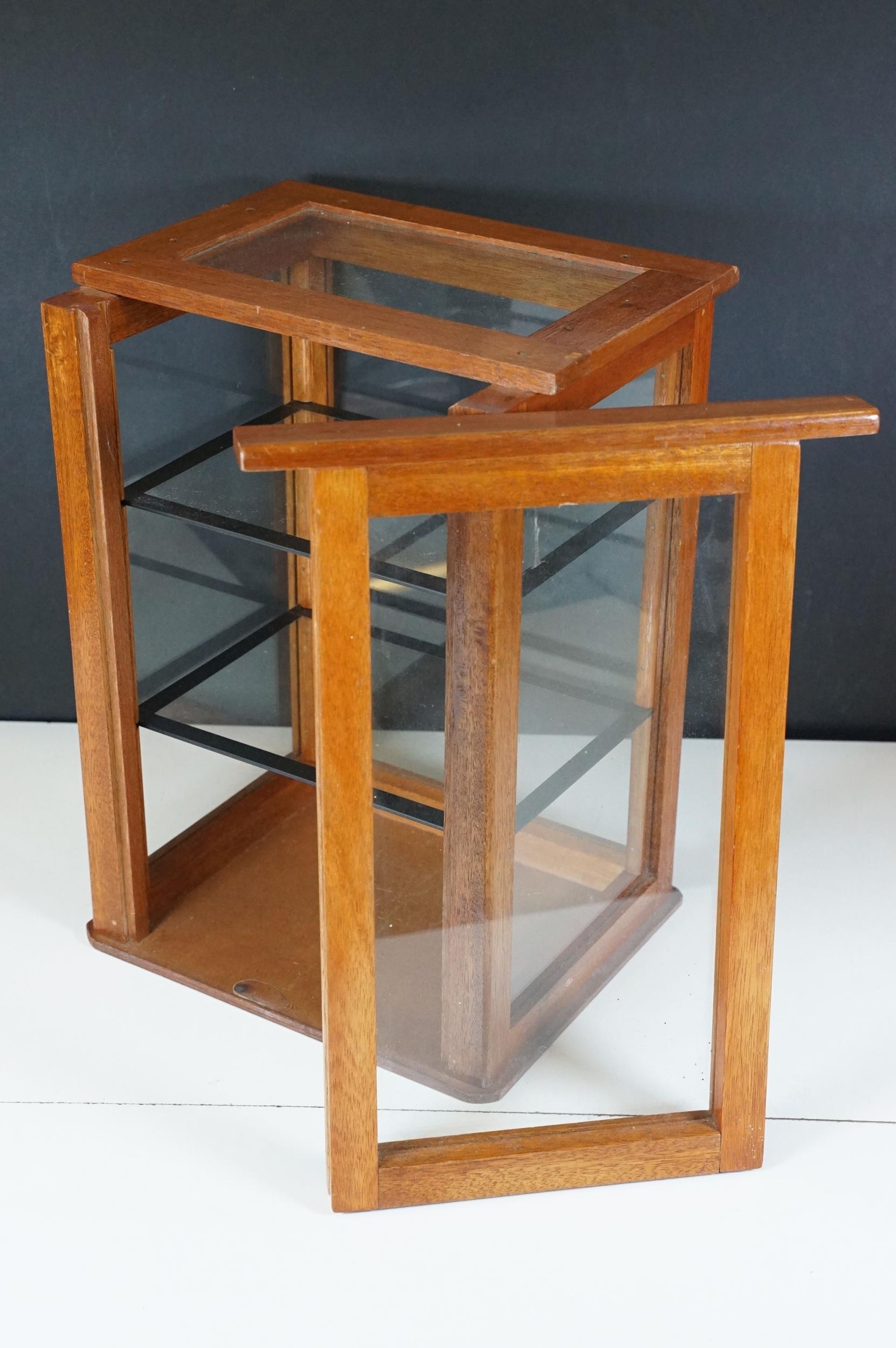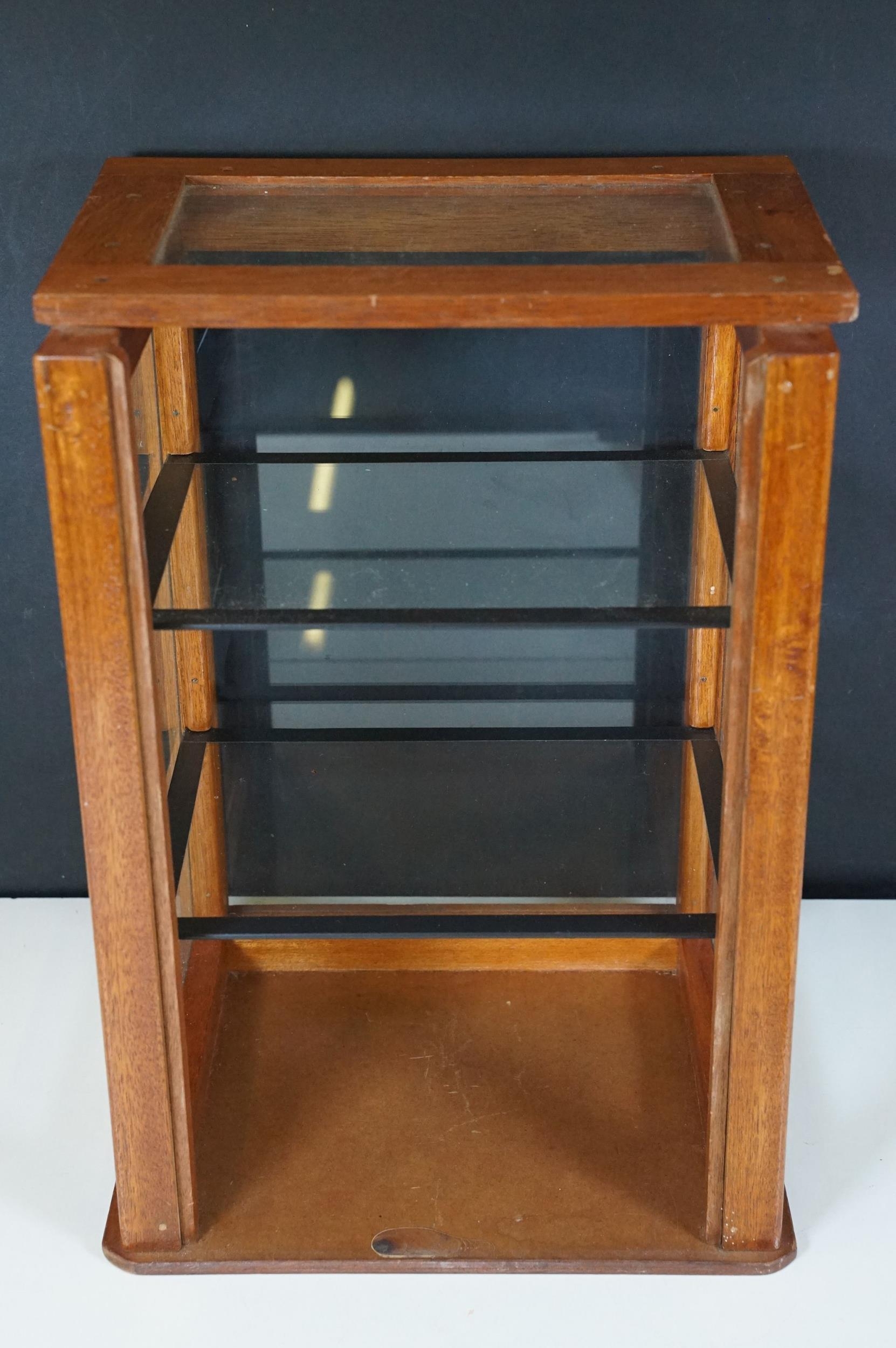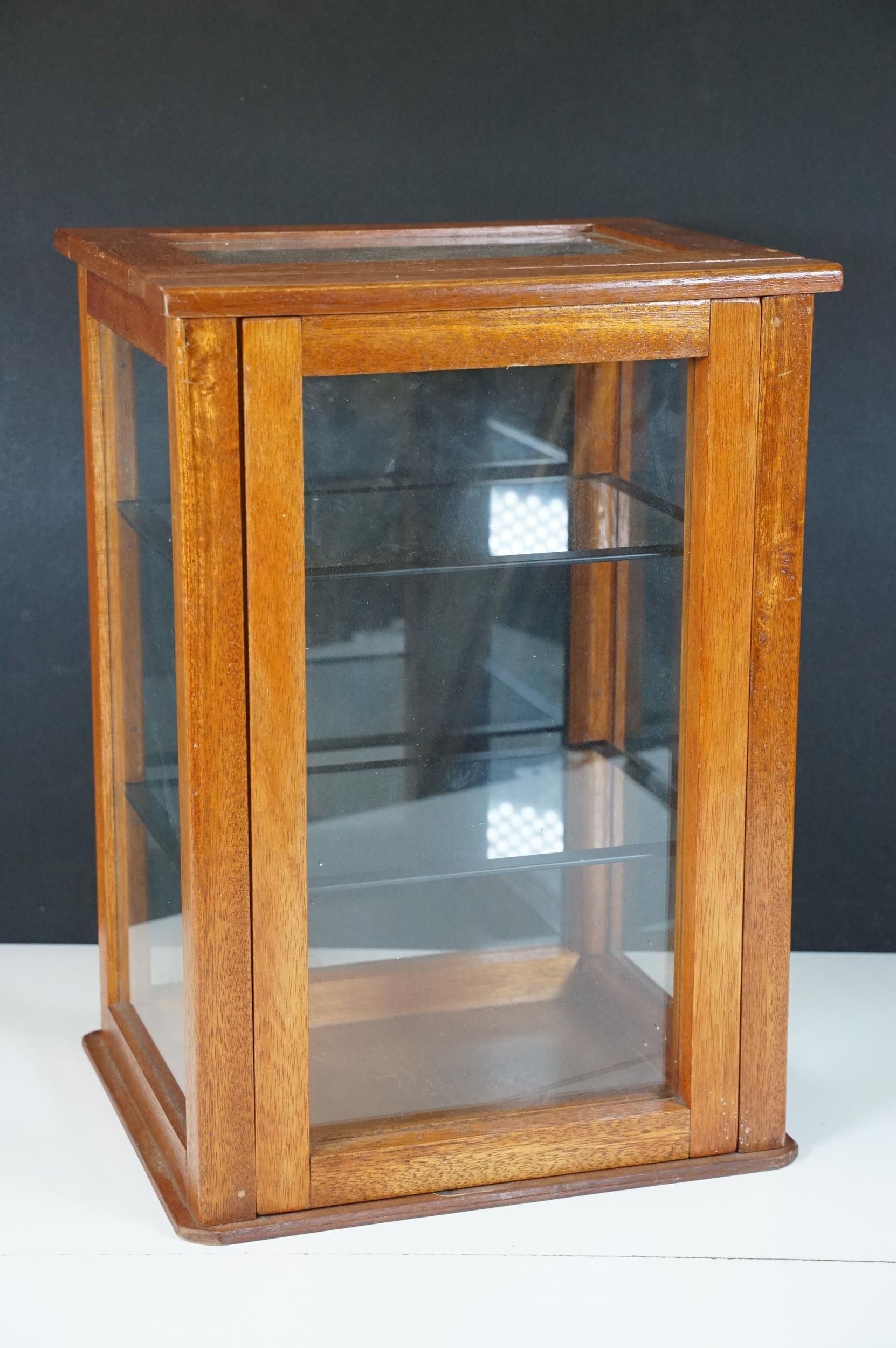 Vintage oak framed table top display cabinet, with glazed top and four sides, slide up door to back opening to two glass shelves, 42cm high x 31cm wide