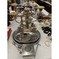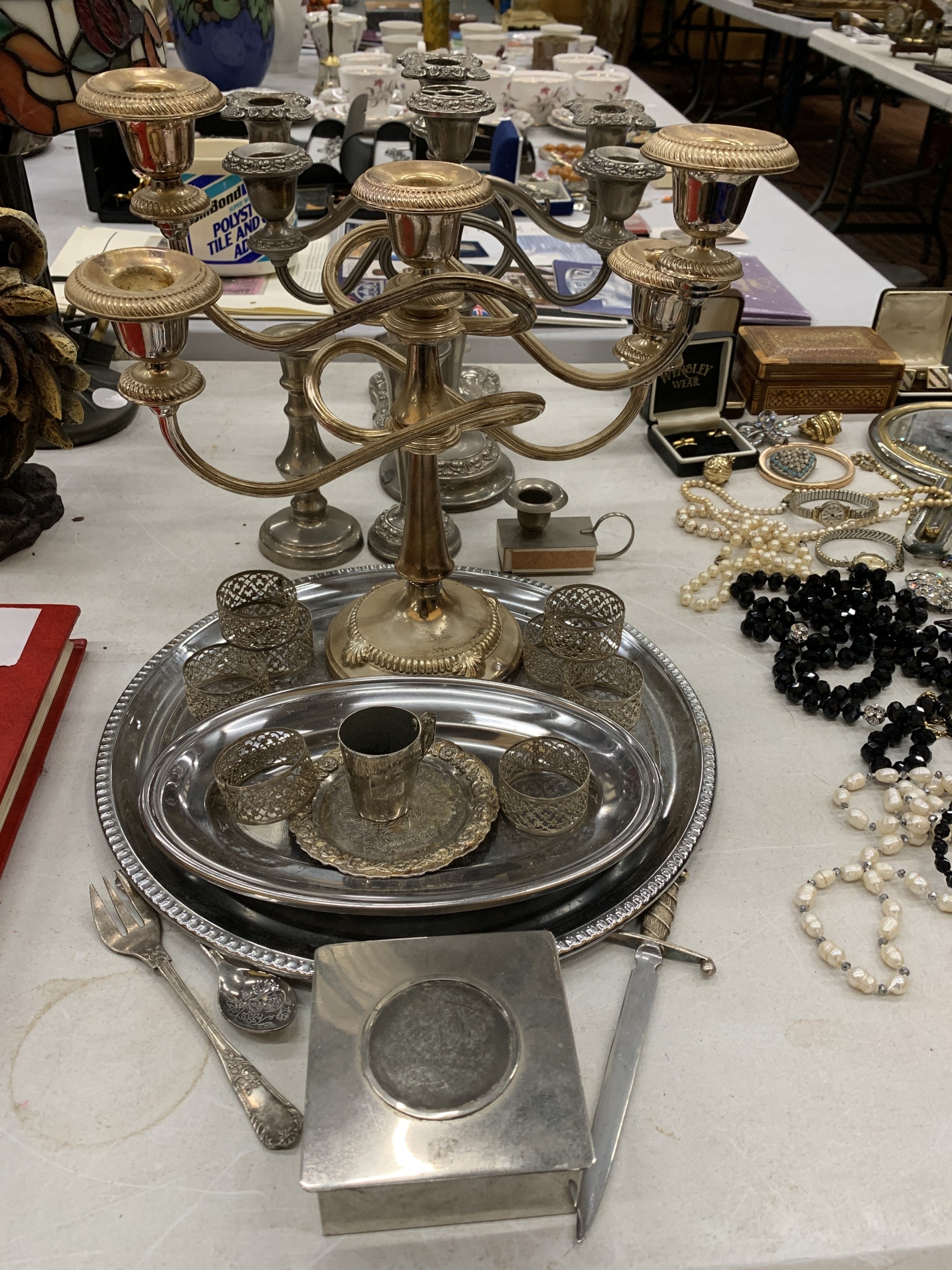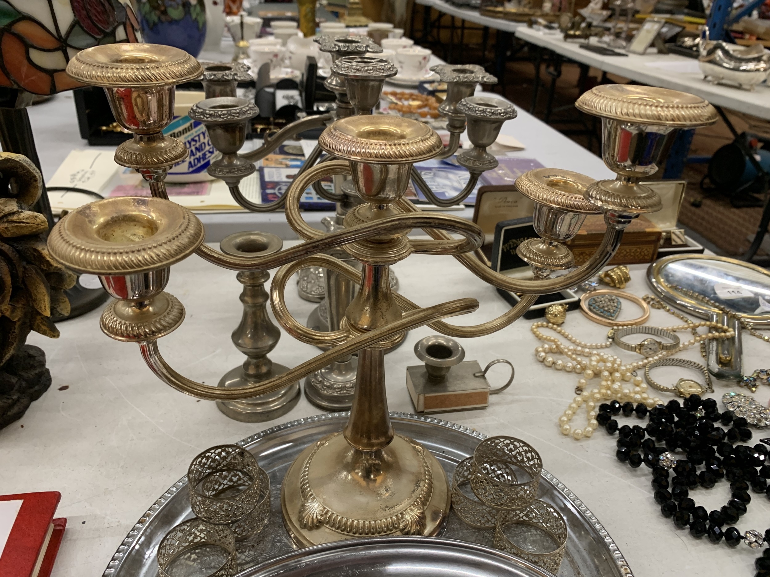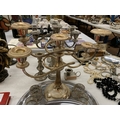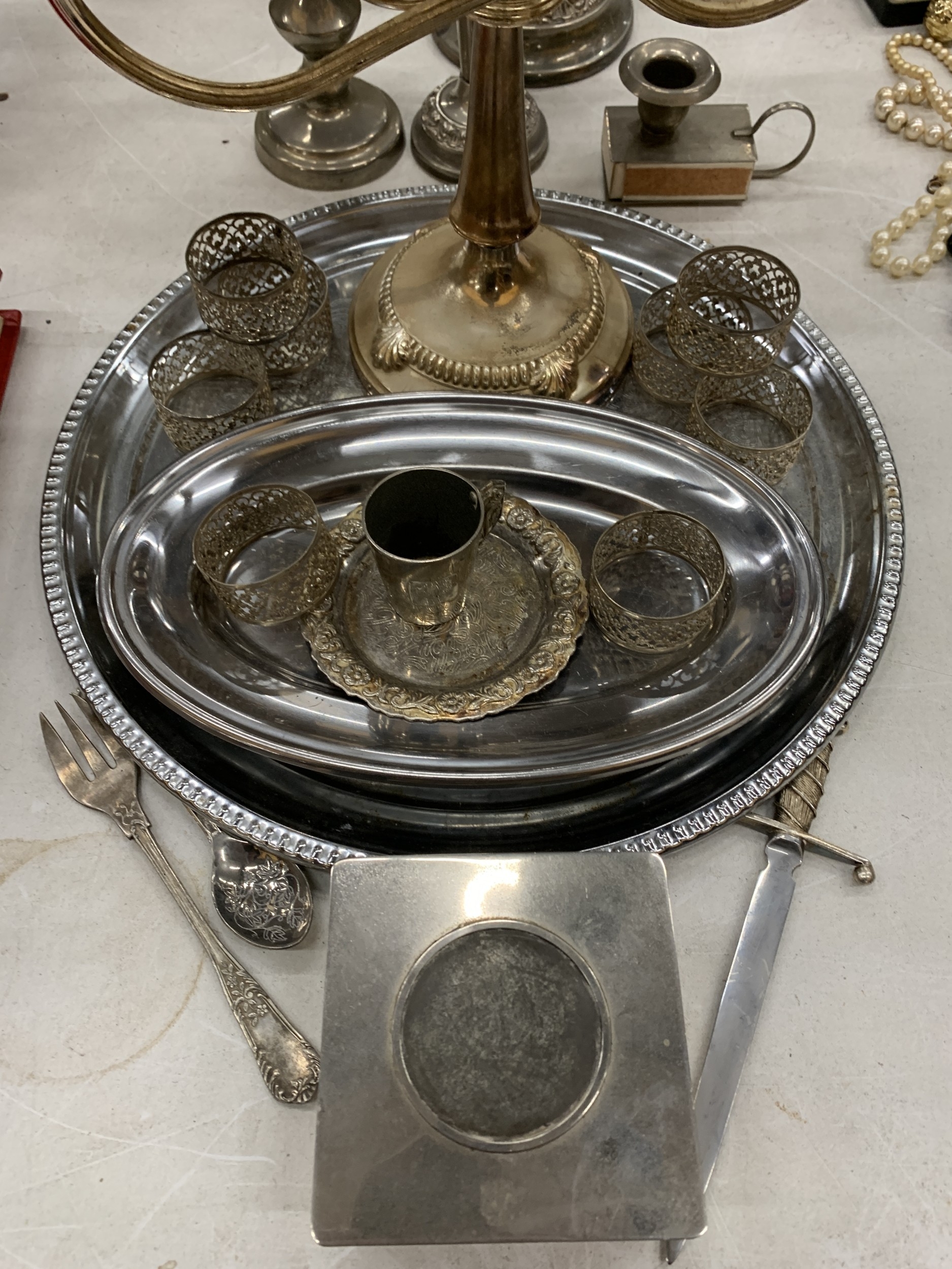 A QUANTITY OF SILVER PLATE TO INCLUDE CANDLARBRA'S, TRAYS, NAPKIN RINGS, ETC.,