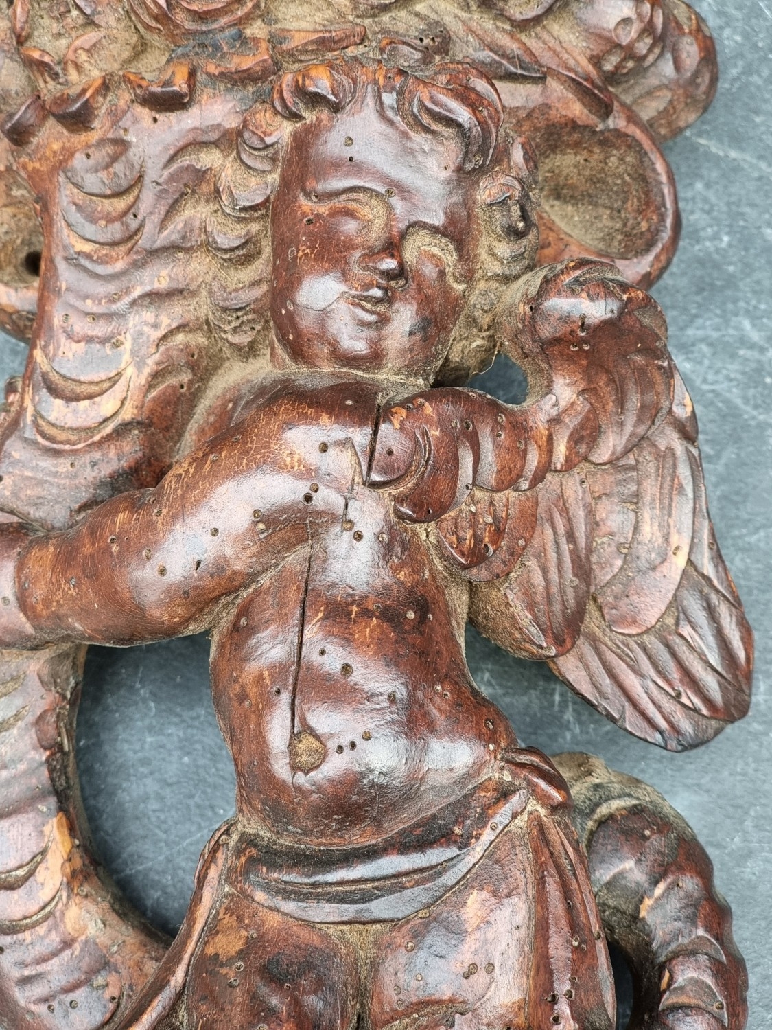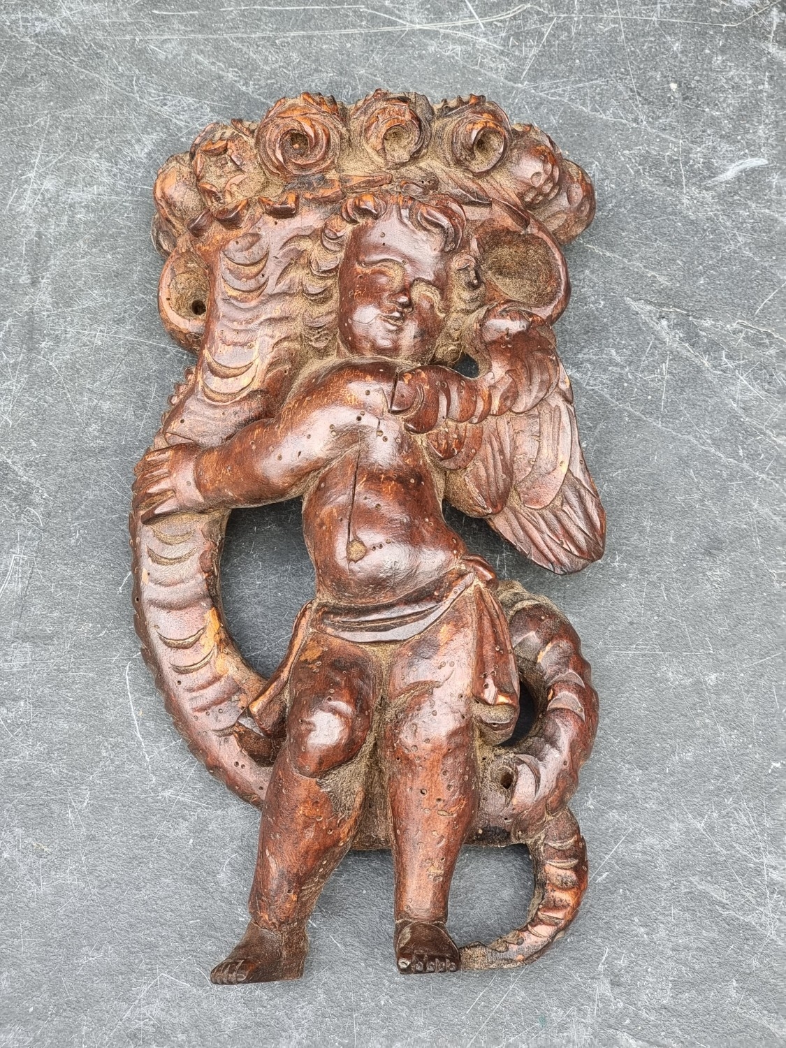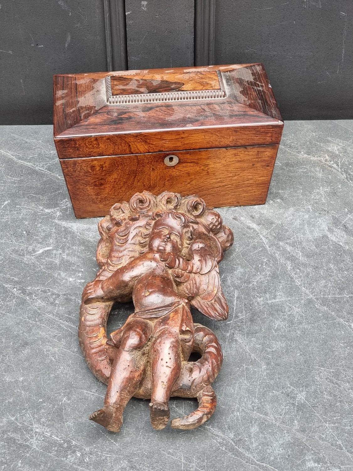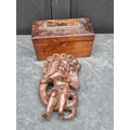 An antique carved softwood cherub bracket, 30cm high, (wormed); together with a 19th century sarcophagus tea caddy, 28cm wide. (2)